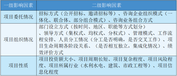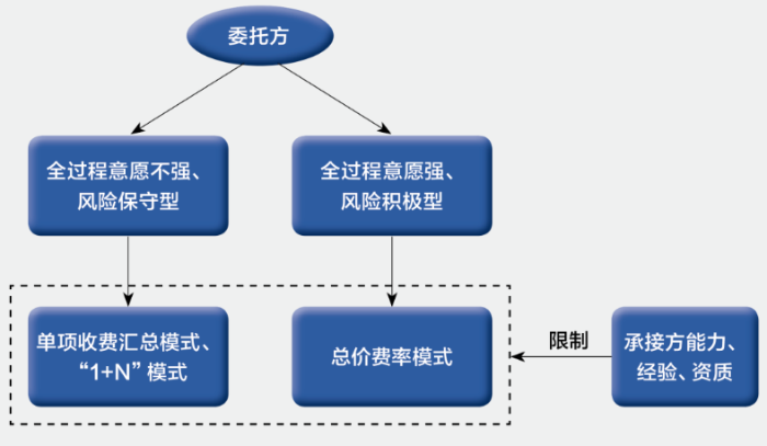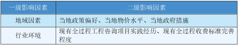 摘要:随着我国基础设施规模逐渐扩大,对效率要求极高的规模化、集群化、复杂化的建设工程大量出现,传统分阶段咨询模式已经不能满足这类项目的需求,全过程工程咨询模式开始进入人们的视野。我国全过程工程咨询服务处于起步阶段,缺乏完善的体系和标准,尤其在酬金计取上缺乏参考依据。本文通过问卷调研、专家打分等形式对全过程工程咨询酬金计取方式影响因素进行研究,识别影响计费方式的重要因素,为全过程工程咨询服务实践中计费模式选取提供参考。 关键词:全过程工程咨询;计费模式;影响因素 全过程工程咨询服务是指由咨询万搏网站为业主提供涵盖工程全业务、全生命周期、全方面的咨询服务方案。全过程工程咨询是从各专项咨询业务基础上发展而来,但并非各阶段工程咨询业务的简单组合,是各环节有机整合,系统性思想贯穿其中,相较于传统咨询模式,具有节约投资成本、缩短项目工期、提高服务质量等优势。 我国目前全过程工程咨询发展仍处于起步阶段,企业推行过程中面临不少困境,其中一个问题就是收费体系的不健全、不完善,计费模式选择缺乏参考依据。目前各企业主要采取单项收费汇总、总价费率、人工工时、“1+N”计费四种收费模式,而具体选择哪一种模式并没有相应的标准,计费问题是咨询项目从委托到落实过程中不可避免的重要问题,针对不同的项目,计费模式的选择不能一概而论,生搬硬套以往经验,最终模式的确定是政策环境、项目实际情况等多种因素综合考量的结果。 计费模式影响因素研究可以识别与计费模式相关联的重要因素,企业实践中能更有针对性地对这些因素进行综合考量,为决策过程提供依据,提高决策的科学性。本文以全过程工程咨询计费选择影响因素为研究对象,通过文献调研、政策分析等形式得到影响全过程工程咨询计费模式选择的8个一级影响因素以及相应的31个二级影响因素,并通过专家打分得到各个因素之间的重要性关系,最后从影响因素视角给出计费模式选择建议,为企业实践提供依据,丰富了全过程工程咨询计费理论研究,为相关政策制定提供一定参考。 一、我国全过程工程咨询服务酬金计取方式影响因素识别 根据文献梳理和相关政策分析,综合考虑全过程工程咨询项目内外部环境,本文从外部环境、项目本身、利益相关者、计费方式四个层面出发,对全过程工程咨询酬金计取方式产生影响的因素进行了分析。 (一)外部环境层面 从外部环境层面来看,对于全过程工程咨询项目,每个地方的政策以及当地政府的支持措施有所不同,可能会影响企业关于酬金计取方式的选择倾向,同时进行具体的费用核算时必须考虑到市场行情和当地的物价水平,对于人工工时这类计费模式更是依赖于各地方发展状况和物价水平。另一方面,从咨询行业来看,目前全过程工程咨询计费模式选择没有统一的标准,企业进行选择要参照行业现有的实践情况,现有各类计费标准的完善程度也是企业决策时的重要依据。 表1 外部环境层面可能影响因素 资料来源:作者根据公开资料整理 (二)项目本身层面 从项目本身层面来看,招标方式、组织模式等项目委托情况可能会对计费模式选择造成影响,公开招标、邀请招标或者总体招标、分阶段招标等招标形式会对交易费用产生影响,企业选择一体化或联合体等组织模式以及选择哪些咨询业务进行外包都可能影响后续的计费模式选择。项目的组织情况例如部门设立的方式、领导方式等会影响整个项目的架构和协调性,是按照职能还是时间进行部门划分,采用集权式或分权式管理,项目人员分工是否存在交叉,项目生命周期各阶段业务之间是否有较高独立性等情况都会影响到整个项目的集成或分散程度,计费模式选择要与项目各方面安排相配合。从项目本身性质来看,不同项目所属行业不同,项目周期以及整个工程面临的复杂程度和风险程度也不同,计费模式选择要能够覆盖项目的投入成本,反映出项目的性质特点,一概而论必然会造成最终费用偏高或偏低等不合理现象发生。 表2 项目层面可能影响因素 资料来源:作者根据公开资料整理 (三)利益相关者层面 从利益相关者角度,选择科学合理的计费模式最终是为了使项目各方的需求得以满足,最大限度保障各方利益。项目委托方是主导者,也是咨询业务的需求者,计费模式要考虑到委托方的需求,参考其以往合作经历,考虑其选择上的偏好。任何选择都需要承担一定的风险,委托方对于风险的态度是保守型、中立型或者积极型以及其风险承担能力都可能影响后续计费方案的选择。总价费率、单项收费汇总等不同酬金计取方式在实施上可能遇到的困难难以预知,承接方作为咨询服务的提供者,要考虑其资质和能力水平尽量挑选其有把握有经验的计费模式,尽可能使风险最小化。 表3 利益相关者层面可能影响因素 资料来源:作者根据公开资料整理 (四)计费模型本身层面 单项收费汇总、总价费率、人工工时费、“1+N”计费几种计费模式的特点各不相同,单项收费汇总模式目前采用较多,该模式是从传统的分阶段收费模式演变而来,适合全过程咨询经验不足的企业在过渡期使用,造价咨询、勘察设计等各阶段的收费也有现有的标准可以参考,但实施过程中容易出现各项业务拼凑,不利于全过程工程咨询服务模式推广。“1+N”计