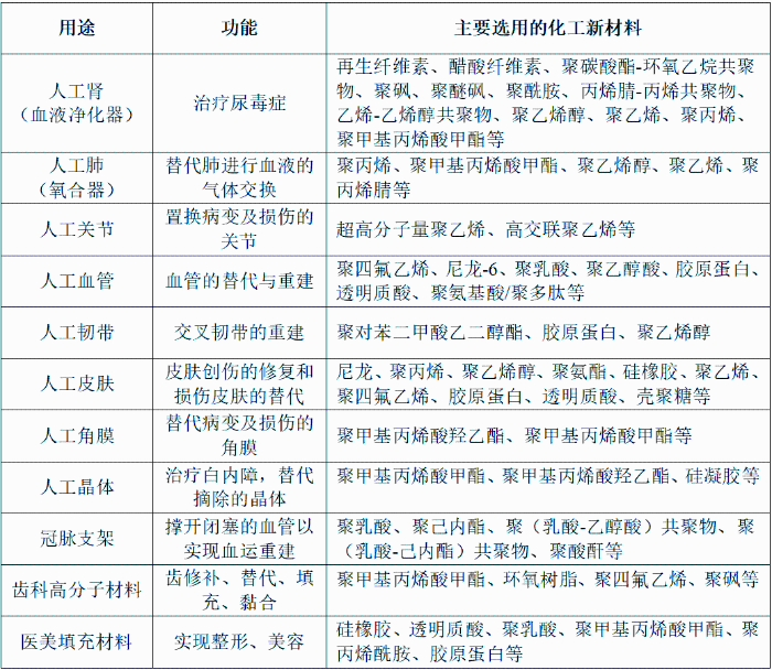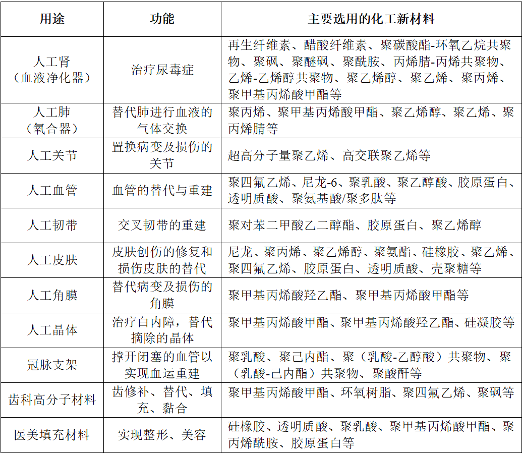 生物医药领域用化工新材料发展趋势研究 申传龙 刘文胜 齐景丽 摘要:生物医药产业是关系国计民生和国家安全的战略性新兴产业。化工新材料在药品、生物制品、医疗器械等生物医药产品制造多个关键环节发挥着不可替代的作用,是支撑生物医药产业高质量发展的核心基础之一。当前,全球生物医药产业规模持续扩大,我国已初步形成较为完整的产业体系,但仍存在部分关键材料高度依赖进口的问题,制约了产业自主可控能力和供应链安全。为突破这一瓶颈,必须坚持“以应用为导向”的研发创新模式,构建“产学研用”深度融合的协同创新体系,重点突破关键材料技术瓶颈,加快推进国产化替代进程,努力实现该领域自主可控,为生物医药产业的高质量发展提供坚实保障。 一、发展生物医药领域化工新材料的重要意义 生物医药领域材料广义上包含药品、生物制品、医疗器械等生物医药产品本身及其生产加工过程中所用到的所有材料,涵盖生产设备及其零部件、原辅料、包装材料等。按成分可分为高分子材料(化工新材料)、金属材料、无机非金属材料、复合材料。 生物医药领域化工新材料是生物医药产业与高分子材料产业交叉融合的高阶产业,具有技术密集、附加值高、产业关联度强等特点,同时也是该领域应用最广泛的一类材料,约占该领域市场规模总量的三分之一。在政策支持、技术革新、人口老龄化、医疗消费升级等因素的驱动下,我国生物医药领域化工新材料市场规模将持续保持高速增长。发展生物医药领域化工新材料产业,对提升国家医疗健康水平、保障产业链供应链安全、推动经济高质量发展具有重大战略意义。 (一)构建健康中国的核心支撑 随着人口老龄化加剧和健康意识提升,心脑血管疾病、肿瘤、糖尿病等慢性病发病率持续上升,对生物医药领域高端化工新材料的需求日益增长。研发和推广具有优异生物相容性、功能性以及可定制化的高端化工新材料,不仅有助于提升疾病预防、诊断和治疗水平,还能降低医疗成本,显著改善患者生活质量。这既是应对重大公共卫生挑战的关键举措,也是实现“健康中国2030”战略目标的重要支撑。 (二)筑牢产业链安全的战略屏障 我国生物医药领域高端化工新材料进口依赖度高达60%以上,关键材料如医用级超高分子量聚乙烯(UHMWPE)、环烯烃共聚物(COC)、聚乳酸(PLA)、色谱填料专用树脂、生物反应器膜材等严重依赖进口。发展自主可控的生物医药领域化工新材料,是应对国际供应链波动、提升产业韧性的必然要求。特别是在公共卫生事件频发的背景下,保障医用材料供应已成为国家安全的重要组成部分。 (三)驱动经济高质量发展的新引擎 生物医药领域化工新材料产业是化工行业转型升级的重要引擎。发展该领域新材料,可推动上游石化原料向下游高附加值功能高分子材料及高端生物医药产品延伸转化,形成新的经济增长点。同时,材料创新也将推动药品、生物制品、医疗器械制造及健康服务等关联产业升级,助力经济结构优化与高质量发展。 (四)抢占全球科技制高点的关键领域 生物医药领域化工新材料是多学科交叉的典型领域,融合化学、物理、材料、生物、医学、药学等多个学科。加强该领域的技术攻关,不仅能够推动材料科学自身进步,还能带动相关装备制造、工艺技术、标准体系的整体提升,建立涵盖材料性能、生物安全性、临床评价的全链条标准体系,增强我国在全球生物医药产业中的话语权和竞争力。 二、生物医药领域化工新材料重点应用领域和产品发展现状 (一)重点应用领域 1.高值医用耗材领域 高值医用耗材是指那些对使用安全具有极高要求、生产和使用必须严格控制、仅限于特定专科使用且价格相对较高的消耗性医疗器械,主要包括心脏介入、外周血管介入、人工关节以及其他脏器介入治疗替代等医用材料。 (1)血管介入器械 血管介入器械是指在医学影像设备的导引下,通过穿刺针、导丝、导管等工具,经血管途径对心血管、脑血管和外周血管修复或替换治疗的医疗器械,这类器械广泛应用于冠脉介入、外周血管介入及神经介入等领域。我国血管介入器械行业市场规模已达600亿元,其中心血管介入器械占比高达85%,成为市场的主要驱动力。 (2)骨科植入物 骨科植入物是指用于骨骼替代、支撑、修补和填充的临床骨科医疗材料。随着我国人口基数庞大及老龄化加剧,骨科耗材需求持续增长。当前我国骨科植入医疗器械市场规模约为300亿元,预计未来5年将保持约15%的复合增长率。 图1 骨科植入材料 (3)血液净化耗材 血液透析是急慢性肾衰竭、终末期肾病(尿毒症)患者的最主要治疗方式,通过透析机以及透析器、透析液(粉)等医疗器械,辅助或替代患者肾脏的部分功能,帮助清除体内的代谢废物和多余水分。在血液净化耗材中,血液透析膜是最为广泛应用的核心耗材,其性能直接影响透析效果和患者安全性。目前,我国血液透析市场规模约为300亿元。 图2 血液透析膜及聚醚砜原料 (4)眼科耗材 产品主要包括人工晶状体、人工视网膜、人工玻璃体、人工泪管、人工角膜以及硬性角膜接触镜等。眼科耗材对材料性能和加工技术的精细化程度要求极高,直接关系到产品的生物相容性、光学性能和机械强度等关键指标。目前,我国眼科高值医用耗材市场规模约为120亿元,且随着
