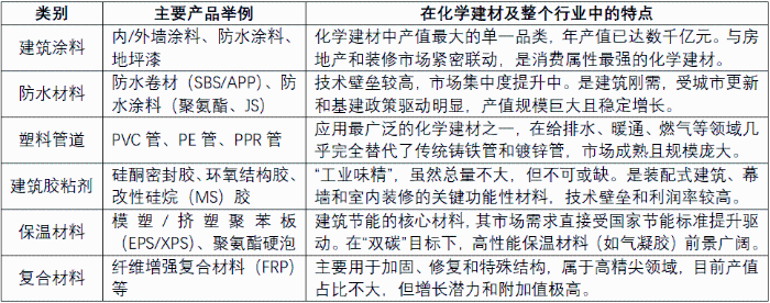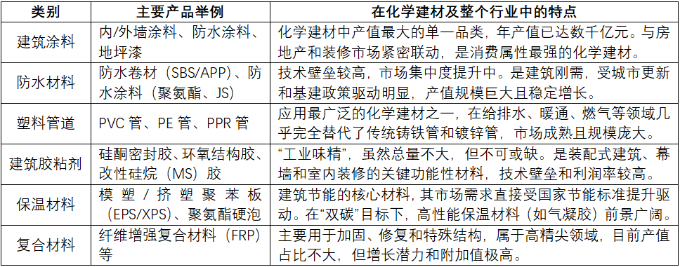 建筑领域用化工新材料发展趋势研究 霍正元 齐景丽 袁霞光 2025年4月,财政部、住房和城乡建设部联合发布《关于开展2025年度中央财政支持实施城市更新行动的通知》(财办建〔2025〕11号,以下简称《通知》),明确将消费型基础设施建设列为重点支持领域。通过竞争性选拔机制,给予20个重点城市实施最高12亿元的定额补助,重点支持基础设施更新及消费型场景建设。 2025年7月召开的中央城市工作会议提出,我国城镇化已由高速增长阶段转入稳定发展期,城市发展规模正从增量扩张转向存量提质增效。会议首次将“推进城市更新”纳入国家战略体系,明确要求“高质量开展城市更新”,标志着城市更新工作进入系统化推进新阶段。 城市发展逻辑的历史性转变,标志着建筑材料行业迎来“存量提质增效”的重要战略机遇期。化工新材料凭借其在高性能、功能化、环境友好等方面的显著优势,已成为推动城市更新和产业升级的核心驱动力。作为化学工业、材料科学与建筑学等多学科交叉融合的前沿领域,化工新材料正在建筑领域发挥着越来越重要的作用。它们不仅从根本上改变了建筑设计理念和建造方式,更推动建筑从传统“遮蔽所”向“智能生命体”的转型升级。同时,在环保政策的驱动下,绿色建筑和可持续建筑发展驶入快车道,化工新材料在建筑领域的环保和可持续应用价值日益凸显,为行业注入了新的活力和方向。 本研究系统梳理建筑行业用化工新材料(新型化学建材)的产业现状、技术发展趋势及重点品种,针对行业发展痛点,提出产业升级路径,为推动行业高质量发展提供科学决策参考。 一、发展新型化学建材的必要性 (一)保障国家战略安全与实现可持续发展的必然选择 推动低碳建筑体系构建,助力能源结构转型。建筑领域是我国能耗和碳排放的主要来源,发展气凝胶等高性能保温隔热材料、相变储能材料以及光伏建筑一体化(BIPV)高分子材料,能够显著降低建筑运行能耗,为国家能源结构调整和“双碳”战略目标的实现提供重要支撑。 打造循环建筑生态,实现资源永续利用。传统建筑业对砂石、水泥等自然资源消耗巨大,而发展生物基建材、建筑废弃物高值化化学回收技术,可将工业废料、生物质及大气中的二氧化碳转化为建筑资源,为“无废城市”建设奠定物质和技术基础。 (二)驱动建筑行业现代化与产业价值提升的核心引擎 推动建筑业从“建造”向“智造”转型。以3D打印装配式建筑材料、高性能复合模板、快速固化结构胶等为代表的化工新材料,正引领建筑产业从传统建造向智能建造模式的范式跃迁。为解决传统建造模式高能耗、低效率的难题提供了系统性解决方案。 赋能建筑功能从“遮蔽空间”向“智能生命体”跃迁。当前,主流化学建材可进一步细分为建筑塑料、建筑涂料、防水材料、密封材料、隔热保温材料等。随着温致变色有机玻璃、应力传感涂层、空气净化内墙等智能材料的突破,让建筑具备了温度自调节、结构自诊断、空气自净化等功能,显著提升建筑的使用价值和用户体验。这不仅催生了智能运维、环境服务等新兴市场,更推动行业从 “施工总包”向“产品+服务”的高附加值模式转型,为建筑产业价值链的重塑注入持续动能。 (三)构建未来竞争优势与科技自立自强的重要抓手 新型化学建材已成为多学科交叉的创新前沿。建筑业作为多学科交叉融合的天然试验场,通过材料科学、人工智能、生命科学等领域的深度协同,不仅加速推动基础学科突破性发展,更催生出了4D打印建筑构件等颠覆性技术,为国家抢占未来科技战略高地提供了关键机遇。 打造“数字-材料”融合的创新范式。通过整合建筑信息模型(BIM)与材料基因工程技术,可实现新材料的按需设计、性能模拟和全生命周期数字化管理。数字孪生技术与化工新材料的深度融合,标志着新质生产力在建筑领域的率先突破。这不仅构建了技术标准体系与知识产权布局的新高地,还将技术优势转化为市场主导权,助力我国在全球建筑领域技术话语权与规则制定权的全面提升。 二、我国新型化学建材产业现状和发展趋势 (一)建筑材料产业整体规模保持稳中有增发展态势 根据万科集团旗下采筑国际有限万搏网站(中国领先的建材供应链平台)发布的行业研究报告显示,2024年全球建材行业市场规模为1.4万亿美元,预计2024-2027年间,行业将保持3%~5%的年均复合增长率。随着全球经济周期调节,2027年后行业将进入新一轮高速增长期,预计2032年市场规模将突破3.52万亿美元。亚太地区持续保持全球最大建材市场地位,其中中国、印度、澳洲及东南亚地区是市场消费核心区域。 我国是全球最大的建材生产和消费国,建筑材料市场规模大、品种多。根据中国建筑材料联合会数据显示,2024年我国建材行业全社会产值接近7万亿元,其中以化学建材为核心的新型建筑材料市场规模达2.0662万亿元,涵盖新型防水密封材料、新型墙体材料、新型保温隔热材料及新型装饰装修材料等多个细分领域,产值占比接近30%。尽管规模以上建材企业营业收入和利润总额持续增长,但行业增速已进入平台期,而新型建材板块已成为增速最快、最具发展潜力的细分领域。 表1 新型化学建材主要类别和市场特点 (二)国家政策引导为新型化学建材开拓了新增市场 政策红利为新型化学建材开辟了新的市场增