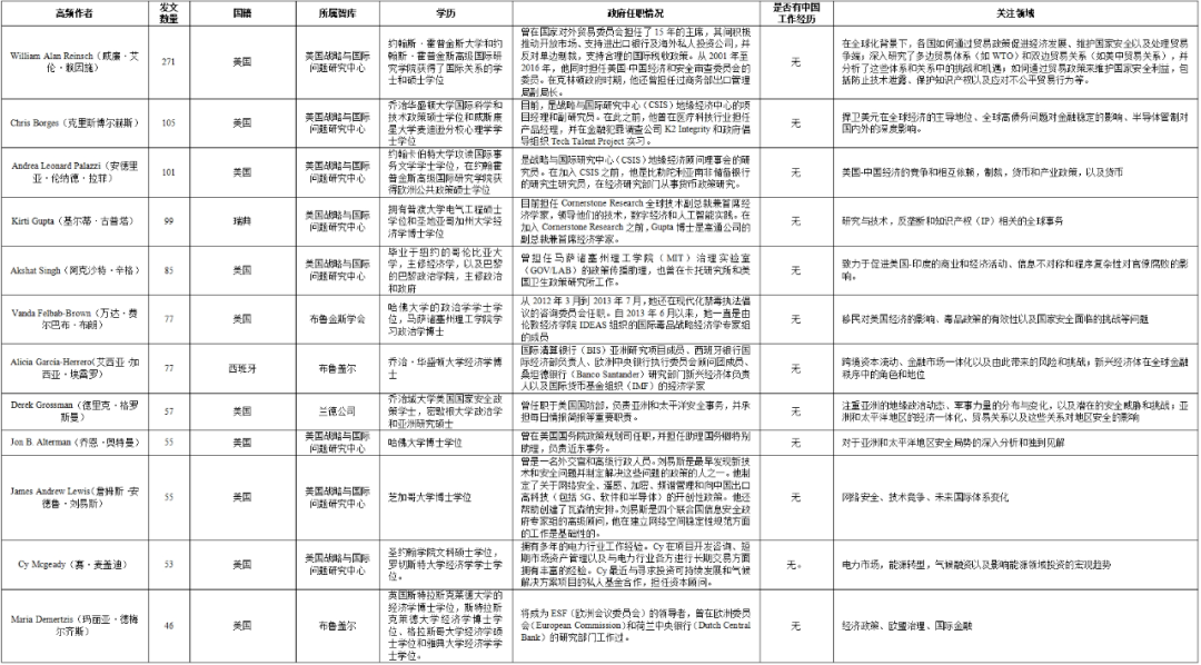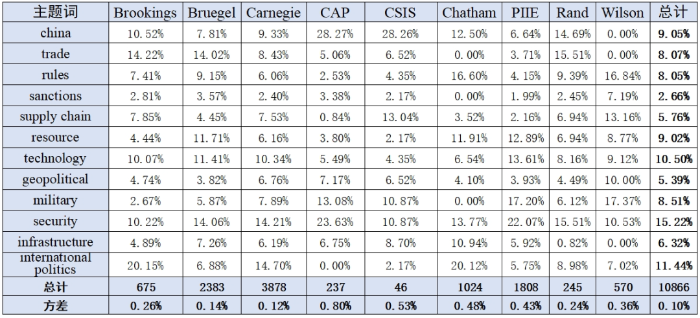 2024年美欧高端智库报告分析(上篇) ——基于10866篇报告的大数据分析 王一童 柴亚超 童天乐 一、研究背景 2024年上半年,全球政治经济局势总体稳定。各地区经济稳步复苏,制造业景气度提高,通胀水平下降,贸易明显回升,新技术的引入推动世界经济和社会的深刻变革。当前形势下,及时准确把握、分析和研判美国、欧洲等发达地区国家政治动向和社会舆论,具有重要意义。美欧智库发展历史悠久,关注领域广泛,在研究成果数量和影响力方面处于世界领先地位,其发布的观点、分析和评论也成为了当下了解美欧国家政府内部认知和社会公共舆论的一扇重要窗口。 2022年以来,中咨万搏网站持续跟踪美欧智库研究动向,对美欧智库全量报告文本进行大数据分析,本报告属于美欧智库成果大数据研究系列。希望能使相关部门更全面了解美欧国家对国际政治、经济贸易、中国发展等关键领域的认知情况,以助力我国政府决策部门及时判断和预测美欧国家对我国的政策战略计划,结合国内实际情况制定应对策略,提升我国信息情报领域的决策参考服务水平,在国际社会中更好地树立和提升中国话语权。 二、样本选取 研究样本选取美国布鲁金斯学会(Brookings)、美国卡内基国际和平基金会(Carnegie)、比利时布鲁盖尔研究所(Bruegel)、美国战略与国际问题研究中心(CSIS)、英国皇家国际事务研究所(Chatham)、美国兰德万搏网站(Rand)、美国彼得森国际经济研究所(PIIE)、威尔逊中心(Wilson)和美国进步中心(CAP)等9家智库。 样本报告涵盖中国、产业链、芯片、气候、债务、脱钩、矿物、资源、俄罗斯、半导体、台湾、技术等相关领域的研究报告,共计10866篇。 三、文本数据分析 (一)各智库关注领域 2024年上半年,各欧美智库与安全、科技、国际政治等主题相关的报告占比在五分之二左右,与中国、资源、制裁等主题相关的报告占比在五分之一左右,与贸易、规则、军事、地缘政治等主题相关的报告约占五分之一,与基础设施建设、供应链等主题相关的报告约占五分之一。不同主题下智库关注的重点领域分析参见附件1。 1.威尔逊中心:国际政治和规则 威尔逊中心注重国际政治问题和规则方面的研究。根据威尔逊中心的分析,目前在国际政治的深层次问题上,俄罗斯和中国都对现有规则不满意,试图通过改变现有的国际规则来实现自己的利益,以建立一个更符合他们利益的多极国际体系。例如,中俄两国通过团结第三世界国家来对布雷顿森林机构进行改革,包括重新分配国际货币基金组织的配额,以使投票权与每个国家相对经济实力成正比。以巴西为代表的发展中国家也表示,当前国际金融机构的改革不足,将推动发展中国家转向中国发起的具有重要影响力的机构,如亚洲基础设施投资银行等。威尔逊中心认为,在国际规则塑造的研究中,稳定的世界秩序平衡需要依赖获得全球共同认可的规范、规则和法律的建立。美国为代表的西方国家明确宣布在印太地区建立致力于维护符合自身发展的国际秩序,并通过排斥敌对国家来进行维护合作伙伴关系和实现共同的愿景。然而,中俄两国的影响力和中国的共建“一带一路”倡议使得西方塑造的国际规范逐渐黯然失色,这将会使得全球进入多方博弈的复杂局面。 2.布鲁金斯学会:安全和贸易 布鲁金斯学会的研究领域较为广泛,其研究相对侧重国家安全和贸易方面。布鲁金斯学会认为过去几十年,传统产业政策在国际层面很大程度上不再流行,但供应链和国家安全问题推动了大型经济体迅速实施新型产业政策,包括关税、补贴和税收优惠等有针对性的干预措施,这些措施旨在加强特定行业(供应链)的安全性,包括汽车、医疗设备和信息技术(IT)等供应链。由于美国与中国的地缘政治竞争加剧,使得美国与盟友达成相关贸易协议变得重要,“为了与中国竞争,美国应该摆出真正的贸易协议让盟友受益。”布鲁金斯学会通过对全球贸易问题的大量分析,提出“全球贸易的发展对经济增长和国际合作至关重要”的观点。贸易自由化和全球化促进了经济增长、创造了就业机会,并为解决全球挑战和冲突提供了和平的合作途径。然而贸易也面临着诸如贸易平衡、保护主义和环境问题等挑战,政策制定者需要确保贸易的可持续发展和公平性。当前,中俄两国和全球南方国家的经济贸易,尤其是能源贸易一直保持强劲,显示了全球很大一部分地区对国际制裁的普遍不支持。而美国在天然气领域控制欧洲市场后,通过投入资金迭代自身页岩气开采技术,待成本下降后才能逐步解除对俄罗斯等国的能源制裁。 3.布鲁盖尔研究所:国际政治和贸易 布鲁盖尔研究所的关注重点是国际政治和贸易问题。在国际政治领域,布鲁盖尔研究所对欧盟的国际政治有了不同的看法,包括其在全球秩序中的利益和地位。当前,欧盟开始更广泛地参与其他国家的内部战争和人道主义危机,这是为了进一步摆脱美国对欧洲深层次的影响。在贸易问题上,布鲁盖尔研究所指出中国正在利用先进技术和供应链的优势,挑战西方国家在全球经济中的地位,并对全球政治格局产生影响。在颠覆性技术方面,从绿色科技和电池到半导体,从人工智能到量子计算,这些给西方企业带来了不确定性,他们面临着被中国等新兴国家取代的风险。与此同时,中国的产业政策可能导致相关行业产能过剩,增加出口倾