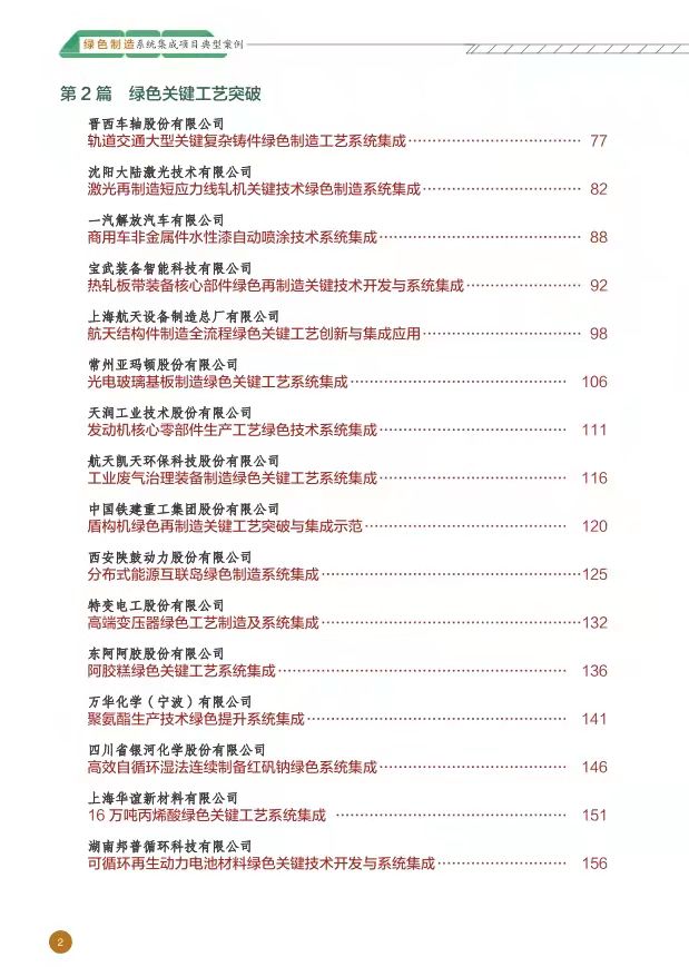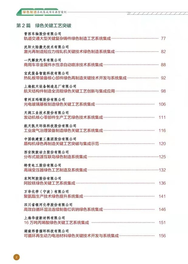 三、重点内容 本书围绕绿色设计平台建设、绿色关键工艺突破、绿色供应链系统构建3个重点方向,全面展现典型案例的绿色制造技术亮点、绿色制造核心价值和行业推广应用前景,为相关行业和企业提供借鉴和参考。 打造了一批创新服务模式的绿色设计平台。重点推动绿色设计信息数据库、绿色设计评价工具和平台等建设,在联合体内实现绿色设计资源共建共享,以产品绿色设计升级拉动绿色设计和绿色工艺技术一体化提升,同时实现绿色精益生产能力的提升。 突破了一批制约行业发展的绿色关键技术。聚焦高技术含量、高可靠性要求、高附加值特性的关键工艺和装备,通过绿色制造关键工艺和装备的创新应用,解决关键工艺流程或工序环节绿色化程度不高的问题,提升重大装备自主保障能力,攻克制约行业发展的绿色关键技术。 构建了一批典型绿色供应链管理模式。支持联合体制定绿色供应链标准,应用模块化、集成化、智能化的绿色产品和装备,共同应用全生命周期资源环境数据收集、分析及评价系统,构建行业绿色供应链管理模式和实施路径。