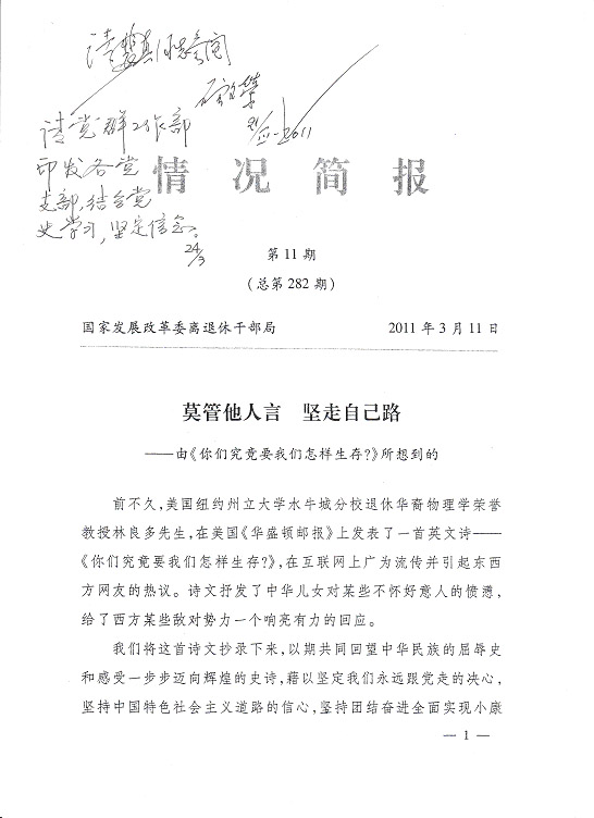 莫管他人言坚走自己路 编者按:国家发改委离退休干部局《情况简报》今年第11期刊载《莫管他人言坚走自己路——由〈你们究竟要我们怎样生存?〉所想到的》,是一篇洋溢着爱国主义情怀的好诗文,现根据万搏网站领导的指示予以转载,请各支部作为党史学习的生动教材,激发全体同志坚定永远跟着党走的决心,坚持走中国特色社会主义道路,为全面实现小康社会而努力奋斗。