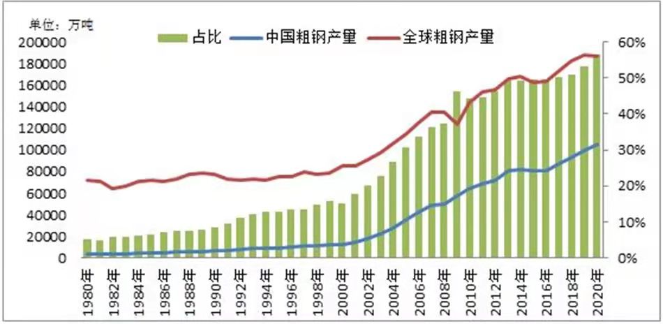 高 质 量 发 展 是 关 键 ——钢铁工业与经济发展的几点思考 陈子琦 一、对钢铁工业的基本认识 从世界范围看,钢铁行业是仅次于石油天然气的第二大行业,全球钢铁行业产值约一万多亿美元。中国拥有世界上唯一门类齐全、结构完整的钢铁工业体系,拥有采矿、选矿、烧结(球团)、焦化、炼铁、炼钢、轧钢、金属制品、炭素、铁合金辅料等全部流程,以及勘探、设计、施工、科研等机构。钢铁工业是国民经济重要基础产业,为经济社会发展和国防建设做出了重要贡献。同时,也是工业门类中的大行业,具有资源和资本密集、产业关联度高、经济社会影响大等特点。2010年前,我国钢铁工业增加值约占全国GDP的4%,产值约占全国工业的9%,在全国工业排序中仅次于交通运输设备制造业和化学工业,近年来排序略有下降,列第四位。国家统计局数据显示,2020年我国粗钢产量10.65亿吨,这在人类历史上是空前的,占世界粗钢产量的56.7%。 从钢铁工业基本面看,我国是世界钢铁大国,距钢铁强国并不遥远,是全国工业中少数接近国际先进水平的行业。我国有10亿吨级的粗钢消费量,钢铁工业有大量先进的钢铁生产装备,重点企业装备达到国际先进水平。沿海布局取得明显进展,拥有世界上30多年来新建的沿海千万吨级钢铁大厂。钢铁工业技术进步持续推进,技术经济指标得到改善,产品档次质量逐步提高,支撑了我国经济社会发展,部分钢铁产品具有较强国际竞争力。此外,在节能减排、环境保护等绿色发展等方面也取得较大进展。 二、关于钢铁工业与经济发展的几点思考 (一)钢铁工业满足了国民经济和国防建设需要 2020年,我国消费钢材高达10亿吨级(折粗钢),约占全世界需求量的56%,其中绝大部分为自主供应,国内钢材自给率达105.7%,国产钢材市场占有率达98.6%,进口钢材市场占有率不足2%。同时,国产钢材品种质量明显改善,有力支持了高速铁路、南水北调、西气东输、奥运工程等国家重大工程和重点项目,基本满足了建筑业、制造业、新兴产业发展以及国防建设需要。应该看到,我国这么大的钢材需求量主要依靠进口是绝对不可能的,没有哪个国家能够供应。 图1 1980-2020年中国与世界粗钢产量及其占比 (二)红色是中国钢铁发展的主旋律 钢铁,兵之利器,国之脊梁。钢铁强,则国强。钢铁大国和强国,是中国共产党的领袖们从战火纷飞的硝烟中一路走来的梦想。共和国诞生之初,重中之重是恢复鞍钢,支撑脆弱的国民经济发展,支持抗美援朝战争。上世纪50年代末,一场轰轰烈烈的以“超英赶美”为目标的“大炼钢铁运动”,在当今看来,虽激进且不甚科学,但却从另一个方面印证了举国上下发展钢铁工业、增强综合国力的坚强决心和曲折不易。改革开放以来,在党的领导下,钢铁工业发奋图强,通过宝钢建设促进了钢铁技术长足进步,一大批现代化的高炉、转炉、连轧机等先进装备如雨后春笋般涌现,钢铁工业得到了飞速发展,成为世界第一产钢大国,正在迈向世界钢铁强国。钢铁工业成为支撑国民经济发展和制造大国地位的重要基础。 红色是钢铁工业发展的主旋律,火红的年代见证了钢铁的报国初心使命。长期以来,钢铁工业受到党和国家领导人的高度关注。毛主席提出了“鞍钢宪法”“钢铁元帅”“以钢为纲”。邓小平同志提出了“历史将证明,建设宝钢是正确的”,今天宝钢已成为我国乃至世界钢铁龙头企业,验证了小平同志预言的正确性。习近平总书记多次视察马钢、太钢等钢铁企业。钢铁工业产生了无数英模,孟泰、雷锋、马万水、郭明义是杰出代表。从红色钢铁企业看,前身是八路军太行山兵工厂的故县铁厂、上世纪50年代恢复建设的鞍钢、50年代后期建设的包钢、70年代建设的攀钢、80年代建设的宝钢,这些钢铁企业的发展壮大,与党的建设、共和国的建设密不可分,反映出党在钢铁工业发展中发挥了重要基础性和决定性作用。 鞍钢集团博物馆正厅浮雕墙 钢铁工业创造了诸多新兴城市,因钢铁厂建设而产生和繁荣的城市有马鞍山、包头、嘉峪关和攀枝花等。 抗美援朝期间,中国“气多钢少”,美国“气少钢多”。1950年,中国钢产量仅61万吨,美国钢产量是8745万吨。斗转星移、沧海桑田,2020年,中国钢产量是10.65亿吨,美国仅7270万吨,中国是美国的14.5倍! (三)需求是中国钢铁发展的主引擎 中国钢铁工业快速发展的优势,既不是资源优势,也不是人工成本低优势。我国铁矿资源数量不足、品质不佳,人均铁矿资源量只相当于世界平均水平的25%,并且基本都是贫矿,资源禀赋差,完全谈不上优势,甚至是劣势。关于劳动力成本,过去虽人员工资低,但劳动生产率低、用工多,整体上人工成本低的优势并不明显;现在虽劳动生产率提高、用工减少,但人员工资大幅增长。因此,总体上我国钢铁工业人工成本优势并不大。那么,什么是中国钢铁工业发展的优势?是需求,而且是海量的市场需求。改革开放以来,随着我国经济快速发展,加之增长方式偏于粗放,对钢材的需求量越来越大,粗钢表观消费量连续跨越大台阶,1996年、2002年、2009年、2020年分别突破1亿吨、2亿吨、5亿吨、10亿吨,这在世界历史上绝无仅有,其他国家和地区粗钢表观消费量达到1亿吨左右的也只有美国、日本、前苏联,距2亿吨还有很大差距,更不要说10亿吨。这种海量的市场需求,直接拉动钢铁工业快速发展,2020年粗钢产量超过