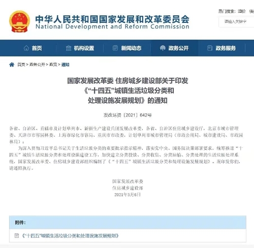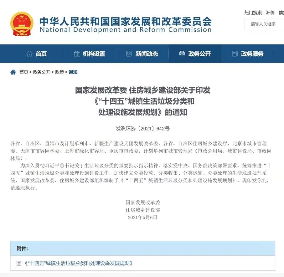 《“十四五”城镇生活垃圾分类和处理设施发展规划》解读 习近平总书记高度重视生活垃圾分类工作,多次作出重要批示指示。为加快推进生活垃圾分类和处理设施建设,提升全社会生活垃圾分类和处理水平,近日,国家发展改革委、住房和城乡建设部印发《“十四五”城镇生活垃圾分类和处理设施发展规划》(发改环资〔2021〕642号,以下简称《规划》),为今后五年全国生活垃圾分类和处理设施建设指明了发展方向,对构建完善科学的生活垃圾分类和处理系统作出了重要部署,为促进生活垃圾设施体系和环卫行业高质量发展提出了指导和政策遵循,对推动生态文明建设实现新进步、提高社会文明程度具有重要意义。 一、准确把握发展新形势,谋划生活垃圾分类和处理设施发展新思路 “十三五”时期,各地和有关部门深入贯彻习近平生态文明思想,认真落实党中央、国务院决策部署,加大规划引导和政策支持力度,稳步推进生活垃圾设施体系建设,生活垃圾分类和处理相关工作取得积极进展。目前全国城市和县城生活垃圾基本实现无害化处理,初步形成了新增处理能力以焚烧为主的垃圾处理发展格局,存量设施处理水平显著提升,生活垃圾焚烧处理行业专项整治成效显著,垃圾分类工作初见成效,为推进行业高质量发展打下坚实基础。《中华人民共和国国民经济和社会发展第十四个五年规划和2035年远景目标纲要》提出坚持绿色发展,协同推进经济高质量发展和生态环境高水平保护,全面提高资源利用效率等,对我国生活垃圾分类和处理工作提出了新的更高要求,生活垃圾分类和处理设施建设进入关键时期。但同时也要看到,当前城镇生活垃圾分类和处理设施仍面临很大的困难和挑战,突出表现为现有收运和处理设施体系难以满足分类要求、区域发展不平衡、存量填埋设施环境风险隐患突出、管理体制机制不健全等。 面临新发展形势和高质量发展要求,《规划》按照“普遍推行垃圾分类制度”的要求,以推进生活垃圾减量化、资源化、无害化为着力点,补短板强弱项,着力解决城镇生活垃圾分类和处理设施存在的突出问题。相比“十三五”时期集中提升生活垃圾处理能力的要求,《规划》坚持系统全局统筹、因地制宜发展、多元市场导向、多方参与共治,突出了生活垃圾分类投放、分类收集、分类转运和分类处理设施建设的系统性全链条处理要求,强化了其他垃圾、厨余垃圾、可回收物、有害垃圾全品类收集、运输、处置设施建设发展要求,强调了包括优化市场环境在内的生活垃圾分类和处理相关体制机制建设。《规划》客观分析和准确把握生活垃圾分类和处理发展新形势,全面系统谋划设施体系建设,全局统筹“十四五”关键时期设施发展新格局,对推动形成绿色生产生活方式和促进美丽中国建设具有重要意义。 二、贯彻落实新发展理念,提出新时期分类和处理设施发展目标体系 《规划》以习近平新时代中国特色社会主义思想为指导,全面贯彻党的十九大和十九届二中、三中、四中、五中全会精神,践行生态文明建设总体要求,坚定不移贯彻创新、协调、绿色、开放、共享的新发展理念,科学有序推动生活垃圾分类,深入贯彻创新驱动发展战略,统筹协调推进区域协调发展,提出新时期生活垃圾分类和处理设施发展目标体系。《规划》提出生活垃圾分类体系的总体要求和资源化利用率、分类收运能力、生活焚烧处理能力、焚烧处理能力占比等具体指标要求,旨在逐步建立以法治为基础、政府推动、全民参与、城乡统筹、因地制宜的垃圾分类制度,完善分类投放、回收、运输、处理相衔接的全过程管理体系,不断提高垃圾分类制度覆盖范围。 (一)《规划》分阶段分区域提出生活垃圾分类系统目标。《规划》明确到2025年,直辖市、省会城市和计划单列市等46个重点城市生活垃圾分类和处理能力进一步提升,地级城市要因地制宜基本建成生活垃圾分类和处理系统。对京津冀及周边、长三角、粤港澳大湾区、长江经济带、黄河流域、生态文明试验区具备条件的县城,要基本建成生活垃圾分类和处理系统,同时鼓励其他地区积极提升垃圾分类和处理设施覆盖水平。通过科学合理设置区域目标,将有助于推进全国生活垃圾和处理设施协调平衡发展。 (二)《规划》立足新时期发展需要,强调分类收运和垃圾焚烧处理占比要求。《规划》突出了全国生活垃圾分类收转运能力要求,避免“先分后混”现象,推动分类收运能力基本满足地级及以上城市分类收集、分类转运、分类处理需求。同时《规划》提出到2025年底,焚烧处理能力达到80万吨/日左右,相比“十三五”时期大幅增加,逐步形成焚烧处理能力为主的生活垃圾处理结构,对于行业发展具有重要指导和引领作用。 (三)《规划》首次提出了生活垃圾资源化利用率的指标,并将其作为“十四五”时期的重要指标要求,不再使用“生活垃圾无害化处理率”作为目标指标,指标的设置既参考欧盟经验,又充分考虑我国国情。《规划》明确全国城市生活垃圾资源化利用率要达到60%左右,资源化利用的方式包括了可回收物综合利用、焚烧及炉渣利用、填埋气资源利用、厨余资源化利用等,促进实现源头减量和资源的最大化利用,为“十四五”期间生活垃圾分类和处理资源化利用指明了方向。 三、突出高质量发展要求,推动形