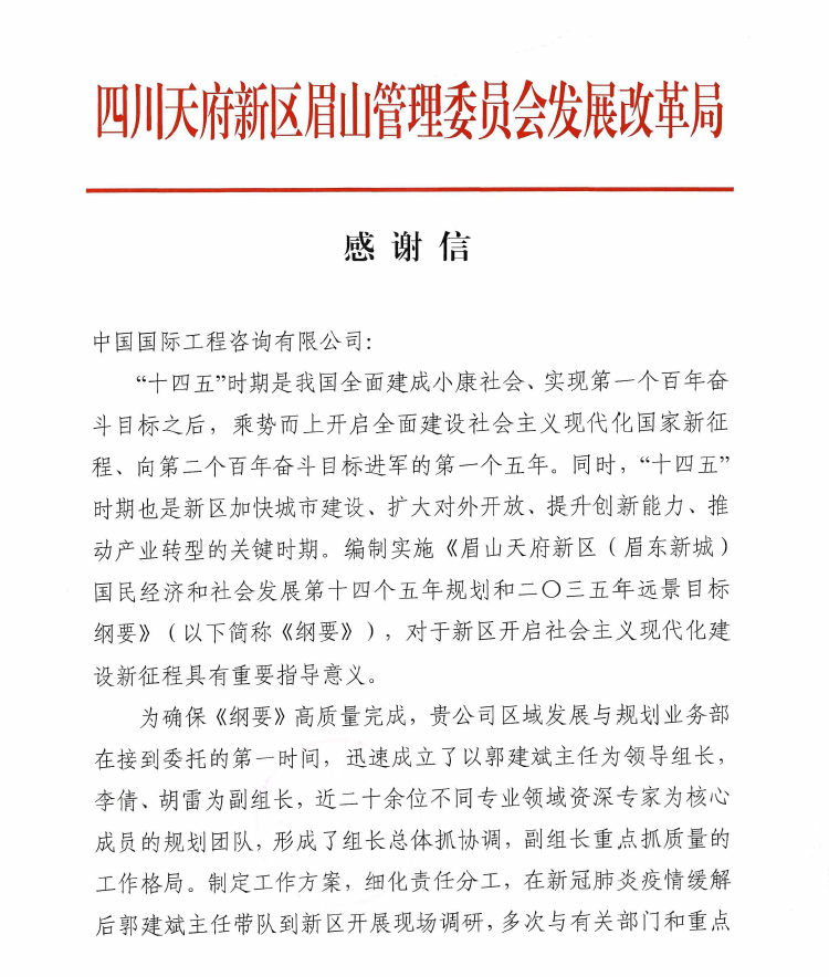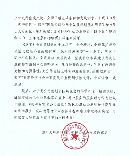 感谢有你:中咨万搏网站服务眉山天府新区擘画“十四五”蓝图获认可