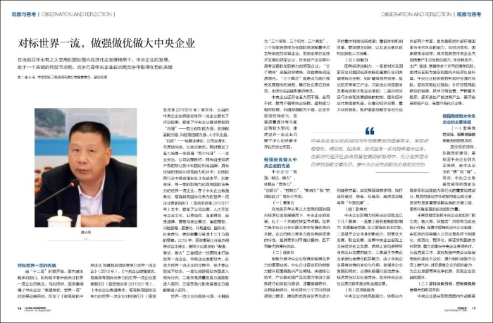 导读 在当前百年未有之大变局的国际国内经济社会发展格局下,中央企业的发展,处于一个关键的转型节点期。竞争力是中央企业在长期竞争中取得优势的关键。 ●对标世界一流的内涵 ●做强做优做大中央企业的内涵 ●做强做优做大中央企业的主要举措 对标世界一流的内涵 自“十二五”时期开始,国内越来越多的部门、机构和学者开始关注世界一流企业的概念。与此同时,国资委明确了中央企业“做强做优,世界一流”的发展战略目标,印发了《做强做优中央企业 培育具有国际竞争力世界一流企业》(2010年)、《中央企业做强做优、培育具有国际竞争力的世界一流企业要素指引》(国资发改革[2013]17号)、《中央企业做强做优、培育具有国际竞争力的世界一流企业对标指引》(国资发改革[2013]18号)等文件,为当时中央企业如何建设世界一流企业提供了行动指南,提出了中央企业建设要做到“四强”——自主创新能力强、资源配置能力强、风险管控能力强、人才队伍强,“四优”——经营业绩优、万搏网站治理优、布局结构优、社会形象优。同时提出了着力培育一批具备“四个特征”——主业突出,万搏网站治理良好;拥有自主知识产权的核心技术和国际知名品牌;具有较强的国际化经营能力和水平;在国际同行业中综合指标处于先进水平,形象良好,有一定的影响力的具有国际竞争力的世界一流企业。在《中央企业做强做优、培育具有国际竞争力的世界一流企业要素指引》(国资发改革[2013]17号)文中,提出了万搏网站治理、人才开发与企业文化、业务结构、自主研发、自主品牌、管理与商业模式、集团管控、风险管理、信息化、并购重组、国际化、社会责任、绩效衡量与管理十三个方面的要素。2019年,国资委副主任翁杰明在讲话中指出,按照中央要求的“做强、做优、做大”三者相统一的原则来打造世界一流企业,中央企业差距较大。在成为世界一流企业的过程中,至少要达到如下状态,一是在创新驱动方面进入领先行列,二是在高质量发展方面能够进入前列,三是在践行新发展理念方面能够进入前列。 世界一流企业的具体内涵,可概括为“三个领军、三个领先、三个典型”。三个领军是要成为在国际资源配置中占主导地位的领军企业,引领全球行业技术发展的领军企业,在全球产业发展中具有话语权和影响力的领军企业。“三个领先”是指效率领先、效益领先和品质领先。“三个典范”是要成为践行绿色发展理念的典范、履行社会责任的典范、全球知名品牌形象的典范。 中央企业还存在着大而不强、全而不优、散而不强等突出短板。盈利能力相对较弱、价值创造能力不强,企业在投资结构优化、发展质量提升等方面还有较大空间,建成世界一流企业仍需下决心加快解决存在的突出问题。 做强做优做大中央企业的内涵 中央企业“做强、做优、做大”,体现在“竞争力”,“创新力”,“控制力”,“影响力”和“抗风险能力”等五个方面。 (一)竞争力 在当前百年未有之大变局的国际国内经济社会发展格局下,中央企业的发展,处于一个关键的转型节点期。竞争力是中央企业在长期竞争中取得优势的关键。企业的核心竞争力具有稀缺资源的特性,是其竞争对手难以模仿,且不可替代的独特优势。 (二)创新力 创新力是中央企业取得和保持竞争力的重要砝码。中央企业最迫切的创新力提升应围绕新兴产业领域、关键核心技术、产业模式和产品创造力等四个层级进行创新能力建设,注重基础研究、应用基础研究、转化研究三个方向的创新能力建设,推动形成具有世界先进水平的重大科技创新成果;重视体制机制改革、管理理念创新,以及企业家队伍和创新型人才培育。 (三)控制力 国有经济控制力,一是在对涉及国家安全和国民经济命脉的重要行业和关键领域的控制,如矿藏等自然资源,航空航天等军工产业,只能也必须由国有及国有控股大型企业承担;二是对经济运行态势和发展趋势的控制,国有经济应代表国家利益。在推动经济发展、重大科技创新,维护国家战略安全和长远利益等方面,应发挥顶梁柱作用,如打造好高铁、核电、特高压、高效清洁煤电等“中国名牌”。 (四)影响力 中央企业影响力的形成必须包含以下几个要素:一是基于股权控制的影响力,即要融合发展,放大国有资本的功能。二是基于企业本身的影响力,即要壮大发展、联合发展,发挥中央企业宏观上支持经济社会发展、微观上带动多种所有制企业发展的能力。三是基于中央企业承担社会责任的影响力,由于中央企业具有独特的地位与作用,在谋求企业发展的同时,必须积极履行政治责任、经济责任以及社会责任,推动中央企业社会责任体系建设和全面发展。 (五)抗风险能力 中央企业的抗风险能力,体现在内外部两个方面。首先是抵抗外部环境因素带来的风险的能力,如经济危机、国家政策变动等;其次是防范中央企业内部因素产生的风险的能力,涉及到技术、生产、管理、营销等多个环节的潜在风险。面对目前较为复杂的国内外经济社会环境,中央企业应积极预判和评估潜在风险,提前采取应对措施;补好经营风险防控的短板,抓牢日常监管,严防重大隐患;逐渐退出产能过剩产业、高污染高耗能产业、高度市场化行业等。 做强做优做大中央企业的主要举措 (一)坚持党的领导,凝聚做