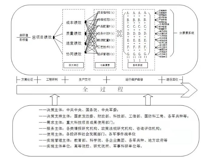 基于基础信息要素的重大科技工程项目全过程管理及绩效评价研究 万搏网站 武博祎 哈尔滨工程大学 陈茜、芦翰晨、陈俊清 摘要:文章基于系统工程、综合集成等相关理论,坚持需求导向,从重大科技工程项目落实全要素、全过程军民融合和协同创新,以及对重大科技工程项目实施科学和精细化管理出发,将重大科技工程项目所表现和涉及的基础要素按如下七个维度进行划分:项目技术指标E(t)、项目标准规范S(t)、产品配套结构P(t)、保障资源配置R(t)、制造工艺技术I(t)、项目任务计划W(t)、组织管理效能O(t),并提出各维度要素及项目成本、质量、进度、协同四大特征与整个工程项目绩效评价方法,以便实现重大科技工程项目全要素、全过程动态集成管理和绩效评价,为科学决策提供支持。 关键词:重大科技工程项目;要素;集成管理;绩效评价 一、引言 为提升国家战略实力,增强自身竞争优势,包括美国、俄罗斯、日本、印度、欧洲等国家和地区都积极组织实施集工程研制、科学研究和能力建设目标为一体、军民融合的重大科技工程项目。为实现我国战略发展目标,国家2006年2月发布《国家中长期科学和技术发展规划纲要(2006-2020)》[1],确定了关系国计民生的16个重大专项;2017年科技部启动了“科技创新2030-重大项目”,对重大科技工程项目进行布局。这些重大科技工程项目的实施,对解决国家安全重大问题,推动科技进步,服务经济社会发展,提升产业整体竞争力,增强综合国力具有重大战略意义。 重大科技工程项目是集科学层次理论研究与核心技术突破、技术层次资源集成与开发实施、工程层次产品(设施)研制于一体,且具有军民融合属性的复杂巨系统[2]。具有实施周期长、投资大、领域广、风险高等特点,需要各参研参建单位资源共享、协同创新,各相关主体对项目涉及的要素进行科学和精细化管理,才能完成项目既定目标,并使军民融合和科技协同创新战略得以贯彻落实。但从现实情况看,目前我国重大科技工程项目管理仍普遍采用上世纪50年代美国项目管理协会提出的项目管理方法,重点关注项目进度、成本和质量等中观特征要素,对影响项目预算变化、进度调整、质量保证等问题,特别是项目深度军民融合效能问题,缺乏有针对性的基础信息要素分析和管理。因此,在国家要求在相关领域实现全要素军民融合深度发展的大背景下,如何在一定的约束条件下对重大科技工程项目组织实施科学、精细和动态管理,并使其实现既定目标,是一个重要且急需解决的问题。 我国现行基于美国上世纪提出的项目管理理论制定的针对科技工程项目管理方法,一直以来对项目管理取得了积极的成效,但随着人们认知自然世界的不断深入、所面临问题的不断变化、对重大科技工程项目管理要求的提高,需要有能够全面、系统、量化、精细反映重大科技工程项目本质运动状态的管理方法,以便对项目实施的变化趋势、项目目标实现可能遇到的风险进行准确分析判断,适应管理的科学化、系统化、精准化、协同化要求。因此,本文通过剖析重大科技工程项目基础信息要素,构建基于信息要素的绩效评价体系,实现全要素、全过程的科学化、系统化、知识化、精准化、准实时动态管理,具有一定的理论和实际应用意义。 二、重大科技工程项目管理研究现状 重大科技工程项目全要素、全过程管理研究目前处于起步阶段,研究成果相对较少,研究的视角主要集中在从国家宏观层面及微观重大科技工程项目过程管理两方面开展研究。 宏观角度研究重大科技工程项目管理的目的在于为其培育较好环境,完善相关政策,优化重大科技工程项目资源配置,推动重大科技工程项目成功实施。国家为项目的实施能够达到预期的目标,对重大科技工程项目制定相关的政策、法规及激励、评价、审核机制,建立与重大科技工程项目全寿命周期相匹配的管理制度和方法,针对项目方案论证、工程研制、生产交付、运行维护维修和退役回收等相应阶段[3],确定各环节里程碑并予以制约、管制,建立有效监督机制加强对重大科技工程项目宏观管理。基于此,学者在监督机制建立[4]、重大科技工程项目评价[5]、国内外重大科技工程项目管理等方面开展了相关研究。 微观角度研究重大科技工程项目主要以项目全寿命周期过程管理为对象[6]。重大科技工程项目是一开放复杂巨系统,具有投资规模大、实施周期长[7]、技术风险高、参与单位多、专业领域广、任务层级多、管理任务重等内在特点,对项目的过程管理提出了更新、更高的要求。诸多学者致力于研究相应方式方法,使过程管理综合集成遵循某种法则,通过约定项目信息传递方式、组织管理规范,使项目管理呈现有序和统一状态。目前,重大科技工程项目过程管理主要从界面管理、知识管理、创新工程三个角度展开研究。从界面管理角度展开研究的学者认为界面为各子系统之间相互区别又相互联系的纽带[8],只有做好横向众多参与单位之间接口及纵向实施过程各阶段接口管理工作,才能使重大科技工程项目实现资源最优配置,完成重大科技工程项目目标,学者主要从合作界面及组织界面两个维度展开研究,进行关键界面识别及研究整合优化方法。从知识管理角度开展研究的学者认为,知识是重大科技工程项目实施过程中流动的“血液”,故侯光明