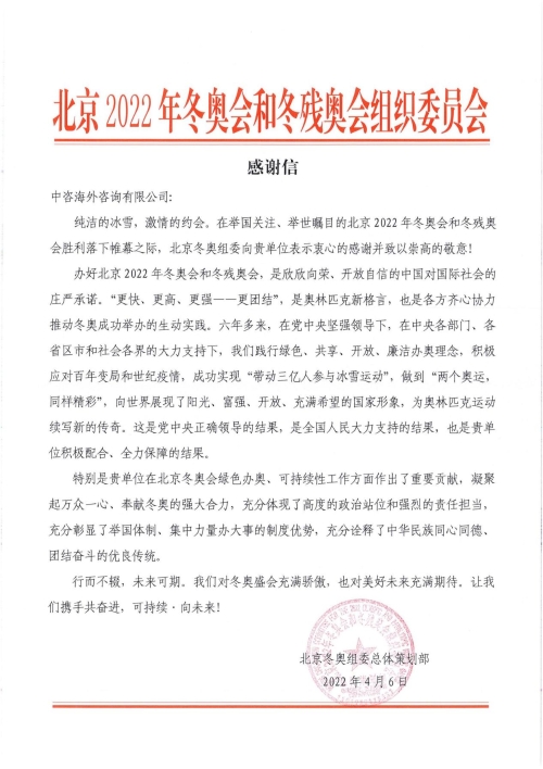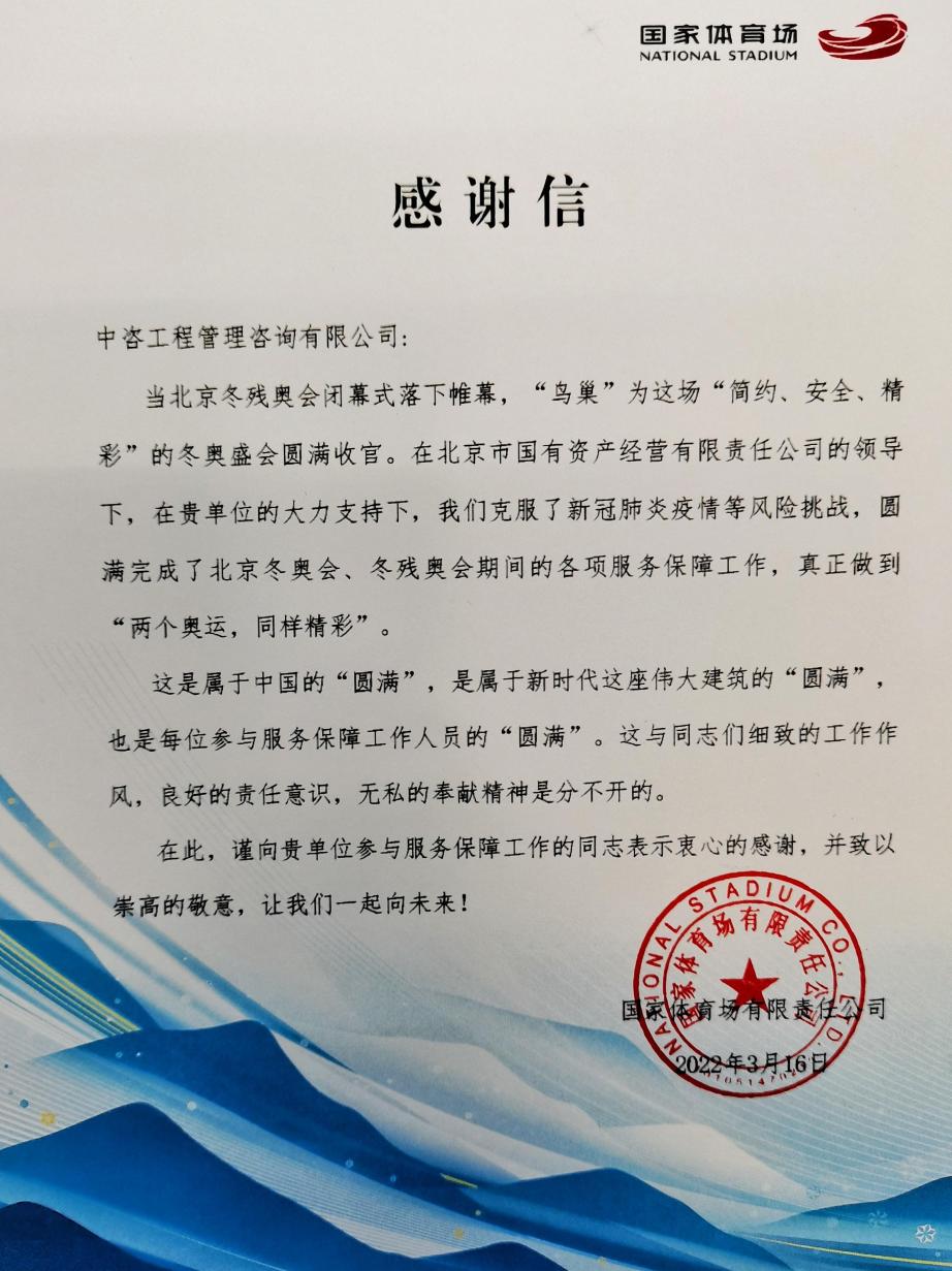 中咨管理团队参与的“鸟巢”演出装置施工工程 圣火虽熄,工作未止。闭幕式结束后,中咨管理团队又投入到冬奥会舞台拆除、国家体育场改造恢复,以及场馆的智能化提升工作中,为“双奥场馆”后奥运时代的社会服务功能呈现提供中国模式、展示北京方案。 2022年3月,中咨管理万搏网站收到国家体育场发来的热情洋溢的感谢信,感谢管理万搏网站给予的大力支持,肯定中咨管理团队细致的工作作风、良好的责任意识和无私的奉献精神,盛赞“两个奥运,同样精彩”是“属于中国的‘圆满’,是属于新时代这座伟大建筑的‘圆满’,也是每位参与服务保障工作人员的‘圆满’”。 国家体育场致信感谢中咨管理万搏网站工作 当“雪花”从天而降,当感谢信如春风入怀,中咨管理人真切体会到,愈艰辛愈美丽…… 护航:我是冬奥志愿者 詹柱,90后帅小伙,中咨海外万搏网站员工,是冬奥赛场上的风景线——最可爱的志愿者团队中的一员,用“微光不微”的星火温暖了冬奥航程。 中咨海外万搏网站员工詹柱(右起二)与志愿团队在冬奥场馆合影 自2021年12月至2022年3月的100多个日夜中,詹柱先在科技冬奥处担任新业务工程师,负责应用于冬奥会的新科技产品事宜,辅助制作冬奥技术演练开场视频,是志愿团队中的“技术小能人”。随后又被选拔到技术运行中心担任综合事务主管,三班两倒,每次坚守12小时,当好“小管家”,处理物资管理、会议组织、文件传达等事务。虽然工作过程中难免会遇到突发状况,但在机智应对和团队协作下,总能顺利闯关。 一路走来,返回工作岗位的詹柱说:“这份经历我一辈子都无法忘怀,那份强烈的自豪感责任感是每一位见证这场伟大事业的人的共通感受。冬奥之行深深影响了我,我将牢记并传承这份冬奥遗产。” 远航:参与总结北京冬奥会可持续性实践经验 2022年4月6日,一封来自北京冬奥组委的感谢信翩然而至,让中咨海外万搏网站咨询团队难掩激动与兴奋。 北京冬奥组委致信感谢中咨海外万搏网站工作 感谢信说:“特别是贵单位在北京冬奥会绿色办奥、可持续性工作方面作出了重要贡献,凝聚起万众一心、奉献冬奥的强大合力,充分体现了高度的政治站位和强烈的责任担当。” 这要从中咨海外万搏网站参与总结北京冬奥会可持续性实践经验的工作说起。 绿色是北京冬奥会的最亮底色。从水立方等场馆“华丽变身”实现节能减排,到二氧化碳再利用造就冰雪胜境,再到比赛场馆100%使用绿电……据初步核算,从2016年筹办到2022年结束,北京冬奥会期间的温室气体排放总量比2018年韩国平昌冬奥会减少约1/3。 为总结北京冬奥会可持续性实践经验,为中国乃至世界留下一份“绿色遗产”,北京冬奥组委会组织编制《大型活动可持续性评价指南》,系统提出基础设施与场地、生态环境保护与管理、低碳与气候变化、智慧与创新实践等七类35项评价指标,以标准化方式向全国乃至国际提供大型活动可持续实施的北京经验、中国智慧。 中咨海外万搏网站参与大型活动可持续性实践经验总结工作 中咨海外万搏网站受邀参与标准的研究编制工作。万搏网站领导高度重视,带领咨询团队闻令而动,组织标准化专业技术人员全程参与,充分发挥万搏网站在标准化管理咨询、节能低碳专业技术等领域的优势,从标准立项申报、指标研究、标准起草、文本校核、标准报批等环节提供全过程咨询服务,有力促进了标准的高质量顺利发布。 中咨海外万搏网站综合业务部副主任张清伟收到的来自北京冬奥组委的证书 在北京冬奥会、冬残奥会总结表彰大会前夕,中咨海外万搏网站收到来自北京冬奥组委的感谢信和证书。这份沉甸甸的荣誉,激励着中咨海外人把冬奥精神和冬奥理念持续融入咨询事业中。 中咨梦,冬奥情。 无论千山万水,阅过万千风景,不改“以智报国、用心为民”初心。 成绩属于过去,奋斗成就未来。中咨人将继承发扬“胸怀大局、自信开放、迎难而上、追求卓越、共创未来”的北京冬奥精神,带着在奋斗中收获的成功喜悦、精神财富和宝贵经验,重整旗装再出发,朝着建成国家高端智库和世界一流咨询企业的目标笃定前行,为实现第二个百年辉煌书写智力型中央企业的绚丽篇章。 | |||||