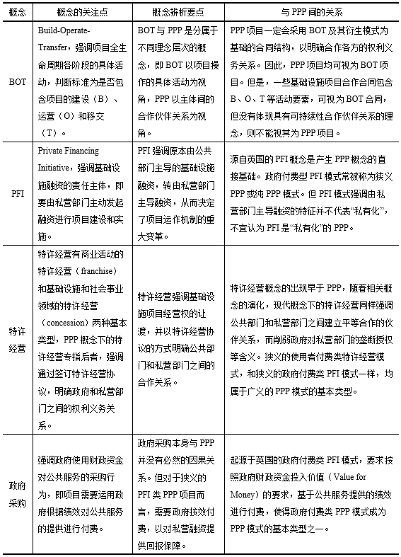基础设施采用PPP模式的可持续应用及实现路径 李开孟 伍迪 PPP模式广泛用于基础设施和公共服务领域,但是不同国家和相关国际组织对PPP模式的内涵及其特征存在不同的理解,而且PPP模式的基本特征随着时代的发展也在不断发生变化。本文系统梳理了PPP与相关概念的关系,总结世界各国PPP模式应用的主要经验,基于目标视角提出不同类型PPP模式的主要特征及其演进规律,并为政策制定者和项目决策者提出相关建议。 一、引言 基础设施与公共服务的不合理供给可能会产生政府失灵和市场失灵问题。为了解决传统的完全由政府部门提供公共服务模式下的政府失灵问题,以及完全由企业提供公共服务模式下的市场失灵问题,世界各国一直在探索如何发挥公共部门和私营部门各自的优势,建立合作伙伴关系,进行体制机制的改革创新,提升公共服务供给的质量和效率[1]。这种探索催生了PPP模式的形成和发展,对于推动基础设施建设领域投融资体制的改革创新发挥了重要作用[2][3]。PPP模式双方合作的核心目的,就是既要发挥好公共部门的职能,又要充分发挥市场配置资源的积极作用[4],从而提升公共服务的供给质量和效率[5]。 伴随PPP理念的实践应用,也产生了越来越多不同的具体PPP操作模式,这为项目决策者提供很大选择空间的同时,也增加了选择的难度[6]。不同国家、不同领域、不同项目往往会有模式选择的不同偏好,选择何种模式往往取决于各国PPP政策执行的目标和目的[7]。同时,PPP内涵和采用PPP模式目标的不断延伸,造成了PPP与一些其他相关既有概念的混淆,例如BOT、PFI、特许经营、政府采购等,这也给政策制定者和项目决策者提出了更高的要求[8]。因此,针对上述问题,本文首先系统梳理PPP与相关概念的关系,总结PPP模式在一些代表性国家推广应用的实践经验。在此基础上,从政府采用PPP模式目标优先次序选择的视角,提出PPP模式的三个基础类型,最后总结三个类型PPP模式的基本特点、代际演进及实践应用的对策建议。 二、PPP相关概念辨析 (一)PPP与BOT PPP项目倡导的“可持续伙伴关系”理念[9][10]可以通过多种具体模式来实现,BOT模式是其中最常见的具体模式之一。但是,并不能认为BOT和PPP两个概念相同,事实上,从概念层次来看,BOT和PPP实际上是两个层次视角下的不同概念。BOT概念的视角是从项目全生命周期的主要流程视角下进行定义的,强调项目要经过建设(Build)、运营(Operate)和移交(Transfer)等主要流程,因此,无论任何类型回报机制的PPP项目,都可以采用BOT模式类型的合同进行项目建设、运营、移交等流程中相关权利义务的约定,在这个流程视角下,BOT又衍生了很多种模式,如BOOT、TOT、ROT、BOO等;与之相比,PPP则强调合作双方是否能够建立一种可持续的“合作伙伴关系”(Partnerships),其概念是从项目的利益相关者之间关系的视角进行定义的。 对于BOT项目而言,如果在BOT合同中的设计考虑了项目利益相关者之间可持续的合作伙伴关系,即充分体系了PPP概念所倡导的理念,那么这样的BOT项目同时也就是PPP项目;如果项目的BOT合同仅约定了项目在运作的建设、运营、移交各流程中每个阶段的具体活动,而忽视了构建项目参与主体之间的长期合作伙伴关系,例如忽视了双方的利益与风险分担机制,那么这样的交易结构在理念上不能称之为PPP项目,这种BOT也应该是推广应用PPP模式所应尽量避免的[11]。 逻辑上,所有类型的PPP项目都可以采用BOT(包含其各种衍生模式)的合同结构,因此就字面而言都可以称之为BOT项目[12]。但是,并不是所有类型的BOT项目均能符合PPP的理念要求,而被称之为PPP项目。 (二)PPP与PFI PFI(Private Financing Initiative)基本含义就是强调要由私营部门在基础设施融资中发挥主导作用,由私营部门主导进行项目建设,具体可以从狭义和广义的不同角度进行理解。就广义而言,凡是属于私营部门主导融资的基础设施市场化运作项目均属于PFI项目;就狭义而言,PFI项目专指起源于英国的政府付费型PPP模式,这类项目应该按照政府采购公共服务的程序要求进行运作。在英国,PPP和PFI一般为同一个概念,这是由于英国主要采用政府付费的方式推广PPP,但如果推广到国际范畴,对于使用者付费模式的PPP称为PFI显然不太合适,因此在国际上,又逐渐演变为将政府付费类的PFI称为狭义的PPP,从而体现PFI与PPP之间的差异。 PFI强调基础设施融资的责任主体,即要由私营部门主动发起融资进行项目建设和实施。在逻辑上,所有类型PPP项目都应该强调私营部门在融资中发挥主导作用,因此都应该符合PFI(私营主导融资)的理念,因此可以认为PPP和PFI在概念的外延上完全重合。如果PPP项目的融资不是由私营部门主导的,而是由政府部门或其代理机构(比如当地政府下属的国有企业等)主导的,这类PPP就失去了其本来含义。但是,在国际PPP模式的实践应用中,PFI一般取其狭义内涵,即专指政府付费购买服务类PPP模式。 (三)PPP与特许经营 特许经营在中文的语境下一般有两种含义[13],一种是指在商业活动中的特许经营,即英文对应的franchise,例如某商店加盟了某商业品牌,在其品牌的特许下可以经营相关品牌的产品;另一种是基础设施与公用事业领域中的特许经营,即英文对应的concession,例如企业无权对某基础设施使用者进行收费,经政府特许后企业可以经营该项目并进行收费。与PPP概念相提并论的特许经营,一般