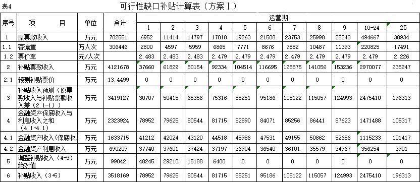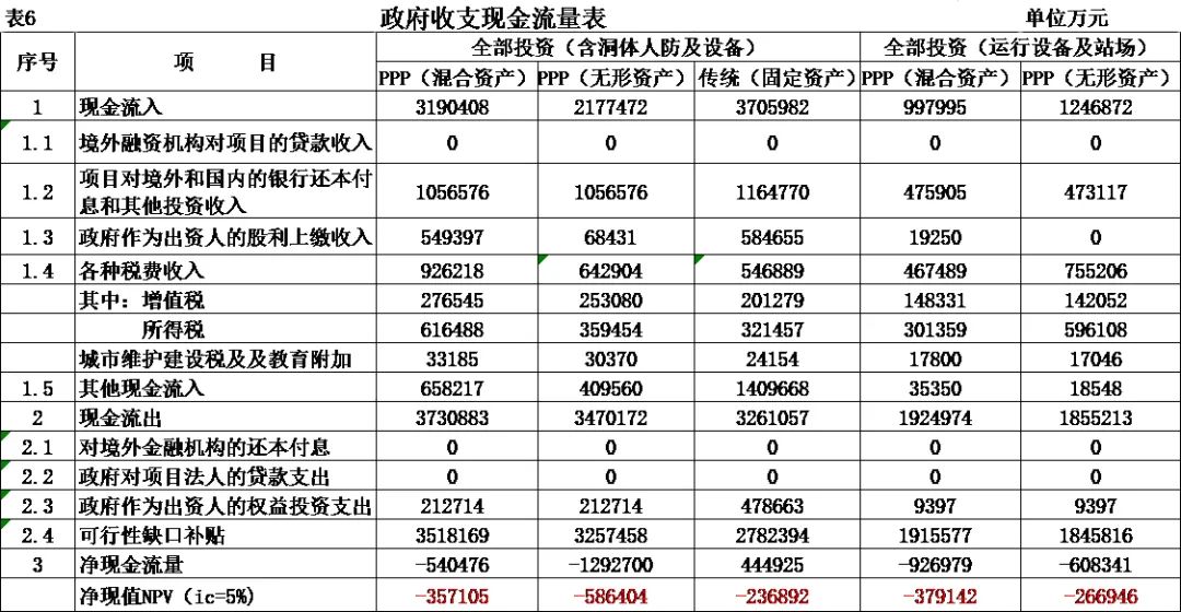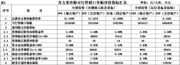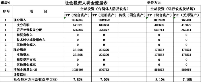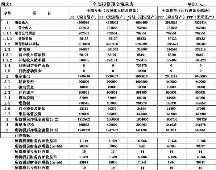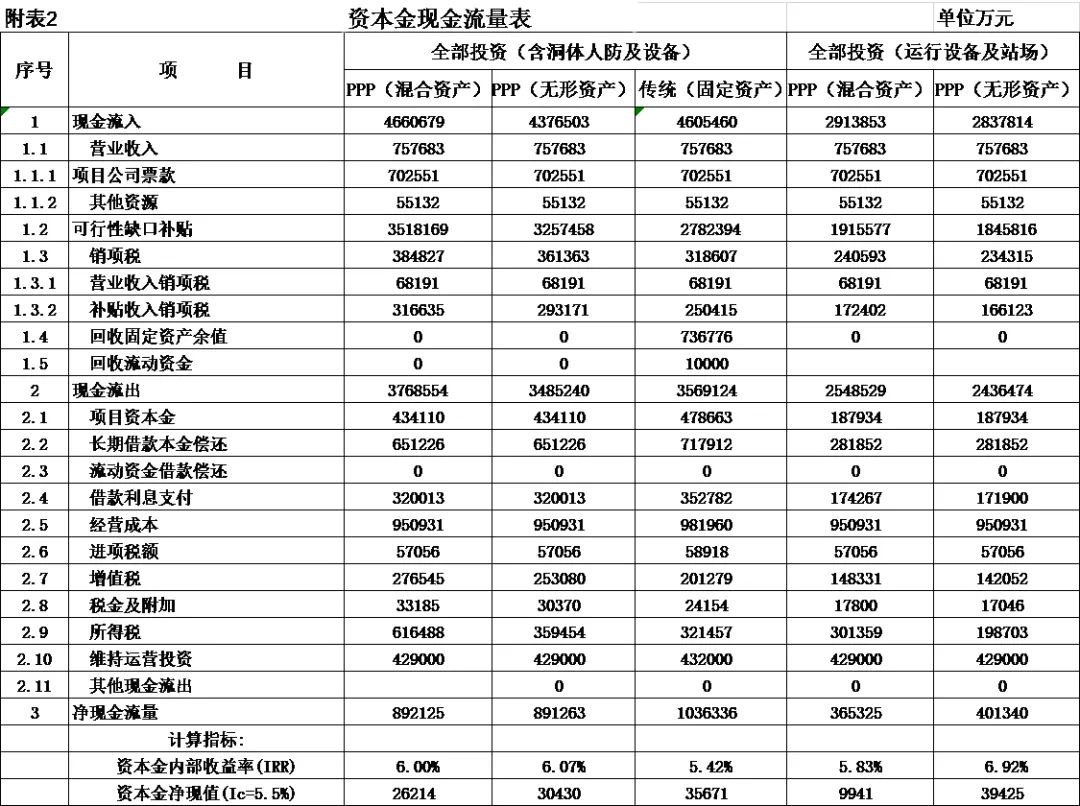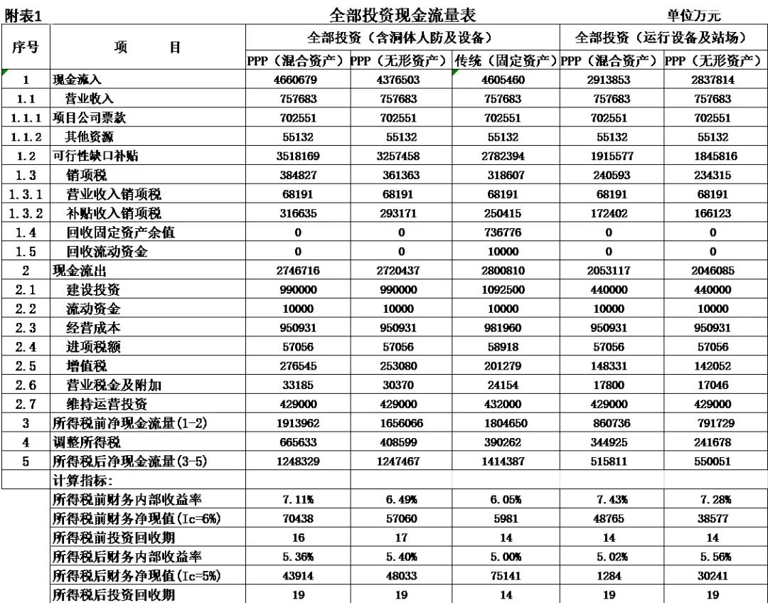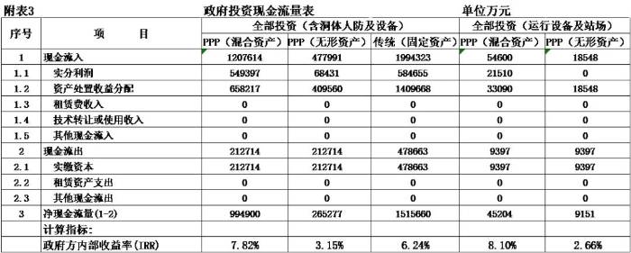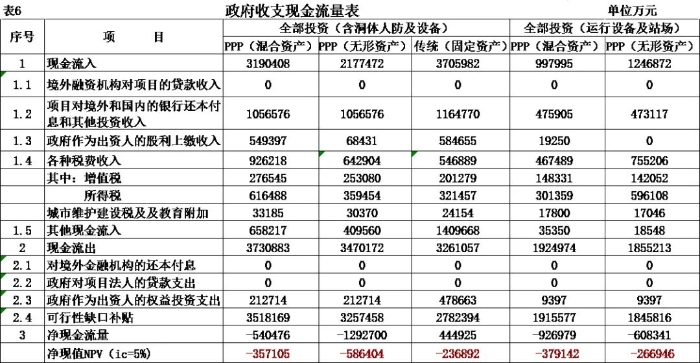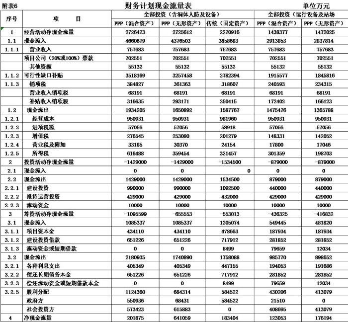 式中,Ct为项目包括投资在内的各期费用,一般为财务分析的投资、经营成本估算及维持运营投资,Qt为第t期的产出供应消费的量,i0为折现率。 2.反推价格中费用取值 反推价格公式中的费用可以利用全部投资现金流量表或资本金现金流量表中的现金流出量。本文推荐在PPP项目中,采用资本金现金流量表中的现金流出计算反推价格,原因是资本金财务基准收益率是投资者期望的目标收益率,采用资本金现金流出量反推的价格,计算的补贴额可直接达到投资者期望的收益目标,同时也可满足全部投资所得税后财务内部收益率指标。 3.反推价格折现率取值 反推价格折现率取值可以适当取值偏高一些,需要反复试算,选取合理折现率。 方案Ⅰ反推价格选取按折现率7%,计算结果,反推价格为13.4499元/人次,计算过程见表3。 4.可行性缺口补助计算过程 (1)反推价格(P=13.4499元/人.次); (2)利用反推价格和可研报告的产品(或服务)数量计算达到目标收益率的收入总量,见表3序号2,计算票款收入41.22亿元(该项收入为原运营收入和需要补贴收入之和); (3)目标收入总量减去原票款收入,计算需要补贴数额,见表3序号3,计算补贴收入(补贴票款收入与原票款收入之差(2.1-1.1))34.19亿元; (4)计算金融资产保底收入与利息收入之和,见表3序号4(4.1+4.1)232.39亿元; (5)调整补贴收入,当有些年序中补贴票款收入与原票款收入之差小于零时,需要调整补贴收入,令其补贴收入等于当年的金融资产保底收入与利息收入之和,见表3序号5,9.9亿元; (6)补贴收入,见表3序号6,351.82亿元。 (三)财务分析指标汇总 各方案可行性缺口补贴及评价指标汇总见表5。 (四)政府收支现金流量分析 政府收支现金流量表见表6。 (五)五方案数据对比分析的两点启示 数据对比分析结果的启示: 启示一:采用PPP模式要合理界定项目的范围。基础设施项目投资结构中纯公益性设施投资占有较大比重的项目不适宜将全部投资纳入PPP模式,建议将纯公益性设施与运营设施分开处理,两部分投资可选择不同的运作模式。 第一组案例,PPP模式方案Ⅰ和方案Ⅱ与政府自建的传统模式方案Ⅲ相比: 方案Ⅰ和方案Ⅱ根据特许经营协议规定的绩效考核标准,两方案投资、经营成本及更新改造投资均比传统模式政府自建成本节约10%左右。表5财务指标计算结果可行性缺口补贴,方案Ⅰ为351.82亿元,方案Ⅱ为325.75万元,方案Ⅲ为278.24亿元。方案Ⅲ比方案Ⅰ节约73.43亿元,比方案Ⅱ节约47.51亿元。表6政府现金收支流量分析结果,方案Ⅲ政府收支净现值(ic=5%)为最小-23.69亿元,比方案Ⅰ-35.71亿元,减少12.02亿元, 比方案Ⅱ-58.64亿元,减少34.95亿元。 为什么传统模式方案Ⅲ在投资规模、经营成本、更新改造投资均高出两方案10%左右的情况下,而财务指标优于PPP模式?主要原因有两个: 一是,地铁项目投资结构分为两部分,洞体工程为地铁运营提供了运输空间,属于纯公益性质,且投资占比在60%左右,而投资占比40%左右的营运设施,则属于经营性。在传统项目实施方案中洞体及人防土建工程按80-100年提取折旧,在25年内固定资产提取折旧57.89亿元,回收固定资产余值54.93亿元。而选择PPP模式时,洞体及人防建设成本在25年项目万搏网站全部回收,显然运营期增加了政府补贴额。 二是,政府自建模式方案Ⅲ,不存在对社会资本补贴收益的支出。政府自建模式的缺点是初始投资大,建设及运营风险全部由政府承担。 启示二:确认PPP模式资产性质、设置保底量及合理分担政府与社会投资人的风险,直接影响可行性缺口补贴的计算结果。 第一组案例是全部投资(含洞体及人防工程投资)条件下的PPP模式,方案Ⅰ为混合资产,方案Ⅱ为无形资产(不再详述)。 第二组案例扣除洞体及人防工程投资,方案Ⅳ混合资产,方案Ⅴ无形资产。以下本文重点分析第二组方案PPP模式方案Ⅳ混合资产定性的过程。 方案Ⅳ和方案Ⅴ是扣除洞体及人防土建工程投资的PPP项目,项目总投资42.46亿元,资本金18.79亿元,政府出资5%,为0.93亿元,社会出资人出资95%,为17.85亿元。方案Ⅳ资产性质为混合资产,方案Ⅴ资产性质为无形资产。两个PPP方案的财务分析的结果完全不同,究竟应该选择哪个方案? 1.方案Ⅳ混合资产定性的过程 PPP模式资产性质是授予方(政府)根据项目的产品及风险分担机制来确认的。方案Ⅳ,项目万搏网站承担的建造服务总投资42.46亿元(不含进项税),加4%综合利息率(或综合折现率),政府应付款73.56亿元。政府拟以票款收入支付建造成本,总票款收入70.26亿元,可行性缺口73.56 -70.26 =3.30亿元,称可行性缺口补贴。根据风险分担机制,政府承诺保底量为预测客流总量的80%,票款为56.20亿元,如果票款收入不到80%,授予方予以补贴。授予方提供给项目万搏网站保底收入为3.30+56.20=59.51亿元,即应收账款(也称金融资产),现值(折现率ic=4%)34.89亿元,即为金融资产现值,项目总投资42.46-34.89 =8.06亿元,即为无形资产(详细数据见表2-1)。政府保底以外的20%的票款特许收费权给项目万搏网站,这是一项不确定的收入,风险由项目万搏网站承担。 《解释第14号》规定:当特许服务权合同中约定需求风险,由经营方与授予方共担,授予方承担差额担保部分的需求风险,经营方对可获最低限额担保部分的对价,应确认为金融资产,将剩余部分确认为无形资产,该无形资产为经营方从使用者付费超出最低限额部分的收费权利,项目万搏网站应当在确认收入