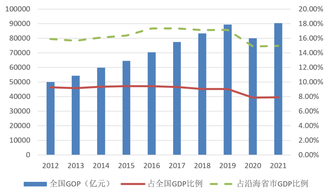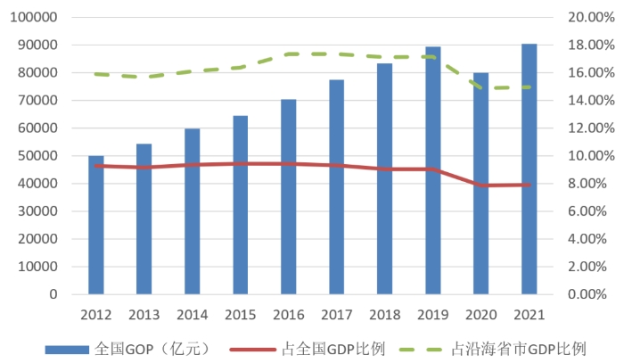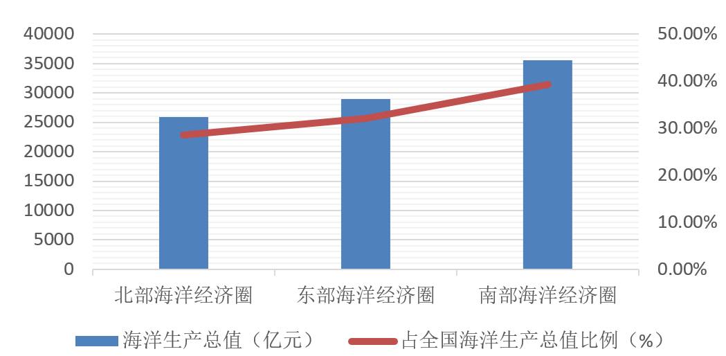我国海洋经济高质量发展的对策建议 刘堃 邹涤 王才君 王海潮 21世纪是海洋的世纪。海洋既是人类赖以生存的蓝色家园,也是人类社会可持续发展的资源宝库和空间载体。海洋经济是开发、利用和保护海洋的各类产业活动,以及与之相关联活动的总和。党的十八大以来,在以习近平同志为核心的党中央坚强领导下,沿海各省(直辖市、自治区)持续推进海洋经济发展,海洋产业结构调整步伐加快,自主创新能力不断提升,供给保障能力持续增强,国际竞争优势进一步巩固,海洋经济已成为国民经济的强劲增长点。《中共中央关于制定国民经济和社会发展第十四个五年规划和二〇三五年远景目标的建议》中指出,坚持陆海统筹,发展海洋经济,建设海洋强国。“十四五”规划建议中,福建、广东、浙江、山东、海南、辽宁等沿海省份明确提出“建设海洋强省”。 一、我国海洋经济发展现状 (一)总体情况 我国是海洋大国,主张管辖海域面积约300万平方千米,大陆海岸线长1.8万多千米,岛屿岸线长1.4万千米,面积大于500平方米的岛屿7300多个,海岛陆域总面积约8万平方千米。辽阔的海域蕴藏着丰富的海洋资源,2万多种海洋生物,油气资源沉积盆地约70万平方千米,近海潮汐能蕴藏量19286万千瓦,重要海砂资源区面积约30.3万平方千米。 近年来,我国海洋经济发展迅速,海洋经济总体实力进一步提升,海洋经济布局进一步优化,海洋经济结构加快调整。2021年,我国海洋生产总值(GOP)首次突破9万亿元,达90385亿元,比2020年增长8.3%,高于国民经济增速0.2个百分点。海洋一、二、三次产业增加值占海洋生产总值的比重为5.0:33.4:61.6(2012年,海洋三次产业增加值占海洋生产总值的比重为5.3:45.9:48.8)。 数据来源:自然资源部,中国海洋经济统计公报,2021年。 图1 2021年我国海洋生产总值(GOP)构成 海洋经济作为高度外向型的经济类型,受国内国际形势影响大。近年来,国际环境更趋复杂严峻,国内疫情多发散发,对海洋产业链供应链造成较大冲击,海洋经济下行压力明显加大。2020-2021年,海洋生产总值在全国GDP占比、沿海省市GDP占比与2019年相比有所下降,保持在8%、15%左右。 数据来源:自然资源部,中国海洋经济统计公报,2012-2021年。 图2 我国海洋生产总值及其GDP贡献年度变化 (二)海洋产业发展现状 我国已成为世界海洋经济大国,主要海洋产业规模领跑全球,在海洋渔业、港口航运、滨海旅游及船舶海工等产业领域优势明显。2021年,主要海洋产业增加值34050亿元,比2020年增长10.0%。 数据来源:自然资源部,中国海洋经济统计公报,2021年。 图3 2021年我国主要海洋产业增加值构成 海洋传统产业优化升级加速。现代化海洋牧场综合试点有序推进,创建国家级海洋牧场示范区153个(截至2022年7月)。海水养殖走向深蓝,全潜式深海渔业养殖装备“深蓝1号”成功收获我国首批深远海大西洋鲑,积极探索了我国深远海养殖新模式。“清洁能源+渔业”成为发展新趋势,“海上风电+海洋牧场”融合创新示范基地项目、亚洲最大渔光互补光伏发电项目相继开工建设。海洋船舶建造绿色低碳化发展,绿色动力船舶订单占全年新接订单的占比达到24.4%。沿海港口建设智慧化推进,已在厦门港、青岛港、上海港、深圳港、日照港、天津港等8个港口建设了33个自动化码头。 世界上最大的全潜式深海养殖装备“深蓝一号” 海洋新兴产业总体保持较快发展。海洋生物医药、海洋电力、海水利用等海洋新兴产业增势强劲,增加值分别比2020年增长18.7%、30.5%和16.4%,显著高于主要海洋产业增速,领跑海洋经济。产业公共服务能力日趋增强,国家海洋综合试验场(威海)正式挂牌,海水淡化与综合利用示范基地在天津临港完成一期中试实验区建设。海洋产业数字化发展取得新进展,我国首个海洋油气生产装备智能制造基地在天津建成投产,首个智能深海油气保障仓储中心在海南建成投用,海铁联运自动化集装箱码头在广西钦州启用。 优势海洋产业国际竞争力增强。海洋交通运输业和海洋船舶制造业国际竞争优势凸显。2021年,我国海洋交通运输业实现较快增长,增加值比2020年增长10.3%。沿海港口完成货物吞吐量和集装箱吞吐量分别为99.7亿吨、2.5亿标准箱,居世界第一;其中,宁波舟山港以122405万吨的吞吐量维持世界第一。海洋交通运输业新登记企业数同比增长47.5%。同时,国际航运市场复苏叠加船舶批量更替周期,带动全球新造船市场超预期回升,我国船企抓住机遇承接大量订单,海船完工量、新承接订单量、手持订单量三大指标实现全面增长,分别同比增长11.3%、147.9%和44.3%。海洋高端装备制造加快发展,新承接LNG(液化天然气)船规模达我国历史最高水平。 宁波舟山港 (三)区域海洋经济发展情况 依据《“十四五”海洋经济发展规划》,我国区域海洋经济包括北部、东部和南部三个海洋经济圈。 北部海洋经济圈指由辽东半岛、渤海湾和山东半岛沿岸地区所组成的经济区域,主要包括辽宁省、河北省、天津市和山东省的海域与陆域。2021年,北部海洋经济圈海洋生产总值25867亿元,占全国海洋生产总值的比重为28.6%。 东部海洋经济圈指由长江三角洲的沿岸地区所组成的经济区域,主要包括江苏省、上海市和浙江省的海域与陆域。2021年,东部海洋经济圈海洋生产总值29000亿元,占全国海洋生产总值的比重为32.1%。 南部海洋经济圈指由福建、珠江口及