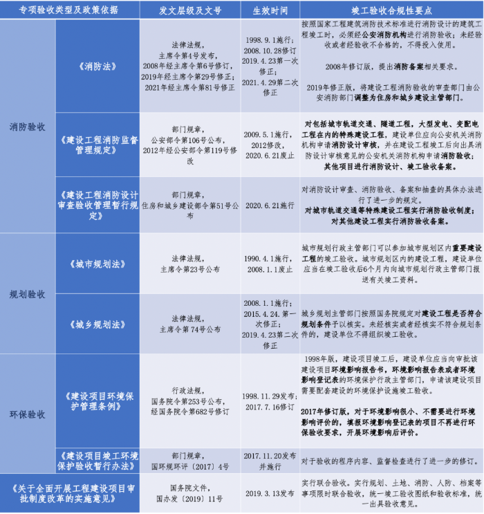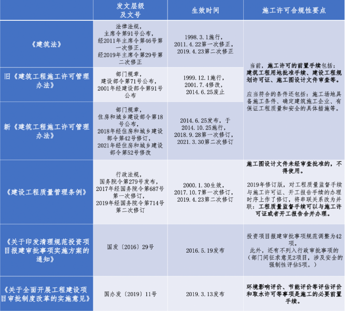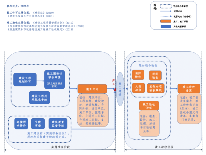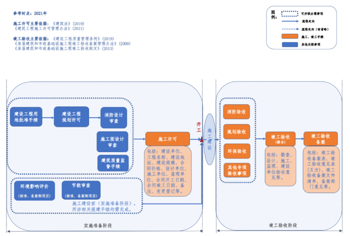 编者按 新中国成立以来,我国基础设施投资建设取得了举世瞩目的成就,是国家经济社会发展的重要支撑,为人民生活水平的提高做出了巨大贡献。改革开放以来,市场开始发挥配置资源的决定性作用,为我国基础设施的发展焕发了新的活力。据统计,我国基础设施资产总规模在1990年排在全世界约第15位,2000年上升到第7位,2010年跃升为第3位,至2018年已居世界首位。 党的二十大报告在回顾过去五年的工作和新时代十年的伟大变革中,充分肯定了基础设施在经济社会中发挥的重要作用。报告指出,我国“建成世界最大的高速铁路网、高速公路网,机场港口、水利、能源、信息等基础设施建设取得重大成就”。我国基础设施多年来大规模的投资建设和存量资产的高速积累,是党中央、国务院在建立社会主义市场经济体制背景下,关于投融资体制改革部署的重要成果。 项目前期工作手续的合规性要求,是基础设施能够发挥其应有价值的重要前提,也是投融资体制改革关注的重点内容之一。伴随着政府职能转变、深化“放管服”改革和扩大有效投资等重大决策的关键部署,我国工程建设项目审批制度不断优化和改革,基础设施项目投资前期决策管理经历了复杂的演变进程,其合规性标准也在与时俱进、不断完善。当前我国已进入基础设施存量时代,存量资产项目前期工作手续的合规性是重要的盘活条件之一,部分合规性问题已成为新时代社会广泛关注的焦点。本项专题研究立足投融资体制和项目审批制度变革的历史背景,尝试厘清基础设施项目在立项、土地、规划、环境、建设施工等方面主要前期工作的历史变革脉络,梳理不同管理事项之间的逻辑关联,从这一视角提供基础设施项目前期工作手续的合规性认识。本公众号将研究报告的部分成果以系列文章的形式陆续刊发,研究报告第一部分为背景与立项篇,第二部分为土地与规划篇,本文是系列研究报告的第三部分(建设施工篇),供业界同仁参考。 基础设施项目前期工作手续合规性研究(Ⅲ) 张雪飞 伍迪 摘要:开工和竣工是基础设施项目建设施工方面的重要工作节点,依法合规开展有关工作是项目的合规性前提。建筑工程施工许可证(或开工报告)是建筑施工单位符合施工条件、允许开工的批准文件,是建设单位进行工程施工的法律凭证,是工程项目由实施准备转向施工建设、由蓝图设计变成项目实体的重要工作手续。竣工验收是建设工程项目竣工后,全面考核建设工作、检查是否符合设计要求和工程质量的重要环节,是工程项目由施工建设走向运营投产,是建设投资成果转入交付使用的关键工作事项。本文聚焦基础设施项目建设施工方面的手续,尤其对施工许可和竣工验收两方面的主要内容和制度演进进行系统梳理,供业界参考。 关键词:基础设施;合规性;施工许可;竣工验收;政策演进 一、施工许可手续合规性 (一)内涵与适用范围 建筑工程施工许可证是建筑施工单位符合施工条件、允许开工的批准文件,是建设单位进行工程施工的法律凭证。根据有关法律政策规定,在中华人民共和国境内从事各类房屋建筑及其附属设施的建造、装修装饰和与其配套的线路、管道、设备的安装,以及城镇市政基础设施工程的施工,建设单位在开工前应当向工程所在地县级以上人民政府建设行政主管部门申请领取施工许可证,国务院建设行政主管部门确定的限额以下的小型工程除外。具体而言,对于工程投资额在30万元以下或者建筑面积在300平方米以下的建筑工程,可以不申请办理施工许可证。各省、自治区、直辖市人民政府住房城乡建设主管部门可以根据当地的实际情况,对限额进行调整,并报国务院住房城乡建设主管部门备案。按照国务院规定的权限和程序批准开工报告的建筑工程,不再领取施工许可证。 办理施工许可证有关事项应主要以《中华人民共和国建筑法》(以下简称《建筑法》)和《建筑工程施工许可管理办法》等法规政策为依据。根据最新修订且现行有效的2019年版《建筑法》和2021年版《建筑工程施工许可管理办法》,申请领取施工许可证,应当符合的条件包括:(1)依法应当办理用地批准手续的,已经办理该建筑工程用地批准手续;(2)依法应当办理建设工程规划许可证的,已经取得建设工程规划许可证;(3)施工场地已经基本具备施工条件,需要征收房屋的,其拆迁进度符合施工要求;(4)已经确定建筑施工企业;(5)有满足施工需要的资金安排、施工图纸及技术资料,其中施工图设计文件已按规定审查合格;(6)有保证工程质量和安全的具体措施。 施工许可证的时效方面,根据有关规定,建设单位应当自领取施工许可证之日起3个月内开工。因故不能按期开工的,应当向发证机关申请延期;延期以两次为限,每次不超过3个月。既不开工又不申请延期或者超过延期时限的,施工许可证自行废止。在建的建筑工程因故中止施工的,建设单位应当自中止施工之日起1个月内,向发证机关报告,并按照规定做好建筑工程的维护管理工作。建筑工程恢复施工时,应当向发证机关报告;中止施工满1年的工程恢复施工前,建设单位应当报发证机关核验施工许可证。按照国务院有关规定批准开工报告的建筑工程,因故不能按期开工或者中止施工的,应当及时向批准机关报告情况。因故不能按期开工超过6个月的,应当重新办理开工报告的批准手续。 (