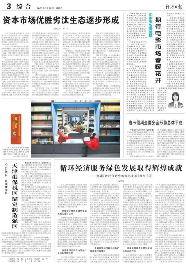 | 循环经济服务绿色发展取得辉煌成就 ——解读《新时代的中国绿色发展》白皮书 朱黎阳 近日,国务院新闻办公室发布了《新时代的中国绿色发展》白皮书(以下简称“白皮书”),全面介绍了新时代中国绿色发展理念、实践和成效,分享中国绿色发展经验。十年来,中国践行绿色发展理念,采取务实行动,推动经济社会发展绿色转型。大力发展循环经济作为绿色发展的重要举措,推动资源利用效率全面提升,为加快转变经济发展方式、建设资源节约型和环境友好型社会、推进生态文明建设发挥了不可替代的作用。 01 发展循环经济是绿色低碳发展的必由之路 发展循环经济是转变增长方式、实现可持续发展的必然选择,要大力发展循环经济,促进生产、流通、消费过程的减量化、再利用、资源化。循环经济是对“大量生产、大量消耗、大量废弃”的传统生产方式、生活方式和消费模式的根本变革,以“减量化、再利用、资源化”为原则,以低消耗、低排放、高效率为基本特征。通过对资源的高效利用和循环利用,循环经济能够大幅降低能源、水、土地消耗强度,减少污染物和温室气体排放,用最少的资源环境代价取得最大的经济社会效益,是破解资源环境约束、协同推进经济发展与环境保护、实现绿色发展的必由之路。 02 发展循环经济有力促进产业绿色低碳转型 习近平总书记强调,“在经济发展中促进绿色转型、在绿色转型中实现更大发展”。十年来,我国通过大力发展循环经济,采取材料替代、燃料替代、流程优化、产品循环等举措,持续降低资源能源消耗强度和废弃物产生强度,为重点产业绿色低碳转型提供了有力支撑。 大力推动农业循环经济,全面实施农作物秸秆综合利用行动,形成了秸秆肥料化、饲料化、燃料化、原料化和基料化“五化”利用模式。2021年我国农作物秸秆综合利用率达88.1%,比2012年增长约14个百分点。促进制造业绿色转型,推动源头减量和过程优化,打造了一批绿色工厂、绿色工业园区、绿色供应链管理企业,逐步构建起从基础原材料到终端消费品的全链条绿色产品供给体系。持续推进园区循环化改造,实施能源梯级利用、废水循环利用和固废综合利用,共建共享供气、供热、供水和污染治理等基础设施。到2021年底,75%的国家级园区和50%的省级园区开展了循环化改造,园区的资源能源消耗和污染物排放得到有效控制。提升服务业绿色化水平,升级完善快递绿色包装标准体系,推进快递包装减量化、标准化、循环化,引导生产商、消费者使用可循环快递包装和可降解包装,快递包装循环中转袋使用基本实现全覆盖。2021年,全国大宗固废综合利用率比2012年提高约16个百分点,主要资源产出率提高58%。 03 发展循环经济推动绿色产业规模持续壮大 习近平总书记强调,绿色循环低碳发展,是当今时代科技革命和产业变革的方向,是最有前途的发展领域,我国在这方面的潜力相当大,可以形成很多新的经济增长点。党的十八大以来,我国以利用生产生活中各类废弃物为主要特征的“资源循环利用产业”逐渐发展壮大,利废范围不断拓宽、产业质量不断提升、产业规模稳步扩大、科技创新能力不断加强,已成为我国绿色产业的重要组成部分,为实现绿色增长提供了产业载体。 废弃物循环利用的领域不断拓宽,几乎涵盖了从传统工农业废弃物到退役动力电池、光伏组件及风机叶片等新兴废弃物的方方面面,成为绿色产业的重要组成部分。利用方式不断优化,在使用废弃物生产传统板材、建材等的同时,利用农作物秸秆生产碳基产品,利用废塑料生产复纺涤纶长纤维,利用大宗固废生产建筑新材料等高值化途径也不断扩展,部分已实现产业化应用。聚焦工业固废、生活垃圾、城市矿产三大类典型固废利用,攻克了一批技术难题,推动技术与装备水平不断提升。产业规模稳步扩大,据粗略测算,废旧物资循环利用企业已超过10万家,大宗固废综合利用量约38亿吨,比2012年增加了约17亿吨;废钢铁、再生有色金属、废塑料、废纸等主要再生资源回收利用量达到3.85亿吨,比2012年增加了2亿吨以上。2021年,资源循环利用产业产值超过3万亿元,占国民生产总值的3%左右,带动超过3000万人就业。 04 发展循环经济引领形成绿色生活新时尚 绿色发展同每个人息息相关,需要持续提升全社会生态环保意识,培养低碳节约习惯,倡导绿色生活方式,形成全社会共同推进绿色发展的良好氛围。新时代十年来,通过大力发展循环经济,闲置经济、共享经济已融入百姓生活,生态文明理念深入人心,简约适度、绿色低碳、文明健康的生活方式广泛普及。 共享经济已成新时尚,继共享单车、共享汽车之后,共享充电宝、共享篮球、共享雨伞等共享经济新形态不断涌现。2021年,我国共享经济持续呈现出巨大的发展韧性和潜力,全年共享经济市场交易规模约3.69万亿元,共享单车用户规模达3亿人。闲置物品循环利用蔚然成风,二手商品交易平台不断发展壮大,成为电商新模式,交易产品认证测试等配套体系不断完善,交易品种几乎覆盖所有消费品品类,二手闲置市场规模已突破万亿元,用户规模达到数亿人,90后、00后成为二手商品交易主力军。垃圾分类已成为绿色生活新时尚,城市生活垃圾分类覆盖率持续提升。2021年,全国297个地级及以上城市已开展生活垃圾分类工作,居民小区垃圾分类平均覆盖率达77