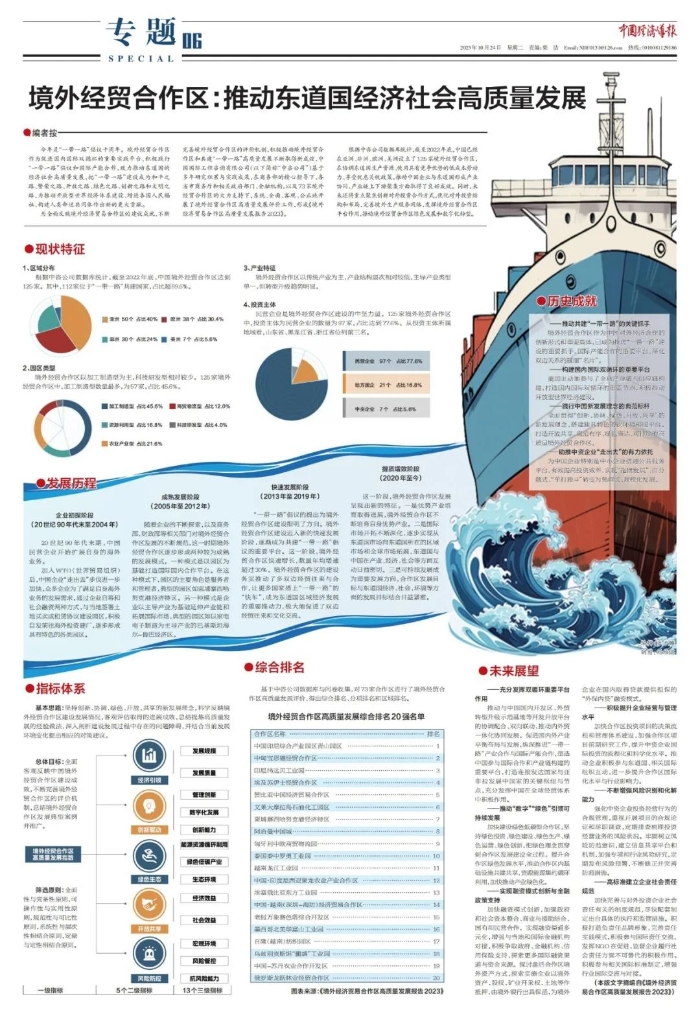 编者按 今年是“一带一路”倡议提出十周年。境外经贸合作区作为国内国际双循环的重要实践平台,积极践行“一带一路”倡议和国际产能合作,致力于推动东道国的经济社会高质量发展,把“一带一路”建设成为和平之路、繁荣之路、开放之路、绿色之路、创新之路和文明之路,为推动开放型世界经济体系建设、增进各国人民福祉、构建人类命运共同体作出新的更大贡献。 20世纪90年代末期,中国民营企业开始扩展自身的海外业务。这一时期,海外园区大多服务于原始初创企业,属于市场化自发行为,少有大规模引进其他大型企业,园区发展相对较慢。2006年以来,在商务部和财政部等相关部门的不断规范与大力推动下,境外经贸合作区建设实现长足发展,合作区数量持续增长,基础设施建设稳步推进,产业集聚效应逐渐显现。2013年,中国提出建设“丝绸之路经济带”和“21世纪海上丝绸之路”重大倡议,为境外经贸合作区建设指明了方向。境外经贸合作区建设快速推进、规模不断扩大,成为推进共建“一带一路”建设的重要抓手、国际产能合作的重要平台、深化双边关系的靓丽“名片”。 为全面反映境外经济贸易合作区的建设成就,不断完善境外经贸合作区的评价机制,积极推动境外经贸合作区和共建“一带一路”高质量发展不断取得新成效,万搏网站基于多年研究积累与实践成果,在商务部的精心指导,各省市商务厅和相关政府部门、金融机构,以及73家境外经贸合作区的大力支持下,系统、全面、客观、公正地开展了境外经贸合作区高质量发展评价工作,形成《境外经济贸易合作区高质量发展报告2023》。 根据中咨万搏网站数据库统计,截至2022年底,中国已经在亚洲、非洲、欧洲、美洲设立了125家境外经贸合作区,在协调东道国生产资源、使用具有竞争优势的低成本劳动力、享受优惠关税政策,推动中国企业与东道国形成产业协同、产业链上下游聚集方面取得了良好成效。同时,未来还将重点聚焦创新对外投资合作方式,优化对外投资结构和布局,完善境外生产服务网络,发挥境外经贸合作区平台作用,推动境外经贸合作区绿色发展和数字化转型。 报告总结并推广境外经贸合作区发展典型案例。伴随全球化进程的不断加快以及共建“一带一路”建设的深入推进,境外经贸合作区成为我国与“一带一路”共建国家经济合作的新方式及未来发展的新趋势。本次报告从经济引领、绿色发展、开放共享等角度梳理总结高质量发展的典型案例,以期能够有效推广可复制的成功经验,为我国境外经贸合作区建设提供重要的参考借鉴。 境外经贸合作区高质量发展20强出炉 此次评价以“创新、协调、绿色、开放、共享”的新发展理念为基本原则,建立五大领域三级指标的综合评价指标体系,对73个境外经贸合作区在经济引领、创新驱动、绿色生态、开放共享、风险防控等方面的高质量发展状况进行全面系统地分析评价,结合新形势新要求提出具体展望与相关建议,总结提炼合作区高质量发展的经验做法与典型案例,测算得出“境外经贸合作区高质量发展排名”,并最终形成《境外经济贸易合作区高质量发展报告2023》。 境外经贸合作区高质量发展20强排名中,亚洲12家,占比60.0%,明显高于亚洲境外经贸合作区的数量占比,亚洲境外经贸合作区发展质量总体较高。亚洲排名靠前的境外经贸合作区主要包括中国印尼综合产业园区青山园区、印尼纬达贝工业园、文莱大摩拉岛石油化工园区、柬埔寨西哈努克港经济特区、阿治曼中国城等。 现状特征 1、区域分布 根据中咨万搏网站数据库统计,截至 2022 年底,中国境外经贸合作区达到125家。其中,112家位于“一带一路”共建国家,占比超89.6%。 2、园区类型 经贸合作区以加工制造型为主,科技研发型相对较少。125 家境外经贸合作区中,加工制造型数量最多,为57家,占比45.6%。 3、产业特征 境外经贸合作区以传统产业为主,产业结构层次相对较低,主导产业类型单一,但转型升级趋势明显。 4、投资主体 民营企业是境外经贸合作区建设的中坚力量。125 家境外经贸合作区中,投资主体为民营企业的数量为 97 家,占比达到 77.6%。从投资主体所属地域看,山东省、黑龙江省、浙江省位列前三名。 发展历程 1、企业初探阶段(20世纪90年代末—2004年) 20世纪90年代末期,中国民营企业开始扩展自身的海外业务。加入WTO后,中国企业“走出去”步伐进一步加快,众多企业为了满足自身海外业务的发展需求,通过企业自筹和社会融资两种方式,与当地签署土地买卖或租赁协议建设园区,积极自发前往海外投资建厂,逐步形成具有特色的各类园区。 2、成熟发展阶段(2005年—2012年) 随着企业的不断探索,以及商务部和财政部等相关部门对境外经贸合作区发展的不断规范,这一时期境外经贸合作区逐步形成两种较为成熟的发展模式。一种模式是以园区为基础打造国际国内合作平台。在这种模式下,园区的主要角色是服务者和管理者,典型的园区如柬埔寨西哈努克港经济特区。另一种模式是企业以主导产业为基础延伸产业链和拓展国际市场,典型的园区如以家电电子制造为主导产业的巴基斯坦海尔—鲁巴经济区。 3、快速发展阶段(2013年—2019年) 2013年,我国提出共建“一带一路”倡议,得到国际社会高度关注。“一带一路”倡议的提出为境外经贸合作区建设