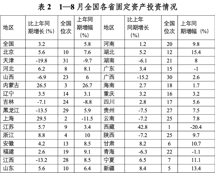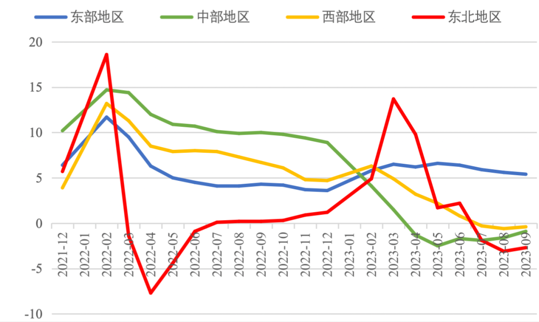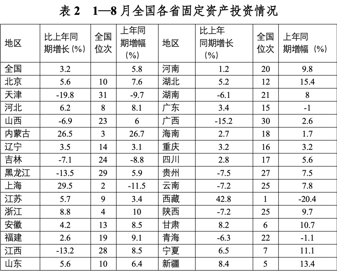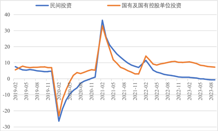 2023年前三季度,我国经济运行持续恢复向好,投资对优化供给结构的关键作用显著增强,高技术产业投资保持较快增长,基础设施投资、制造业投资稳投资支撑作用进一步发挥。同时,当前稳投资也面临新的困难挑战,尤其是房地产市场深度调整导致房地产开发投资和民间投资承受较大下行压力。下一步仍需精准有力加强逆周期调控,不断拓展促投资政策空间,重点围绕提振房地产市场、推动制造业转型升级、激发民间投资活力等方面,继续夯实投资复苏基础。 一、固定资产投资整体运行情况 (一)整体投资保持平稳增长态势 2023年1—9月,我国固定资产投资(不含农户,下同)375035亿元,同比增长3.1%,较国内生产总值增速低了2.1个百分点,较上半年增速低了0.7个百分点,固定资产投资增速持续放缓。从投资构成看,上半年建安工程、设备工器具购置、其他费用分别增长2.4%、6.8%、3.1%。设备工器具购置保持较快增长,反映在各类政策工具支持引导下,企业设备购置、技术改造投入力度加大。 图1 全国固定资产投资增速(%) 数据来源:国家统计局 (二)民间投资意愿和能力仍待恢复 2023年1—9月,民间固定资产投资为193399亿元,同比下降0.6%,较上半年低了0.4个百分点,低于投资整体增速3.7个百分点。从季度波动看,民间固定资产投资的增速由2022年第一季度的8.4%持续下滑,并连续两个季度负增长。民间固定资产投资占比进一步萎缩,跌至2011年以来的最低点,仅为51.57%。 图2 民间投资增速及占比(%) 数据来源:国家统计局,Wind数据库 国家统计局发布信息显示,房地产投资中约80%为民间投资。受房地产市场深度调整影响,民间投资动力和能力相对不足,国有及国有控股单位投资增速连续20个月高于民间投资增速。2023年1—9月,国有及国有控股单位同比增长7.2%,较民间投资增速高了7.8个百分点。 图3 民间投资、国有及国有控股单位投资增速(%) 数据来源:国家统计局,Wind数据库 (三)制造业投资保持较快增长,基础设施补短板投入加大 2023年1—9月,制造业和基建投资保持较快增长,房地产投资持续负增长,且降幅有所扩大。基础设施投资在专项债等融资支持政策以及重大项目支撑下,效果持续显现,前三季度基础设施投资同比增长8.64%,高于全部投资5.54个百分点,是三大类投资中增长最快的领域。其中,铁路运输业、仓储业投资分别大幅增长22.1%、27.7%。截至9月底,新增地方政府专项债已发行超过3.1万亿元,完成全年专项债额度的80%以上,对基础设施投资形成较强支撑。1—9月份,计划总投资亿元及以上项目投资同比增长10.2%,较1—8月快了0.3个百分点,对全部投资增长的贡献率达169.2%,大项目投资带动作用明显。 数据来源:国家统计局,Wind数据库 2023年1—9月,制造业投资同比增长6.2%,比整体投资高3.1个百分点。其中,高技术制造业投资同比增长11.3%,对制造业投资拉动作用明显,表明我国制造业加速转型升级。9月,制造业采购经理指数(PMI)为50.2%,比上月上升0.5个百分点,重返扩张区间。生产指数和新订单指数均高于临界点,分别为52.7%和50.5%,表明制造业生产和市场需求稳步回升。装备制造业、高技术制造业PMI分别为50.6%、50.1%,均位于扩张区间。从企业规模看,大、中、小型企业PMI分别为51.6%、49.6%和48%,其中大型企业PMI较上月回升0.8个百分点,为近6个月高点,表现出强劲恢复发展动能。 图4:制造业PMI指数(%) 数据来源:国家统计局,Wind数据库 2023年1—9月,房地产开发投资增速持续放缓,房地产开发投资、住宅开发投资分别同比下降9.1%、8.4%。房地产开发投资占固定资产投资完成额的比重降至23.3%,较上半年下降0.8个百分点,为今年以来最低值。房屋施工面积、房屋新开工面积等先行指标均出现明显下滑,分别同比下降7.1%、23.4%。1—9月,国房景气指数均位于100以下,自4月以来持续走低。 图5 三大领域固定资产投资增速(累计同比,%) 数据来源:国家统计局,Wind数据库 (四)东部地区投资保持较快增长,东北地区投资下滑明显 从投资地域看,三季度东北地区投资转为负增长,1—9月累计同比下降2.7%,较全国水平低了5.8个百分点。东部地区投资同比增长5.4%,保持较高增速。西部地区投资同比微降0.4%,增速由正转负。中部地区投资同比下降0.9%,降幅较上半年收窄0.8个百分点。 图6 分地区固定资产投资增速(累计同比,%) 数据来源:国家统计局,Wind数据库 1—8月,31个省份中有15个省投资增速高于全国水平,其中西藏、上海、内蒙古等3省实现两位数增长,增速分别达42.8%、29.5%、26.5%,投资恢复动力较强。天津、山西、吉林、黑龙江、江西、山东、湖南、广西、贵州、云南、陕西、青海等12省出现负增长,其中天津、广西、黑龙江、江西降幅最大,分别同比下降19.8%、15.2%、13.5%、13.2%。 数据来源:国家统计局,Wind数据库 二、主要问题 (一)房地产投资持续低迷加剧市场信用风险 一是房企信用风险增加制约融资能力。房企普遍采取的高负债、高周转运营模式,积累了较高的杠杆风险,房地产开发项目存量资产普遍存在融资抵押且抵押率较高的情况,导致房地产债务重组等风险化解方式推进困难,房企的信用修复过程缓慢,进一步导致融资困难。1—9月,房地产开发企业国内贷款和自筹资金分别同比下降11.1%和21.8%。二是房企流动性风险向产业链上下游传导。房地产业涉及行业多、产业链条长,行业不景气间接拖累了上下游民营企业投资。恒大