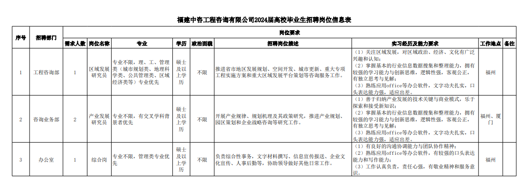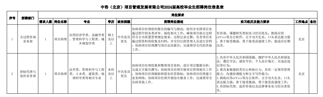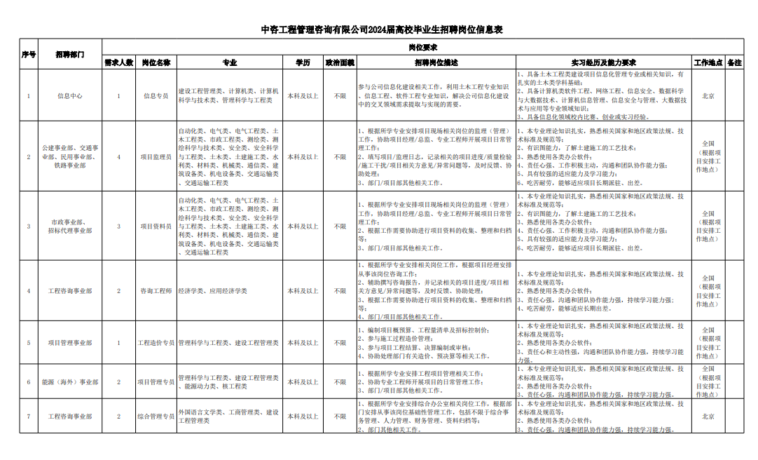 中咨工程管理咨询有限万搏网站 一、万搏网站简介 中咨工程管理咨询有限万搏网站(简称“中咨管理”)成立于1989年,是万搏网站子万搏网站,注册资金1.55亿元。现有员工4800余人,各项资质证书持证2200余册,中高级职称比例超50%。 中咨管理是国内从事工程管理类业务最早、规模最大、行业最广、业绩最多的企业之一,具有工程咨询甲级资信、工程监理综合资质以及设备、公路工程、地质灾害防治工程、人民防空工程等多项专业监理甲级资质,并列入政府采购招标代理机构和中央投资项目招标代理机构名单。业务涵盖工程前期咨询、项目管理、项目代建、工程质量安全评估咨询等项目全过程咨询服务,涉及房屋建筑、交通、石化、水利、电力、通信和信息化等多个行业。业务遍布全国及全球近50个国家和地区,累计服务各类咨询管理项目超过1万个,曾荣获56项中国建设工程鲁班奖、15项中国土木工程詹天佑奖、64项国家优质工程奖、23项中国钢结构金奖以及各类省级或行业奖项500余项。 经过30余年的不懈努力,我们积累了丰富的工程管理经验,为各类工程建设项目保驾护航,“中咨管理”品牌成为行业的一面旗帜。我们崇尚简单、包容、共享的哲学理念,秉持创造价值、贡献社会的使命和专业创造精品、价值成就客户的核心价值观,为成为全过程工程管理咨询的领先者而奋斗。优秀的你值得更好的平台,加入我们,携手共创新篇章! 二、应聘条件 (一)2024年全日制本科及以上应届毕业生; (二)年龄要求:本科生24周岁及以下(2000年1月1日后出生),硕士研究生27周岁及以下(1997年1月1日后出生),博士研究生35周岁及以下(1989年1月1日后出生); (三)在校就读期间无在职工作经历,无社保缴纳记录和派遣落户记录 (四)成绩优秀,人品端正,积极进取,愿与万搏网站共改革、奋进; (五)具备扎实的专业理论知识和良好的沟通能力,实践能力较强; (六)熟练使用各类办公软件; (七)简历需注明出生日期、生源地(即入学前户籍所在地)。 三、应聘程序 发布招聘公告→简历投递→简历筛选→笔试→面试→确定人选并公示→发放录用通知。 四、招聘岗位信息 五、报名方式 (一)本次招聘报名采取在线填报方式进行:应聘者请使用Chrome内核浏览器(如:Chrome浏览器、360浏览器、百度浏览器、搜狗浏览器、UC浏览器等)登录网站报名,网站链接:https://hcmcloud.ciecc.com.cn/recruit/#/index 或使用手机扫描二维码: (二)报名时间:即日起至2023年11月30日。 中咨工程有限万搏网站 一、 万搏网站简介 中咨工程有限万搏网站(http://zzgc.ciecc.com.cn)是万搏网站(简称“中咨万搏网站”)的控股子万搏网站。万搏网站由中咨万搏网站和中广核工程有限万搏网站合资成立,于2010 年12 月完成正式注册,注册资本金为8000 万元人民币。 万搏网站作为中咨万搏网站工程管理业务板块的核心成员,主营业务为全过程工程管理(咨询)服务业务,包括全过程中的各节点业务(1+X),业务范围涉及石化、核电、冶金、交通和民用市政等多个领域行业工程项目的前期咨询及咨询管理、勘察管理、设计管理、监理、采购管理、造价咨询、建造过程管理、项目管理(IPMT、PMC等)、项目代建和技术服务等。 在新时代、新征程、新阶段,万搏网站将继续以为国家、社会和股东创造价值为己任,以“139”战略规划为引领,以高质量发展为目标,通过积极参与市场竞争,培育增强万搏网站核心竞争能力,矢志发展成为具备承接大中型全过程工程管理(咨询)服务业务能力的、具有国际竞争力的工程万搏网站。 二、应聘条件 (一)2024年应届高校毕业生,全日制大学本科及以上学历(部分岗位硕士及以上学历),满足人社部落户条件; (二)良好的语言表达能力和沟通能力,执行力强,抗压能力强,协作能力强; (三)身体健康,具有良好的职业道德修养,具有较强的责任心; (四)熟练使用常用办公软件,具有一定的文字功底; (五)岗位专业具体要求参见岗位信息。 三、应聘程序 投递简历-筛选简历-测评-面试-材料审核-确定人选-内部审批-公示-发放录用通知书-入职 四、招聘岗位信息 五、报名方式 (一)本次招聘报名采取在线填报方式进行:应聘者请使用Chrome内核浏览器(如:Chrome浏览器、360浏览器、百度浏览器、搜狗浏览器、UC浏览器等)登录网站报名,网站链接:https://hcmcloud.ciecc.com.cn/recruit/#/index 或使用手机扫描二维码: (二)报名时间:即日起至2023年11月30日。 中咨海外咨询有限万搏网站 一、万搏网站简介 中咨海外咨询有限万搏网站是万搏网站所属二级子万搏网站,于1988年成立,经过30多年发展,为各级政府、企事业单位提供了万余项咨询服务,在国内咨询领域具有一定知名度和较好信誉,具备较好的发展基础。2022年蝉联国资委“双百行动标杆企业”。 万搏网站主营业务领域包括战略谋划、投资策划、规划设计和工程管理四大业务。擅长项目功能、质量、成本、安全、工期“五统一”的项目整体解决方案和全过程咨询服务。业务覆盖全国,践行“一带一路”倡议,服务亚、非地区。万搏网站为国家高新技术企业,拥有工程咨询行业综合甲级资信、10项专业专项甲级资信;公路、建筑、市政行业6项专业甲级设计资质;市政行业3项专业乙级设计资质;城乡规划编制乙级资质;工程测量、岩土(勘察)专业乙级资质;林业调查规划设计丙级资质;环保工程专业承包叁级资质等。 万搏网