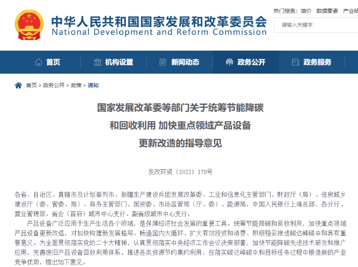 扩大产品设备更新改造有效需求 推动制造业高品质供给 助力实体经济高质量发展 ——《关于统筹节能降碳和回收利用 加快重点领域产品设备更新改造的指导意见》解读 万搏网站 潘小海 产品设备作为日常生产生活中不可或缺的工具,是保障经济社会发展的重要基础,具有应用范围广、保有量大、能耗量高、再生资源蕴藏丰富等特点。近日,国家发展改革委等9部门联合印发了《关于统筹节能降碳和回收利用 加快重点领域产品设备更新改造的指导意见》(发改环资〔2023〕178号,以下简称《指导意见》),对相关工作进行部署,明确了总体要求、工作目标和重点任务,有利于畅通国内大循环、加快发展方式绿色转型、积极稳妥推进碳达峰碳中和、助推经济社会高质量发展。 01 加快产品设备更新改造和回收利用是畅通国内大循环的重要手段 加快构建以国内大循环为主体、国内国际双循环相互促进的新发展格局,是以习近平同志为核心的党中央作出的重大战略决策。去年底召开的中央经济工作会议将着力扩大内需放在2023年重点工作任务首位。近期,习近平总书记在中央政治局第二次集体学习时强调,要搞好统筹扩大内需和深化供给侧结构性改革,形成需求牵引供给、供给创造需求的更高水平动态平衡,实现国民经济良性循环。 从经济发展规律来看,大国经济具有内需为主导的显著特征。我国市场上的产品设备种类多、应用范围广,对促进国内消费、带动经济增长具有重要作用,是实施扩大内需战略的重要着力点。仅以家用电器为例,有关行业协会数据显示,我国主要家用电器保有量已超过20亿台,2021年家用电器市场规模达8811亿元,家用电器行业规模以上企业营业收入1.7万亿元。 《指导意见》首批聚焦锅炉、电机、电力变压器、制冷、照明、家用电器等6类产品设备,多措并举支持企业开展更新改造,推动淘汰低效落后产品设备,加强节能降碳先进技术推广应用,完善废旧产品设备回收利用体系。相关举措有助于发挥我国超大规模市场优势,孕育不同领域、不同层次、不同群体对高效节能产品设备的有效需求,带动设计、生产、应用、回收、处置全链条发展,带动产业投资,增加就业岗位,进一步激发国内市场巨大活力。 畅通国内大循环离不开需求侧消费牵引,也需要供给侧提质升级。《指导意见》紧紧扭住深化供给侧结构性改革这条主线,提出发展一批高效节能产品设备生产骨干优势企业及生产制造集聚区,通过强化财政、税收、金融等政策支持,引导企业优化产品结构,提升高效节能产品设备市场供给,筑牢产品设备消费升级基础。相关举措将推动产品设备供需两侧有机结合,以高效节能产品的消费需求倒逼供给,以高品质供给驱动消费需求,形成供需良性循环和动态平衡。 02 加快产品设备更新改造和回收利用是积极稳妥推进碳达峰碳中和的必然选择 节能是最直接、最有效、最经济的降碳举措;循环经济以“减量化、再利用、资源化”为原则,与节能降碳具有显著的协同效应;两者都是实现碳达峰碳中和目标的重要途径。我国重点领域产品设备节能降碳更新改造潜力巨大。以锅炉为例,截至2021年底,我国各类锅炉保有量约35万台,碳排放量占比较高。据测算,工业锅炉平均运行热效率提高5个百分点、电站锅炉平均运行热效率提高0.5个百分点,可实现年节能量约3000万吨标准煤。同时,废旧产品设备蕴藏着丰富的铁、铜、铝、铅、锌等再生金属资源,是巨大的“城市矿产”,回收利用价值高。 《指导意见》的突出特点,是坚持产品设备更新改造和回收利用齐头并进。《指导意见》落实全面节约战略,一手抓前端产品设备更新改造,一手抓后端回收利用体系建设,着力打通生产、使用、更新、淘汰、回收利用全链条。相关举措将推动节能降碳从单个环节、部分领域转向全流程系统发力,使资源节约渗透到产品设备生产、消费、回收利用的每一个环节,实现能尽其用、物尽其用,从而为积极稳妥推进碳达峰碳中和提供有力支撑。 03 加快产品设备更新改造和回收利用将为发展方式绿色转型注入强大动能 一方面,《指导意见》关注当前,首批聚焦实施条件相对成熟、示范带动作用较强的6类产品设备,以《重点用能产品设备能效先进水平、节能水平和准入水平(2022年版)》和现行能效强制性国家标准为基本依据,率先推动更新改造和回收利用。另一方面,《指导意见》着眼长远,提出将及时总结工作成效和可行模式,逐步扩大更新改造范围。根据产业发展阶段和技术进步,实行能效水平动态转化,不断完善产品设备能效和淘汰标准。此外,《指导意见》提出要加强关键共性技术研发,推动形成一批具有自主知识产权和核心竞争力的节能降碳先进技术,有利于突破节能降碳、资源循环利用先进技术和产品供给的堵点、卡点、脆弱点,提高生产制造和回收利用产业发展水平,在落实碳达峰碳中和目标任务过程中锻造新的产业竞争优势。 总的看,《指导意见》以产品设备更新改造和回收利用为切入点,统筹当前与长远,兼顾节能降碳与经济增长,将推动走出一条资源消耗做“减法”、经济发展做“加法”的新路子。作为一名长期在节能降碳领域奋战的咨询工作者,我相信《指导意见》的出台,将进一步凝聚各方力量,开创产品设备更新改造和回收利用协同发力新局面,为畅通国内大循