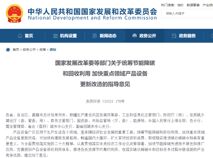 坚持系统观念 着力精准施策 加快完善废旧产品设备回收利用体系 ——《关于统筹节能降碳和回收利用 加快重点领域产品设备更新改造的指导意见》解读 朱黎阳 完善废旧产品设备回收利用体系,是贯彻落实党的二十大报告关于“实施全面节约战略,推进各类资源节约集约利用,加快构建废弃物循环利用体系”的重要举措。近日,国家发展改革委会同有关部门印发了《关于统筹节能降碳和回收利用 加快重点领域产品设备更新改造的指导意见》(发改环资〔2023〕178号,以下简称《指导意见》),明确了统筹推进产品设备更新改造和回收利用的目标任务、政策措施和实施指南,是指导各地区和有关行业企业做好相关工作的重要文件。 01 坚持系统施策,破解回收难题 当前,我国正处在工业化和城镇化深化发展的关键阶段,将迎来新一轮产品设备更新升级高峰。随着一批高性能、高效率、高质量新产品投用,与之相应将有一批产品设备陆续退役。回收利用是产品设备全生命周期中的重要一环,规范回收是实现各类废旧产品设备“物尽其用”的必要前提。如何实现成批废旧产品设备的循环利用是摆在各方面前的现实问题。 《指导意见》坚持系统观念,顺应产业发展趋势和特点,精准把握产业发展需求,以“规范化、规模化、精细化”为导向,结合产品设备更新潜力、废旧设备利用途径等,从产品设备更新改造到回收、拆解、利用等各个环节,系统性提出完善回收利用体系的细化要求,强化资金、政策、标准、技术、监管等全方位支撑保障,具有较强的指导性和可操作性。加快完善废旧产品设备回收利用体系,补齐废旧产品设备循环利用产业链短板,对提升废弃物循环利用水平和协同推进降碳、减污、扩绿、增长具有重要意义。 02 坚持依法依规,强化规范回收 “规范化”是完善废旧产品设备回收利用的第一优先导向。《指导意见》强调,要尊重客观规律,坚守安全底线,坚持依法依规,规范开展废旧产品设备回收处置,并细化提出相关要求。 一是规范处置国有资产。要落实国务院国资委《关于企业国有资产交易流转有关事项的通知》要求,完善国有废旧产品设备资产处置制度,推动企业高效、规范处置相关资产。二是规范开展回收经营活动。相关企业要按照《再生资源回收管理办法》有关要求,进行再生资源回收经营者备案等。三是依法依规开展报废处置。相关主体应严格落实法律法规和标准要求,规范处置属于强制淘汰、存在严重事故隐患、无改造维修价值的报废产品设备,杜绝通过二手交易等方式重新流入市场。四是严格遵守生态环境保护相关法律法规和标准要求。比如,涉及处置含油变压器的,应有废油回收储存设备和相关处理措施;从事制冷剂回收利用等经营活动的,应严格落实《消耗臭氧层物质管理条例》有关要求;从事属于危险废物的含汞废旧照明设备回收利用经营活动的,应具有危险废物经营许可证等。 03 坚持多方联动,力争应收尽收 退役产品设备的型号多、数量大、分布广,涉及各地区、各行业、各领域。以往在实践中,一些退役产品设备存在规范回收利用比例较低、长期闲置、进入不规范拆解处置渠道等问题。为统筹推进产品设备更新改造和回收利用,《指导意见》坚持问题导向,精准施策,有针对性地提出了实现“规模化”回收的若干举措。 一是加强信息共享。要求各地按照市场化法治化原则,组织开展废旧产品设备回收处置供需对接,打破回收利用的信息壁垒。二是探索新型回收模式。支持发展废旧产品设备回收、运输、拆解、利用一体化模式。同时发挥制度和体制优势,支持供销社系统探索废旧产品设备回收利用的先进模式。三是开展机制创新。在家用电器领域实施“生产企业回收目标责任制”,鼓励各地建立“资源循环利用重点企业联系制度”。这些新举措的提出和实施,将有助于解决长期制约废旧产品设备规范回收利用的堵点和难点。 04 坚持多措并举,推动精细回收 相对于其他废弃物,废旧产品设备残值较高,利用途径多元。《指导意见》强调要坚持节约集约,坚持以“精细化”为重要导向,完善废旧产品设备回收利用体系。 一是供需对接的精细化。鼓励各级公共资源交易平台开设专栏、开辟绿色通道,畅通废旧产品设备资产交易,支持发展“互联网+”模式,培育废旧产品设备线上交易平台,通过信息技术的广泛应用,实现点对点的精细回收。二是拆解处理的精细化。要求推广废旧产品设备精细拆解、复合材料高效解离等技术。三是政策指导的精细化。《指导意见》对锅炉、电机、电力变压器、制冷、照明、家用电器等六类重点产品设备分别制定了“更新改造和回收利用实施指南”,做到了“一品一策、精准施策”。 2023年是贯彻党的二十大精神的开局之年,是实施“十四五”规划承前启后的关键一年。《指导意见》坚持系统观念,统筹推进产品设备更新改造和回收利用,以六个重点产品为突破口,抓住了废弃物的重点品种,通过小切口作出大文章。《指导意见》的出台实施,将为统筹推进节能降碳和回收利用,加强各类资源节约集约循环利用,推动经济社会发展全面绿色转型作出积极贡献。 注:原文载自国家发展改革委微信客户端。 | |||||