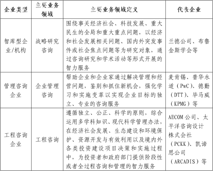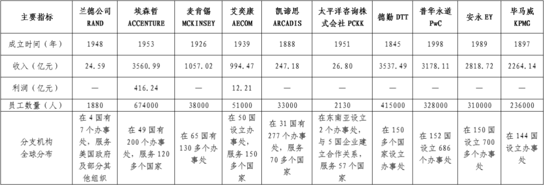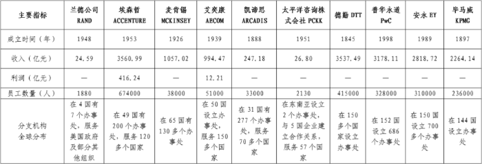 (三)研究思路 重点围绕经营规模、全球战略布局、集团化发展、数字化发展、人才培养等方面开展对比研究,为中咨万搏网站打造世界一流咨询机构提出初步的方向性战略构想,更好地服务万搏网站高质量发展总体战略。充分发挥龙头示范作用,加强精细化管理,全面提升核心竞争力,助力中咨万搏网站加快建设成为国内有权威、国际有影响的国家高端智库、世界一流咨询机构,体现智库型中央企业的使命担当。 二、经营规模现状分析 (一)对比企业经营规模情况 1.智库型企业 兰德万搏网站(RAND)是全球顶级智库型企业之一。兰德万搏网站成立于1948年,总部设在美国加利福尼亚州的圣莫尼卡,是国际最知名的非营利性的研究机构之一,被誉为现代智囊的“大脑集中营”“超级军事学院”,致力于以严谨的分析研究来推进决策与政策制定。拥有来自50多个国家的1880多名员工,半数以上的研究人员持有一个或多个博士学位,在2020年全球顶级智库综合榜单中排名第七,2021年总收入为24.59亿元(折人民币)。 业务领域范围较广。兰德万搏网站资金来源广泛,目前军队、政府的资助仍然超过一半以上。兰德万搏网站主要为美国军方、美国政府机构、基金会、高校以及私营企业等提供咨询服务,研究领域主要涉及军事科技、国家安全、国际事务、公共安全、法律与商业、教育、健康、基础设施、交通、能源、环境、网络通讯、数据科学、社会公平等。 2.管理咨询企业 埃森哲(ACCENTURE)。埃森哲成立于1953年,是一家全球领先的专业服务万搏网站,在数字化、云计算与网络安全领域拥有全球领先的能力。埃森哲秉承“科技融灵智,匠心承未来”的企业使命,致力于通过引领变革创造价值,为客户、员工、股东、合作伙伴与整个社会创造美好未来。埃森哲凭借独特的业内经验与专业技能,以及翘楚全球的卓越技术中心和智能运营中心,为客户提供战略和咨询、互动体验、技术服务和智能运营等全方位服务,业务涵盖40多个行业,以及企业日常运营部门的各个职能。埃森哲是《财富》全球500强企业之一,在全球49个国家设立了200多个办事处,服务于120多个国家的客户,拥有674000多名员工,2021年总收入为3560.99亿元(折人民币)。 麦肯锡(MCKINSEY)。麦肯锡成立于1926年,其定位是帮助领先的企业机构实现显著、持久的经营业绩改善,打造能够吸引、培育和激励杰出人才的优秀组织机构。主营业务是为客户特别是企业设计、制定相配套的一体化解决方案,包括战略开发、经营运作、组织结构等,业务范围涉及汽车、银行、能源、保健、保险、制造、公共事业、零售、电信和交通等领域。目前拥有来自80多个国家38000多名员工,2021年总收入为1057.02亿元(折人民币)。 德勤(DTT)。德勤成立于1845年,是全球领先的专业服务机构,世界四大会计师事务所之一。德勤品牌连续第四年被Brand Finance(品牌金融)评为全球最具影响力及最具价值商业服务品牌,入选全球最佳雇主榜单,为近90%的《财富》全球500强企业以及数千家民营企业提供专业服务。德勤业务范围包括审计和鉴证、税务和法律、咨询、财务咨询和风险咨询服务等,涉及消费品行业、能源、资源与工业、金融服务、政府与公共服务、生命科学与医疗保健、技术、媒体与电信等领域。德勤在全球150多个国家设立办事处,拥有415000多名员工,2021年总收入为3537.49亿元(折人民币)。 普华永道(PwC)。普华永道成立于1998年,是一家致力于“在社会中建立信任并解决重要问题”的全球专业服务联盟组织。在中国注册会计师协会《2021年度会计师事务所综合评价百家排名信息》中,普华永道连续第十九年(2003年~2021年)蝉联该项排名第一。普华永道主营业务包括战略变革,流程优化和技术解决方案等,业务范围涉及航空航天、国防与安全、汽车、资本项目和基础设施、消费市场、能源、公用事业和资源、工程与建筑、金融服务、政府和公共服务、医疗、酒店与休闲、工业制造、保险、制药与生命科学、私募股权、运输与物流等领域。普华永道在152个国家/地区设有686个办事处,拥有近328000多名员工,2021年总收入为3178.11亿元(折人民币)。 安永(EY)。安永成立于1989年,是全球领先的审计、咨询、税务、战略与交易的专业服务机构之一,致力于帮助客户、员工及社会各界创造长期价值,同时在资本市场建立信任。2020年全球最具价值500大品牌榜安永排名第66位,福布斯2020全球品牌价值100强安永名列第98位。安永业务范围包括战略与交易、咨询、人力资源和劳动力服务、审计、税务、法律、科技、管理服务、私人企业服务、可持续发展服务等,涉及先进制造和智慧出行、消费品和零售业、能源和资源、金融服务、政府和基础设施、生命科学与医疗健康、私募基金、技术、媒体和电信等领域。安永在全球150个国家设立700多个办事处,拥有310000多名员工,2021年总收入为2818.72亿元(折人民币)。 毕马威(KPMG)。毕马威成立于1897年,是一个由独立的专业成员所组成的全球性组织,提供审计、税务和咨询等专业服务。毕马威通过帮助其他组织降低风险和把握机遇,为客户、员工乃至整个社会推动积极、可持续的变革。毕马威业务范围包括审计和鉴证、税务和法律、咨询、私营企业等,涉及金融服务、消费者与零售、工业制造、能源与自然资源、基础设施、政府、医疗保健和生命