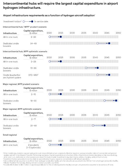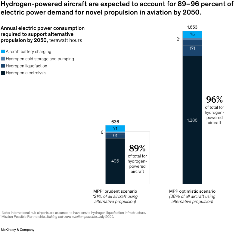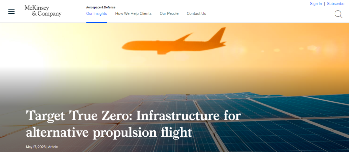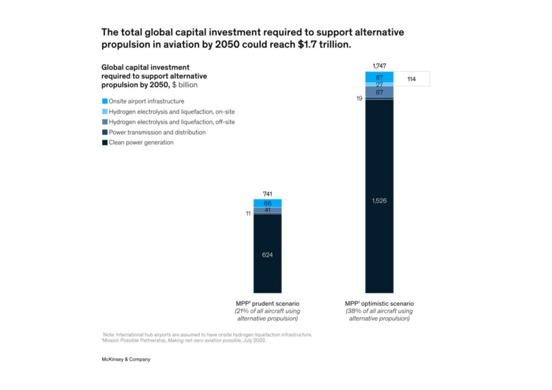| 随着对解决航空业气候影响的解决方案的寻求变得更加迫切,人们对例如氢气、电池电力和混合电力驱动飞机等新型推进技术产生了极大的兴趣。根据MPP对航空业能源的估计,到2050年,电池电力和氢动力飞机可能占所有飞机的21%-38%,占该行业整体能源需求的15%-34%。虽然时间上可能感觉很遥远,但这一新技术将在这十年内出现。 针对这些基础设施的变化,以及机场和其他利益相关方如何开始准备,仍存在不确定性。近期,麦肯锡发布了《瞄准低碳:为电池和氢动力飞机提供基础设施》的报告,旨在帮助人们了解影响新型推进器的一些关键考虑因素。
