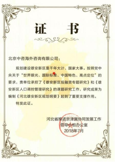 雄安新区位于北京、天津、保定之间,是连接京津冀的重要枢纽,也是推进高质量发展的全国样板。设立河北雄安新区,是以习近平同志为核心的党中央深入推进京津冀协同发展作出的一项重大决策部署,是千年大计、国家大事。“京津冀如同一朵花上的花瓣,瓣瓣不同,却瓣瓣同心。”习近平总书记的话情真意切,寓意深长。服务雄安地区高质量发展是中咨万搏网站的职责所在、优势所在,更是中咨万搏网站服务国家战略、践行智库使命的初心所在。 雄安新区的建设,需要紧紧围绕“人”这个核心谋篇布局,牢牢抓住“钱”这个支撑要素。2017年5月,受河北省推进京津冀协同发展领导小组办公室委托,中咨海外万搏网站承担了《雄安新区人口调控管理研究》《雄安新区投融资研究》2项课题研究工作。在时任中咨海外万搏网站副总经理徐小元领导和组织下,中咨海外万搏网站迅速成立覆盖多学科、跨部门的专业研究团队,专题开展雄安新区人口调控管理和投融资研究工作。 人口调控管理项目团队首先面临的难题是雄安新区人口规模预测无据可依、无从下手。雄安新区的定位与传统城市存在较大差异,若采取自然增长率数学模型对人口规模进行测算,难以适应雄安新区“未来之城”建设需求,最终影响课题研究成果科学性和合理性。为此,项目团队集中办公,日夜奋战,历时半年,终于建立了“需求+约束”人口规模预测模型,科学解决了雄安新区人口规模预测的难题;同时,对雄安新区人口调控提出阶段性安排措施,既体现人口全过程调控的思想,又体现坚持行政推动和市场引导相结合的原则;创新人口调控管理机制,为雄安新区人口科学管理提供切实可行的政策依据。 雄安新区投融资研究团队面对复杂的投资建设需求,从深入开展调查研究起步,收集大量政府投资项目综合指标数据、项目库积累的类似项目资料以及相关城市建设投资指标经验值。本着高标准高质量的建设要求,遵循城市规划建设规律,按照区域空间、资金来源、建设时序等诸多因素,将新区建设内容及规模设计成网络模型,以资金需求总盘子为目标,以建设标准、造价水平为基础依据,立足新区定位,叠加国内外先进经验,最终建立新区投资需求测算模型,形成12大板块54个子项的测算体系。同时,项目团队在设计资金平衡方案过程中,总体理念实现从建设期资金平衡到城市发展总体平衡的转变,充分考虑城市发展的代际、阶段、行业等因素,为新区未来财税创新留出空间。 有志者事竟成。中咨海外万搏网站交出了一份满意答卷,获得河北省委省政府的充分肯定,为《河北雄安新区规划纲要》(2018年4月14日中共中央、国务院批复)的编制起到重要支撑作用,加快推动新区投融资政策创新集成,建立新区长期稳定的资金筹措机制,整体提高新区资金统筹能力,为雄安新区未来发展作出重要贡献。研究成果获得“中咨万搏网站优秀咨询成果三等奖”及“全国优秀工程咨询成果一等奖”。