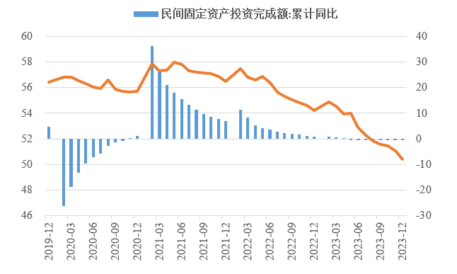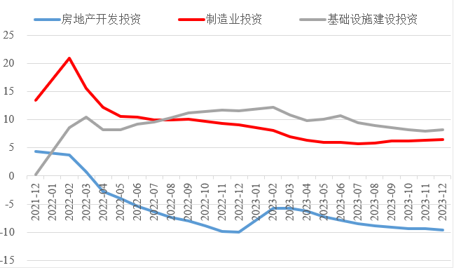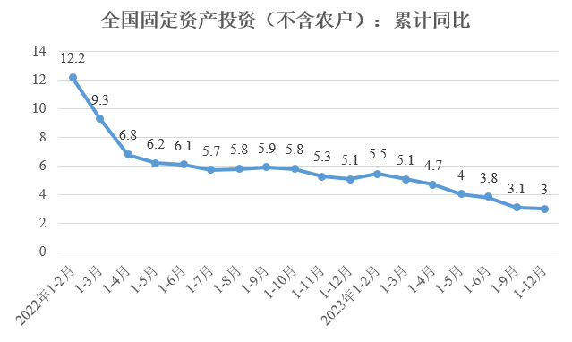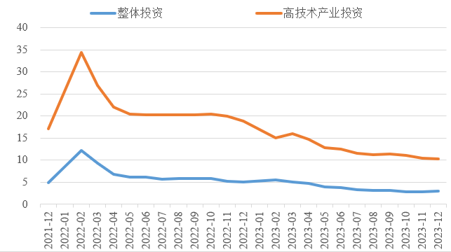 2023年,面对世界经济复苏乏力、国内自然灾害频发、改革发展稳定任务艰巨等多重挑战,我国经济回升向好,经济转型升级深入推进。投资对优化供给结构的关键作用更加凸显,制造业投资持续向好,高技术产业投资占比稳步提高。同时,房地产投资仍未见底、民营经济发展面临较大压力、地方政府债务扩展及外溢风险等突出问题制约投资持续稳定增长。做好2024年投资促进工作,需积极扩大有效益的投资,多举措激发民间投资内生动力,全力稳定房地产投资预期,适度增加地方政府专项债券规模,加大重点领域补短板投资。 一、2023年整体投资增速有所放缓 2023年,我国固定资产投资(不含农户)同比增长3%,增速较上年下降2.1个百分点,较前三季度、上半年、一季度分别下降0.1个、0.8个、2.1个百分点,固定资产投资增速逐季放缓。1—11月,建安工程、设备工器具购置、其他费用分别增长2.1%、6.7%、3.1%,建安工程投资增速明显低于设备工器具购置投资增速,说明房屋、建筑物和设备装置安装等投资的活跃程度有所下降,体现技术水平的设备工器具投入增长加快。 图1 全国固定资产投资增速(%) 数据来源:国家统计局 (一)民间投资动力不足。2023年,新冠疫情防控平稳转段,疫情产生的“疤痕效应”仍待消除,需求收缩、供给冲击、预期转弱三重压力尚在,民营企业面临市场竞争加剧、利润率下降、转型升级难度增大、融资难融资贵等突出困难。全年民间固定资产投资253544亿元,同比下降0.4%,较上年低了1.3个百分点,低于投资整体增速3.4个百分点。截至2023年12月底,我国民间固定资产投资已连续8个月负增长,民间固定资产投资占比连续7个月下降,跌至2011年以来的最低点,仅为50.4%,民间投资信心有待进一步提振。 图2 民间投资增速及占比(%) 数据来源:国家统计局,Wind数据库 (二)制造业投资保持较高韧性,房地产投资持续低迷。在中央预算内投资、地方政府专项债等资金的引导带动下,基础设施和制造业投资支撑作用更加显著。2023年,中咨万搏网站累计运行项目8421项,其中基础设施投资与制造业投资项目占比近8成。我国计划总投资亿元及以上项目投资同比增长9.3%,拉动全部投资增长4.8个百分点,大项目投资带动作用明显。2023年,基础设施投资同比增长8.24%,高于整体投资5.24个百分点,较2019年高了4.91个百分点。其中,铁路运输业投资、水利管理业投资分别增长25.2%、5.2%。制造业投资同比增长6.5%,高于整体投资增速3.5个百分点,较2019年高了3.4个百分点。制造业投资仍保持较高韧性,传统产业高端化绿色化智能化转型加快,电气机械和器材制造业、汽车制造业投资分别增长32.2%、19.4%。 表1 1—12月我国各行业固定资产投资情况 数据来源:国家统计局,Wind数据库 2023年,房地产开发投资增速持续放缓,房地产开发投资、住宅开发投资分别同比下降9.6%、9.3%。房地产开发投资占固定资产投资完成额的比重降至22%,较上年下降1.2个百分点,为3年以来最低值。房屋施工面积、房屋新开工面积等先行指标均出现明显下滑,分别同比下降7.2%、20.4%。1—12月,国房景气指数均位于100以下,自4月以来持续走低。 图3 三大领域固定资产投资增速(累计同比,%) 数据来源:国家统计局,Wind数据库 高技术产业投资引领带动作用持续增强,集成电路、高端芯片、仪器仪表设备等领域关键核心技术攻关扎实推进,新能源、人工智能、生物医药等新兴产业发展加快。2023年我国高技术产业投资增长10.3%,稳投资引领作用持续显现。高技术制造业投资比上年增长9.9%,增速比制造业投资高3.4个百分点。其中,航空、航天器及设备制造业,计算机及办公设备制造业,电子及通信设备制造业投资分别增长18.4%、14.5%、11.1%。高技术服务业投资比上年增长11.4%,增速比服务业投资高11个百分点。其中,科技成果转化服务业、电子商务服务业投资分别增长31.8%、29.2%。高技术产业引资能力不断增强,1—11月高技术产业引资3866.5亿元人民币,占全国实际使用外资总额的37.2%,较2022年全年提升1.1个百分点。 图4 高技术产业投资增速对比整体投资增速(累计同比,%) 数据来源:国家统计局,Wind数据库 (三)东部地区投资保持较快增长,东北地区投资延续负增长。今年以来,中咨万搏网站承接31个省市委托的项目中,东部、中部、西部和东北地区占比分别为43%、16%、36%、5%。2023年,我国东部地区投资同比增长4.4%,较全国水平高了1.4个百分点;中部、西部地区投资增速由负转正,分别同比增长0.3%、0.1%;东北地区投资同比下降1.8%,降幅较前三季度有所收窄。 图5 分地区固定资产投资增速(累计同比,%) 数据来源:国家统计局,Wind数据库 2023年1—11月,31个省份中有15个省投资增速高于全国水平,其中西藏、内蒙古、上海等3省市,因投资恢复动力较强或上年同期基数效应等,投资增速超过15%。天津、山西、黑龙江、江西、湖南、广西、贵州、云南、陕西、青海等10省份,投资出现负增长,其中天津、黑龙江、广西、云南降幅最大,分别同比下降17.8%、16.3%、14.9%、10.3%。 表2 1—11月全国各省固定资产投资情况 数据来源:国家统计局,Wind数据库 二、面临的主要问题及挑战 (一)房地产供求关系深度调整从根本上制约着房地产投资的增长。2023年初,随着疫情防控平稳转段后的积压需求较快释放,我国房地产销售出现一些积极变化;但在房地产市场供求关系发生重大变化的背景下,前