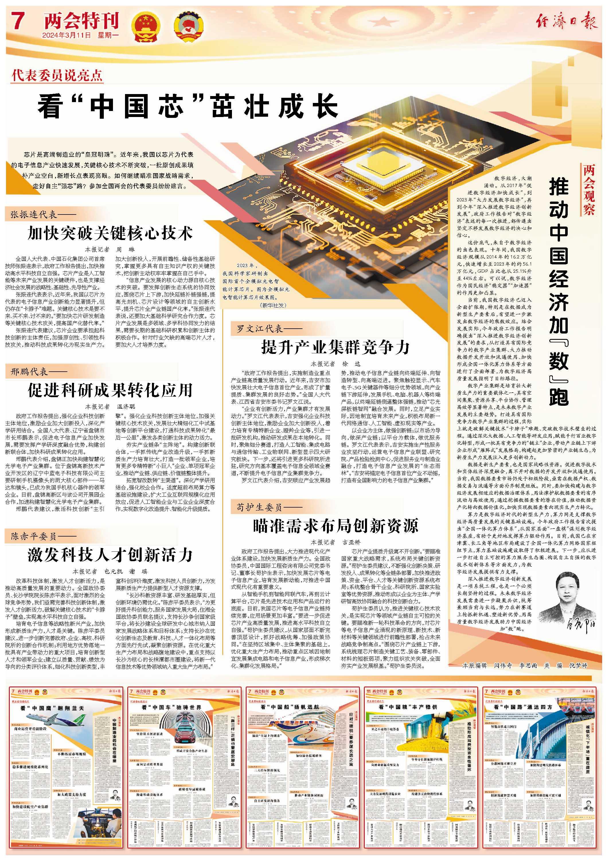 本文刊发于《经济日报》2024年3月11日第7版两会特刊 政府工作报告提出,大力推进现代化产业体系建设,加快发展新质生产力。全国政协委员,万搏网站党委书记、董事长苟护生表示,加快发展芯片等电子信息产业,培育发展新动能,对推进中国式现代化有重要意义。 从智能手机到智能网联汽车,再到云计算平台,芯片是先进技术应用和产品运行的底座。目前,我国芯片等电子信息产业链持续完善,应用场景更加丰富。“要进一步促进芯片产业高质量发展,推进高水平科技自立自强。”苟护生委员建议,从国家层面不断完善顶层设计,抓好战略统筹、加强政策协同。“在坚持区域集中、主体集聚的基础上,优化重大生产力布局,推动重点区域因地制宜发展集成电路和电子信息产业,形成梯次化、集群化发展格局。” 芯片产业提质升级离不开创新。“要瞄准国家重大战略需求,系统布局关键创新资源。”苟护生委员建议,不断强化创新决策、研发投入、成果转化等全链条部署,加快推进政策、资金、平台、人才等关键创新资源系统布局;系统整合骨干企业、科研院所、国家实验室等优势资源,推动形成以企业为主体、产学研智高效协同融合的科技创新合力。 苟护生委员认为,推进关键核心技术攻关,是实现芯片等领域产业链自主可控的关键。要瞄准新一轮科技革命的方向,对芯片等电子信息产业涌现的新原理、新技术、新材料等关键领域进行前瞻性部署,抢占未来战略竞争制高点。“围绕芯片产业链上下游,系统梳理芯片制造关键工艺、装备、零部件、材料的短板弱项,聚力组织攻关突破,全面夯实产业发展根基。”苟护生委员说。(经济日报记者 吉亚矫) | |||||
