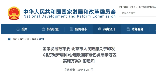 展首都绿色之翼 创全国示范之先 高质量建设国家绿色发展示范区 ——《北京城市副中心建设国家绿色发展示范区实施方案》解读 张英健 木其坚 近日,经国务院同意,国家发展改革委、北京市人民政府联合印发《北京城市副中心建设国家绿色发展示范区实施方案》(发改环资〔2024〕241号,以下简称《实施方案》),明确了北京城市副中心绿色高质量发展、打造人与自然和谐共生样板的工作路径,为北京城市副中心有序承接中心城区非首都功能疏解、推进首都城市功能重组和布局优化,建设和谐、宜居、美丽的绿色发展高地绘制了总体蓝图,对于推动北京“新两翼”建设取得更大突破,促进京津冀协同发展具有重要而深远的意义。 1、践行习近平生态文明思想是北京城市副中心建设的根本遵循 规划建设北京城市副中心,与雄安新区形成北京的“新两翼”,是以习近平同志为核心的党中央作出的重大决策部署,是千年大计、国家大事。早在2016年北京城市副中心研究部署规划阶段,习近平总书记就强调,北京城市副中心建设要牢固树立并贯彻落实创新、协调、绿色、开放、共享的发展理念,构建蓝绿交织、清新明亮、水城共融的生态城市布局,着力打造国际一流和谐宜居之都示范区,建成绿色城市、森林城市、海绵城市、智慧城市。2021年8月,国务院印发《关于支持北京城市副中心高质量发展的意见》,明确提出在北京城市副中心建设国家绿色发展示范区,坚持将绿色发展理念融入经济社会发展全过程。近年来,京津冀3省市切实履行主体责任,中央有关部门和单位大力支持配合,疏解北京非首都功能初见成效,北京城市副中心高质量发展步伐加快,“轨道上的京津冀”加速形成,北京城市副中心美丽宜居水平大幅提升,科技创新和产业融合发展水平持续提升,人民群众获得感显著增强。实践证明,党中央关于北京城市副中心的安排部署,特别是坚持将绿色发展作为城市发展底色的决策部署科学合理、顺应民心,符合我国新时代高质量发展需要。 北京城市副中心肩负着有序承接中心城区非首都功能疏解、推进首都城市功能重组和布局优化、探索人口经济密集地区优化开发模式的艰巨任务。与雄安平地建新城不同,北京城市副中心本身已有城市建设的基础,如何在既有基础上脱胎换骨、绿色升级,打造一个不一样的和谐宜居之城,关键是必须牢牢把握住习近平生态文明思想这个最核心的思想武器。《实施方案》认真贯彻党中央、国务院决策部署,时时处处践行绿水青山就是金山银山理念,牢固树立节约集约循环利用的资源观,以实现碳达峰碳中和目标为引领,将绿色发展理念融入北京城市副中心经济社会发展各领域全过程,协同推进降碳、减污、扩绿、增长,擘画了北京城市副中心的发展蓝图,描绘了青山常在、绿水长流、空气常新的美丽画卷,印发后必将成为北京城市副中心绿色高质量发展的重要指南。 2、做好北京城市副中心绿色发展六篇示范文章 北京城市副中心建设国家绿色发展示范区,不是戴帽子、做盆景,是要真正解题破题,探索既有建成区绿色低碳升级的可行路径,从而为首都乃至全国各个地区提供可推广、可复制的经验。《实施方案》明确,将聚焦建筑、交通、产业三大关键领域和能源、生态、文化三大重点支撑开展绿色示范,统筹产业结构调整、污染治理、生态保护、应对气候变化,协同推进降碳、减污、扩绿、增长,推动北京城市副中心经济社会各方面和全过程绿色低碳发展。绿色建筑示范方面,统筹考虑新建建筑建造、既有建筑改造和智能建造应用,推进实施工程建设全过程绿色建造,大力推行绿色建筑和超低能耗建筑,加大智能建造应用力度,推动建筑领域全过程节约资源和减少碳排放,实现建筑领域绿色化、品质化发展和数字化、智能化升级。绿色交通示范方面,建设高效绿色的轨道交通,完善生态友好的道路交通,推进绿色智能交通管理,推动区域绿色低碳交通一体化,构建承载辐射功能突出、便捷畅达、人本生态的现代综合交通体系,为北京城市副中心与河北省三河市、大厂回族自治县、香河县一体化高质量发展提供重要支撑。绿色产业示范方面,推进数字化智能化绿色化融合发展,着力提升产业绿色化发展水平,强化绿色金融商务服务功能,推进文化旅游商务融合发展,加强绿色产业国际国内交流与合作,在落实碳达峰碳中和目标任务过程中锻造新的产业竞争优势。绿色能源示范方面,完善能源消耗强度和总量调控,全面提升能源利用效率,大力发展可再生能源和余热利用,积极拓展绿色电力应用,大力推广应用先进能源技术,全面建立安全可靠、绿色低碳的能源体系。绿色生态示范方面,建设水城共融的生态城市,建成蓝绿交织的森林空间,持续抓好空气污染治理,加强噪声污染综合防治,加强韧性城市建设,加强跨区域生态环境共治,形成清新美丽宜居的绿色空间格局。绿色文化示范方面,广泛宣传生态文明理念,倡导简约适度生活方式,推动普及绿色发展教育,积极营造绿色文化氛围,让绿色发展理念和生态文化深入人心。 3、目标清晰、有的放矢是《实施方案》的突出特点 习近平总书记多次强调“一分部署,九分落实”。一切规划方案的生命力都在于实施,必须有清晰的工作目标和务实的落地举措,充分调动各方面的积极性、主动性和创造性,从而形