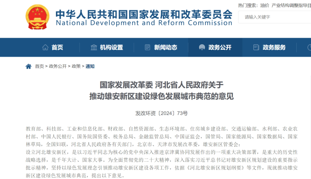 千年大计绿色为本 打造绿色发展新高地和城市建设新标杆 ——《关于推动雄安新区建设绿色发展城市典范的意见》解读 张英健 木其坚 近日,国家发展改革委、河北省人民政府联合印发《关于推动雄安新区建设绿色发展城市典范的意见》(发改环资〔2024〕73号,以下简称《意见》)。《意见》深入贯彻落实习近平总书记对雄安新区规划建设的重要指示批示精神,坚持以绿色发展理念引领推动雄安新区建设各项工作,为雄安新区绿色高质量发展明确了方向路径,也为全国绿色高质量发展提供了生动实践和鲜活样本,具有非常重要的意义。 一、绿色是建设雄安新区的鲜明底色 河北雄安新区的设立,是千年大计、国家大事。习近平总书记从谋划选址到规划建设,亲自决策、亲自部署、亲自推动,倾注大量心血,为雄安新区规划建设领航指路、把脉定向。从谋划设立之初,习近平总书记就强调要坚持生态优先、绿色发展,划定开发边界和生态红线,实现两线合一,着力建设绿色、森林、智慧、水城一体的新区。2017年,雄安新区在规划阶段即围绕绿色发展专门设置了绿色生态发展指标体系、清洁能源利用、资源环境承载力、大气环境综合治理、绿色建筑标准等10余项专题,这充分体现了雄安新区在规划之初就厚植了“绿色基因”。2023年,习近平总书记主持召开高标准高质量推进雄安新区建设座谈会并发表重要讲话,强调要贯彻绿水青山就是金山银山的理念,坚持绿色化、低碳化发展,把雄安新区建设成为绿色发展城市典范。 《意见》深入贯彻习近平总书记这一重要指示要求,提出要充分发挥雄安新区平地建新城的优势,强化顶层设计,注重统筹协调,高标准高质量推进雄安新区城市建设与生态文明建设,积极稳妥推进碳达峰碳中和,加快形成雄安新区绿色低碳发展的空间格局、产业结构、生产方式、生活方式,持续巩固生态环境治理成效,全面提升生态安全和绿色发展水平,建设人与自然和谐共生的绿色发展城市典范,树立新时代美丽中国雄安样板。应当说,《意见》绘制了一幅绿色雄安、美丽雄安画卷。 二、分阶段绘就绿色发展城市典范建设蓝图 雄安新区肩负着打造高质量发展全国样板的历史重任。雄安新区围绕高水平社会主义现代化城市建设目标,坚持把绿色作为城市建设的底色,完善生态功能,拓展蓝绿空间,推广低碳模式,建设数字城市,打造新时代绿色发展新标杆。短短6年里,雄安新区从无到有、从蓝图到实景,一座高水平现代化城市正在拔地而起,堪称奇迹。一系列设计之初的绿色设想也正在变为现实,如雄安自贸试验区交流展示中心等充分利用建筑光伏一体化和地源热泵技术,实现建筑电力能源的自给自足,一批高品质的绿色学校、绿色医院、绿色办公、绿色住宅、绿色工业建筑等示范场景在近几年也都逐步成型。下一阶段,高标准高水平建设雄安新区,也必须要牢牢把握党中央关于雄安新区的功能定位、使命任务和原则要求,提高政治站位,保持历史耐心,处理好近期目标和中远期目标、城市建设速度和人口聚集规模、产业转移和产业升级、政府和市场、承接北京非首都功能疏解和城市自身发展、城市建设和周边乡村振兴等重大关系,确保雄安新区建设和发展的正确方向。 《意见》坚持把绿色作为高质量发展的普遍形态,坚持生态优先、绿色发展,科学提出了雄安新区建设绿色发展城市典范近、中、远期建设目标。近期目标注重夯实雄安新区绿色发展基础。这一时期的工作重点主要是生态空间格局的构建,到2030年“一淀、三带、九片、多廊”的生态空间格局将初步构建,城淀共生共荣的风貌基本形成。中期目标更加注重绿色软实力的构建。这一时期聚焦绿色产业、环境质量、生态宜居的全面提升,到2035年城市绿化、环境质量、蓝绿空间都得到根本改善和显著提升,绿色低碳现代产业格局初步确立,能效、碳排放等指标达到国内领先水平,成为绿色发展新高地和城市建设新标杆。远期目标旨在把雄安新区全面建成高质量高水平的社会主义现代化城市。届时雄安将成为京津冀世界级城市群的重要组成部分,各项绿色生态类指标达到国际领先水平,环境优美生态宜居成为雄安新区显著标识,为绿色高质量发展树立全国样板。 三、全方位打造绿色发展城市典范 《意见》明确了建设绿色发展城市典范的重要内容、实现路径和重点任务,树立9个典范,打造绿色高质量发展样板。生态空间方面,强调打造蓝绿交织、清新明亮的城市生态空间,塑造绿色低碳、健康舒适的宜居生活环境,树立宜居宜业城市典范。现代产业方面,强调构建绿色低碳产业体系,推行绿色低碳循环生产方式,树立绿色经济城市典范。能源方面,大力发展绿色能源,构建新型电力系统,打造低碳安全能源体系,树立绿色能源城市典范。交通方面,健全绿色交通网络设施,提升绿色交通管理水平,构建低碳智能交通网络,树立绿色交通城市典范。建筑方面,全面推进建筑绿色低碳发展,推广绿色建造方式,强化建筑运行节能降碳管理,提升建筑领域节能降碳水平,树立绿色建筑城市典范。环境治理方面,持续推进白洋淀生态修复,健全完善环境基础设施,持续推进环境综合治理,提升环境保护治理成效,树立优美环境城市典范。绿色文化方面,强化生态文明宣传教育,倡导绿色低碳生活方式,强化生态文明意识培