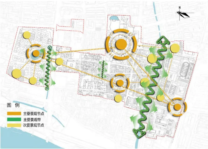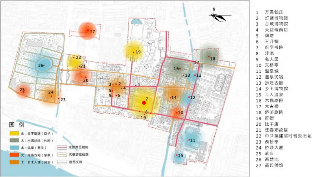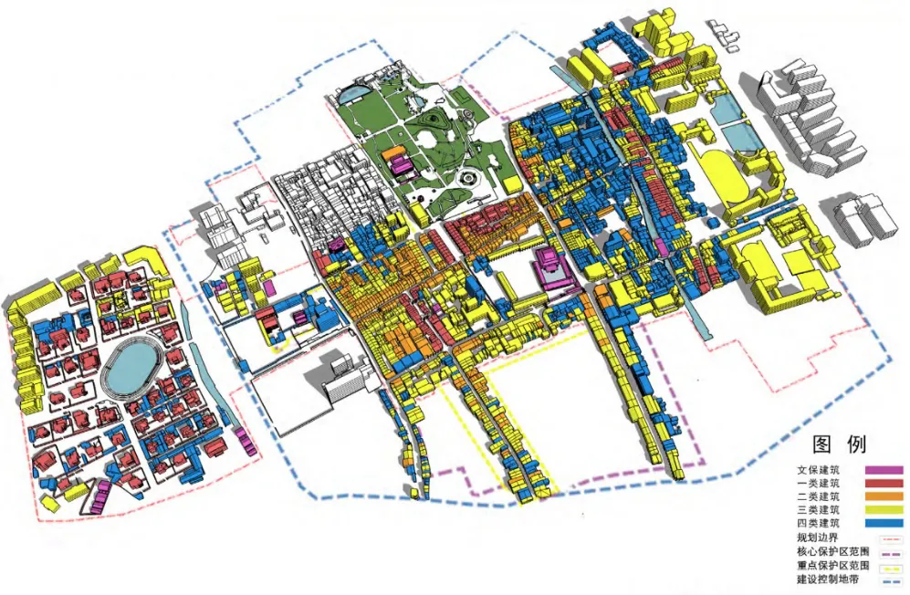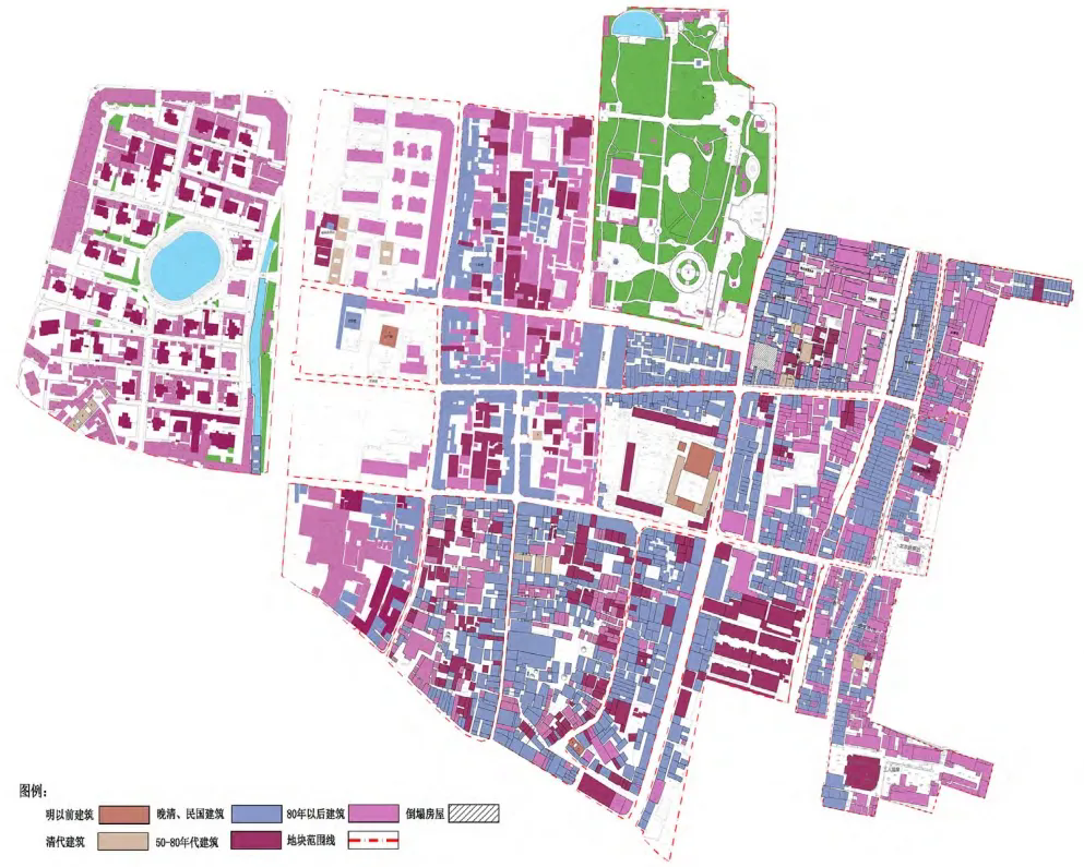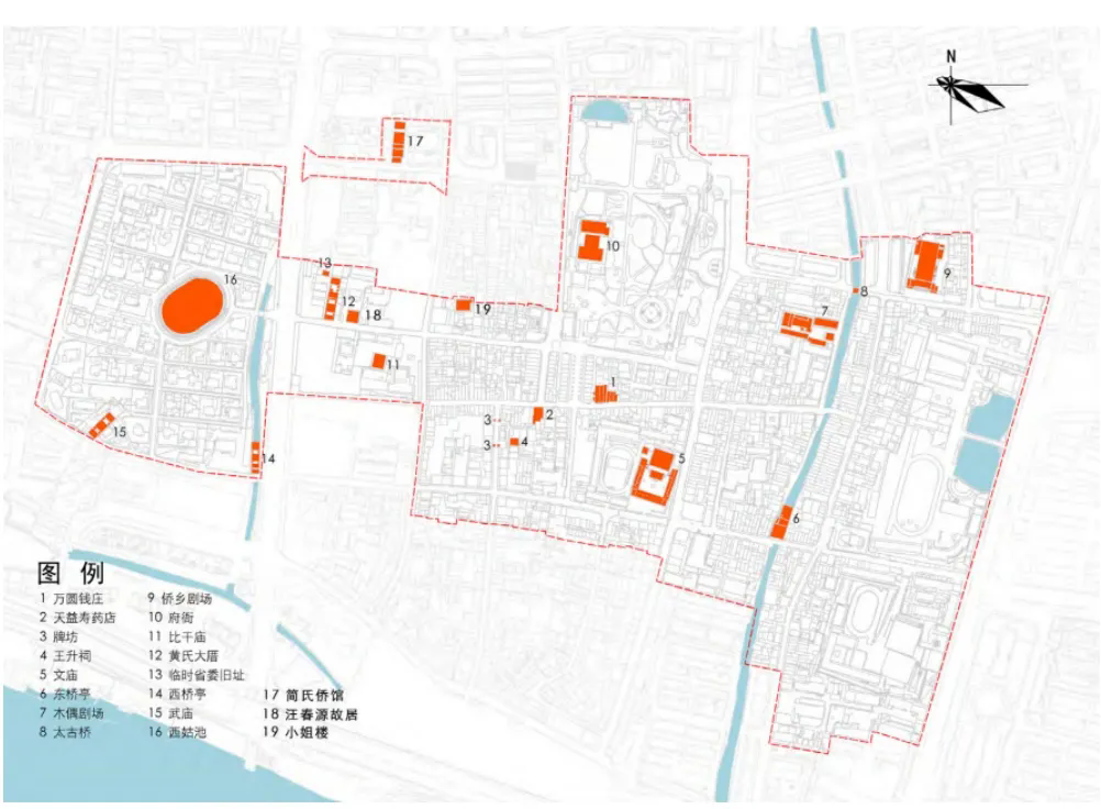 文化传承视角下的漳州古城保护与更新策略研究 张健 摘要:历史古城承载着中华民族的血脉和记忆,具有极大的保护价值。如何在保持古城风貌的同时进行合理更新改造,是一项值得深究的重要课题。本文基于文化传承的视角,以漳州古城为例,分别从建筑风貌、文化底蕴、公共空间、街巷肌理、生活气息五个方面分析了漳州古城的文化特色及保护现状,并以突出漳州古城“闽南风、漳州味、宋河韵、老街情、慢生活”的地域文化特征为目标,分别提出打造闽南名片、延续文化脉络、重现宋河古韵、恢复街巷肌理、保留生活气息的古城保护与更新策略。 关键词:古城;保护更新;文化传承;漳州 一、研究背景 近年来,我国一直处于城镇化飞速发展的阶段,城市经济水平逐渐提高。但同时,快速城镇化导致城市呈现“粗放式”发展的局面[1],使得城市无秩序地蔓延和扩张,从而导致了一系列复杂的城市问题。长久以来,城市的发展过于追求经济效益和价值,而忽视了对于空间品质提升的需求,这也就导致了城市内部很多特色区域、历史地段因违背了经济利益而被侵蚀、被破坏,甚至逐渐走向衰亡,城市失去了原有的文脉和特色。 历史文化街区作为一个城市联结历史与未来的纽带,承载着中华民族刻在基因里的传承和血脉,从某种程度上来说,是一个城市生命的延续。历史文化街区不应该作为一个 城市发展的牺牲品被湮没在历史长河中,而应该作为一个城市对外展示的名片被人们所记住。历史风貌弥足珍贵、历史街区不可再生[2],若想要延续历史文化街区的精神和记忆,必须采取适宜的手段对其进行适度开发与更新,以在发展与保护之间求得平衡[3],实现“在保护中发展,在发展中保护”[4]。历史文化街区传承的文化是其最重要的底色,对于历史文化街区的保护可以考虑活化更新的方式,在保证文化记忆传承的同时适当注入新鲜血液,在最大限度地保存建筑风貌、保护街巷肌理的同时,重塑场所精神,实现真正的可持续发展。 本文以位于历史文化名城漳州市最重要的历史文化街区漳州古城为研究对象,在分析其文化特色及保护现状的基础上,从文化传承的角度探讨了漳州古城保护与更新的策略。 二、研究区域概况 漳州古城位于“海滨邹鲁”之一的福建省漳州市中心区,是漳州市最具保护价值的片区。漳州古城始建于唐垂拱二年[5],拥有一千三百余年的悠久历史,有“唐宋古城、明清街区、民国风貌、闽南韵味、侨台同辉”之美传[6]。漳州古城历经沧桑,始终保留着其独特、鲜明的人文气息和民俗风情,文化旅游资源极为丰富。 本文基于文化传承的视角,探讨如何在最大限度保留漳州古城文化风貌的同时活化古城、留住乡愁,突出漳州古城“闽南风、漳州味、宋河韵、老街情、慢生活”的地域文化特征,提出最适宜漳州古城的保护更新发展策略,实现漳州古城的活力重构和有机更新。 三、漳州古城文化特色及保护现状 漳州古城建筑风貌完好、文化底蕴深厚、公共空间多样、街巷肌理独特、生活气息浓厚,既保留独特的历史人文底蕴,又延续着传统生活方式,文化特色鲜明,具有极高的保护价值。 (一)建筑风貌完好 漳州古城文物古迹众多,核心保护区建筑以晚清、民国时期为主(图1),不乏比干庙、文庙等宋代及明代具有浓厚历史风味的建筑。同时,古城内部留存着许多名人旧居及知名场所(图2),这些建筑见证了漳州多年来的历史变迁和文化发展,是连接历史与未来的通道,也是传承文化记忆的媒介。 图1 漳州古城现状建筑年代分析 图2 漳州古城名人旧居和知名场所分布示意图 对现状历史建筑的建筑风貌、建筑质量、历史意义等因素进行评估,将建筑分为文保建筑、一类建筑、二类建筑、三类建筑、四类建筑五类。其中,文保建筑为极具历史价值、意义重大的建筑;一类建筑为风貌完好、质量上佳的建筑;二类建筑为风貌尚可、质量稍差的建筑;三类建筑为风貌较差、质量不佳的建筑;四类建筑为风貌极差、质量极差的建筑。可以看到,古城中心区内历史建筑整体保存较好,外围区域保存较差,可有针对性地进行建筑风貌恢复、整理工作。 图3 漳州古城历史建筑风貌评估 (二)文化底蕴深厚 漳州古城文化底蕴深厚,始建于宋代的府学,在历史上为国家培养了一批又一批的人才;侨乡剧场荟萃了闽南风情与漳州特色,更凸显出独具魅力的漳州风味;木偶剧场拥有精湛的制作工艺与极具历史气息的表演,传承着“源于晋、兴于宋、盛于明”的布袋戏。同时,古城内儒家文化、道教文化、民间先祖信仰文化并存。这些文化是古城居民重要的精神寄托,维系着他们的精神家园。 在规划中,我们除了要保护有形的建筑、街巷等空间外,更要保护好空间中蕴藏着的无形的文化。将文化作为触媒点激活漳州老城,吸引更多客流。 (三)公共空间多样 古城临近宋河水系,周边有山体公园、滨江公园以及小游园,开放空间类型较丰富(图4)。目前只有中山公园的1公里服务范围全覆盖了古城规划地区,基本满足“500米见绿、1000米达园”的绿地布局要求,和构建“园在城中、城在园中、城园一体、园城共融”的现代田园型都市的目标。 图4 漳州古城公共空间分布 但是,古城内部的开放空间不足,应在不破坏古城肌理的前提下,采取见缝插绿、立体绿化等方式,营造适当的小型交往空间,满足古城居民平