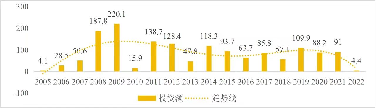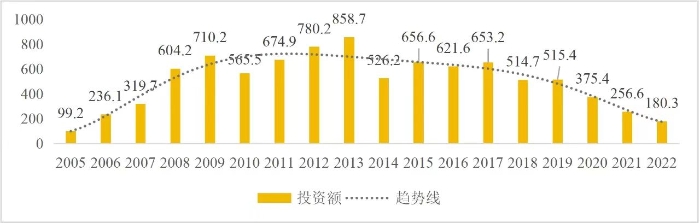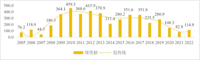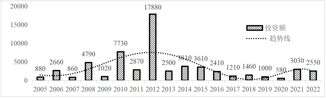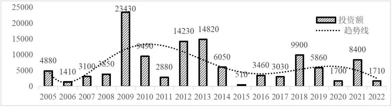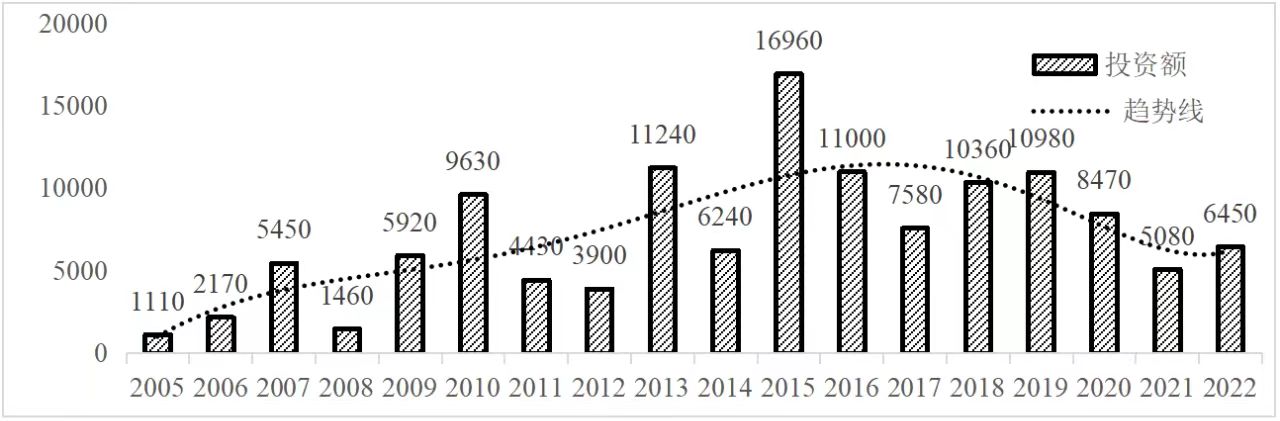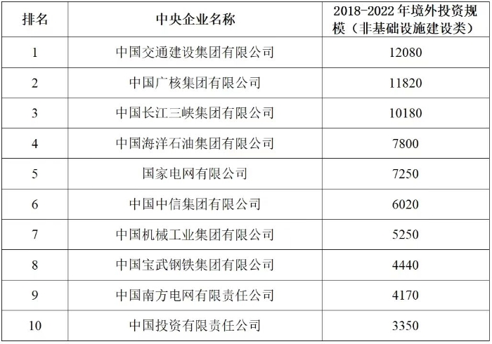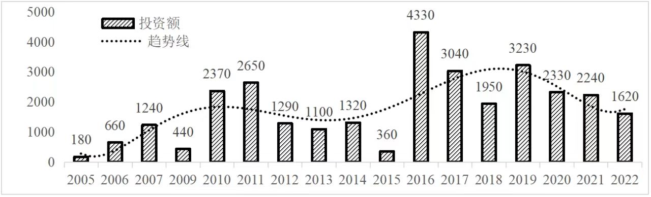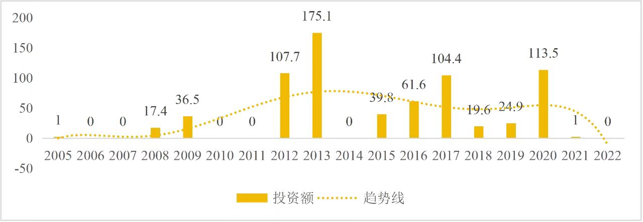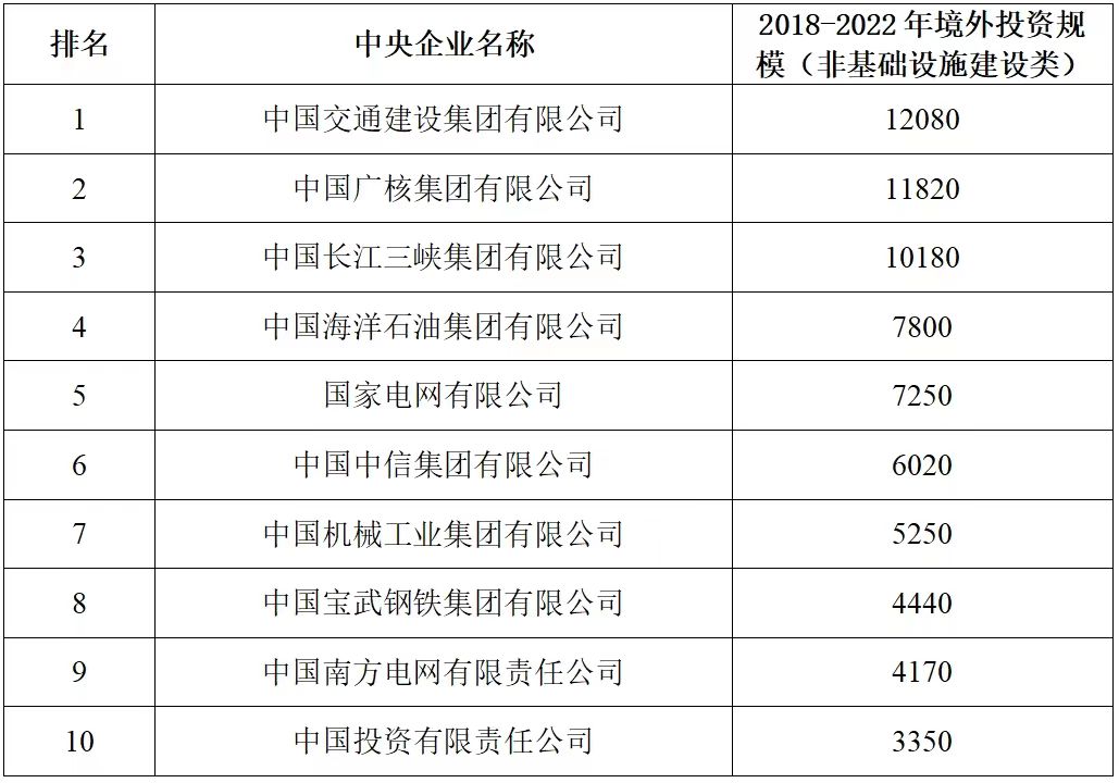 企业境外投资研究之二: 中央企业境外投资情况 杨凯越 编者按:根据商务部2023年10月发布的我国对外直接投资统计数据,截至2022年,我国对外直接投资存量达27548.1亿美元,当年对外直接投资规模达1631.2亿美元,居世界第二位。截至2022年底,中国2.9万家境内投资者共设立境外企业4.66万家,分布在全球190个国家(地区),年末境外企业资产总额8.4万亿美元。随着“双循环”战略、“走出去”战略和“一带一路”倡议的深入推进实施,对企业境外投资开展系统研究,探索如何更高质量地开展境外投资,成为当前一项重要和紧迫的任务。本公众号将企业境外投资研究成果以系列文章的形式陆续刊发,本文是研究报告的第二部分,供业界同仁参考。 一、总体情况 中央企业2013-2019年境外投资年均增速约15%,营业收入增速保持在约4.5%。根据国务院国资委和社科院联合发布的《中央企业海外社会责任蓝皮书(2020)》,中央企业在境外投资发展时,7%投资第一产业,69%参与第二产业,40%发展第三产业。截至2019年底,中央企业境外资产总额8.1万亿元、所有者权益2.3万亿元。其中,81家中央企业在“一带一路”沿线承担项目数量逾3400个。中央企业承担“一带一路”基础设施项目数比率超过60%,合同投资额超过80%。 近年来,中央企业境外投资及运营总体仍呈现较为平稳的态势。中央企业2013-2020年境外营业收入总规模逾24万亿元,利润总规模约6000亿元。2021年,中央企业和单位对外非金融类直接投资642.9亿美元,占我国对外直接投资比重约36.0%,同比增长30.7%,逾60%来自收益再投资。根据国务院国资委《中央企业海外发展报告(2023)》,截至2022年底,中央企业境外投资机构和项目逾8000个,境外员工125万人,境外资产总额近8万亿元(比2019年略有下降),当年境外投资规模3739亿元。 表1 中央企业境外投资规模 单位:亿美元 数据来源:商务部2016-2021年度中国对外直接投资统计公报。 本文根据中国全球投资追踪(China Global Investment Tracker,CGIT)数据库,按照国务院国资委2023年中央企业名录,对我国中央企业境外投资情况进行了整理。因数据口径不同,中央企业境外投资规模与前述商务部统计数据有所差异。根据CGIT数据,中央企业境外投资在2013年达到峰值858.7亿美元,此后呈下降趋势,2022年境外投资规模仅180.3亿美元。 数据来源:CGIT数据库,作者整理。 图1 2005-2022年中央企业境外投资规模 单位:亿美元 根据CGIT数据库,中央企业2005-2022年各行业境外投资情况见图2。其中,能源类境外投资规模最高,为4460.1亿美元;建筑工程类(包括铁路、公路等交通基础设施建设类)境外投资规模其次,为1534亿美元;金属类(含矿产)境外投资排名第三为972.5亿美元;公用事业类境外投资规模第四,为702.5亿美元;此外,中央企业境外投资涉及领域还包括旅游、健康、金融、科技、农业、化工、物流、娱乐等。2018-2022年各行业境外投资情况见图3。 数据来源:CGIT数据库,作者整理。 图2 2005-2022年中央企业分行业境外投资规模 单位:亿美元 数据来源:CGIT数据库,作者整理。 图3 2018-2022年中央企业分行业境外投资规模 单位:百万美元 二、分行业情况 本文对2005年1月-2022年12月我国中央企业境外投资选取能源行业、建筑工程行业、金属行业、公用事业、旅游业等投资规模位居前列的行业,分行业情况进行了整理。 (一)能源行业 2005-2022年中央企业能源行业境外投资情况见图4。分析发现,我国中央企业能源行业境外投资在2010年达到峰值后呈逐年下降的趋势。 数据来源:CGIT数据库,作者整理。 图4 能源行业2005-2022年中央企业境外投资规模 单位:亿美元 (二)建筑工程行业 2005-2022年中央企业建筑工程行业境外投资情况见图5。分析发现,建筑工程行业境外投资在2009年达到峰值,此后呈逐年下降。 数据来源:CGIT数据库,作者整理。 图5 建筑工程行业2005-2022年中央企业境外投资规模 单位:亿美元 (三)金属行业 2005-2022年中央企业金属行业境外投资情况见图6。分析发现,金属行业2007年达到投资峰值,此后逐年下降。 数据来源:CGIT数据库,作者整理。 图6 金属业2005-2022年中央企业境外投资规模 单位:亿美元 (四)公用事业 2005-2022年中央企业公用事业境外投资情况见图7。分析发现,公用事业2013年达峰后,整体呈下降趋势。 数据来源:CGIT数据库,作者整理。 图7 公共事业2005-2022年中央企业境外投资规模 单位:亿美元 (五)旅游业 2005-2022年中央企业旅游业境外投资情况见图8。分析发现,旅游业在2014-2019年间整体呈现较为平稳的对外投资规模,2019年后暂无相关对外投资。 数据来源:CGIT数据库,作者整理。 图8 旅游业2005-2022年中央企业境外投资规模 单位:亿美元 三、企业个体情况 (一)概述 本文对2018年1月-2022年12月我国中央企业境外投资的非基础设施类和基础设施类投资分别进行了统计,表2和表3分别列出了非基建和基建类境外投资规模居于前10的企业。近5年来,我国中央企业非基础设施建设类境外投资规模排名前5的企业分别为中国交通建设集团有限万搏网站(以下简称中交集团)、中国广核集团有限万搏网站(以下简称中广核集团)、中国长江三峡集团有限万搏网站(以下简称三峡集团)、中国海洋石油集团有限万搏网站(以下简称中国海油)和国家电网有限万搏网站(以下简称国家电网),投资额分别为120.8亿美元、118.2亿美元、101.8亿美元、78亿美元和72.5亿美元。 表2 近几年中央