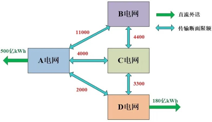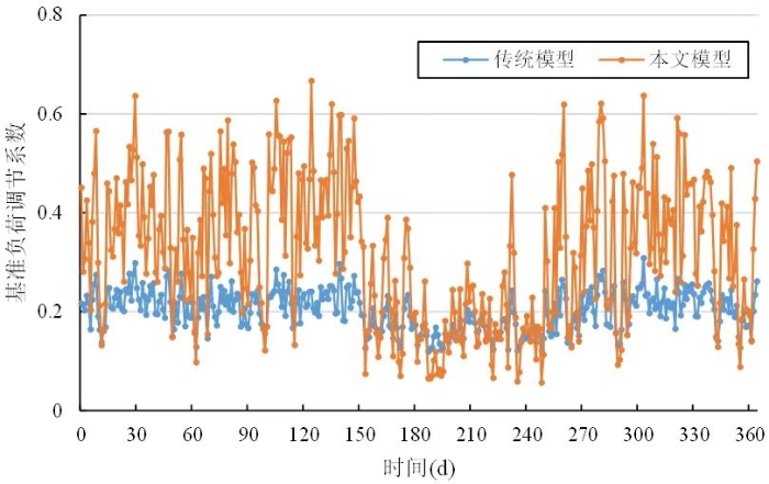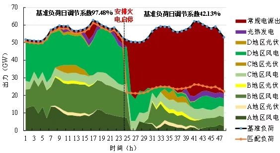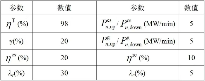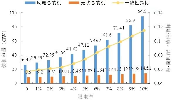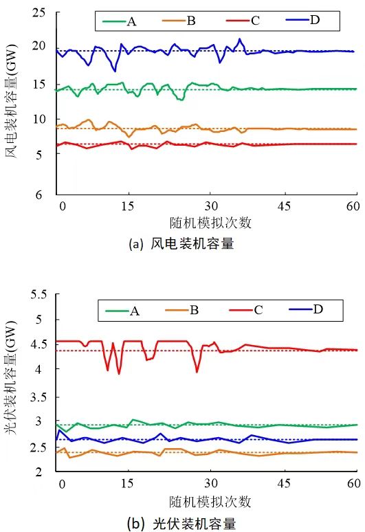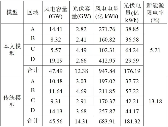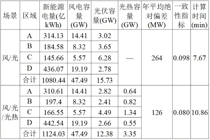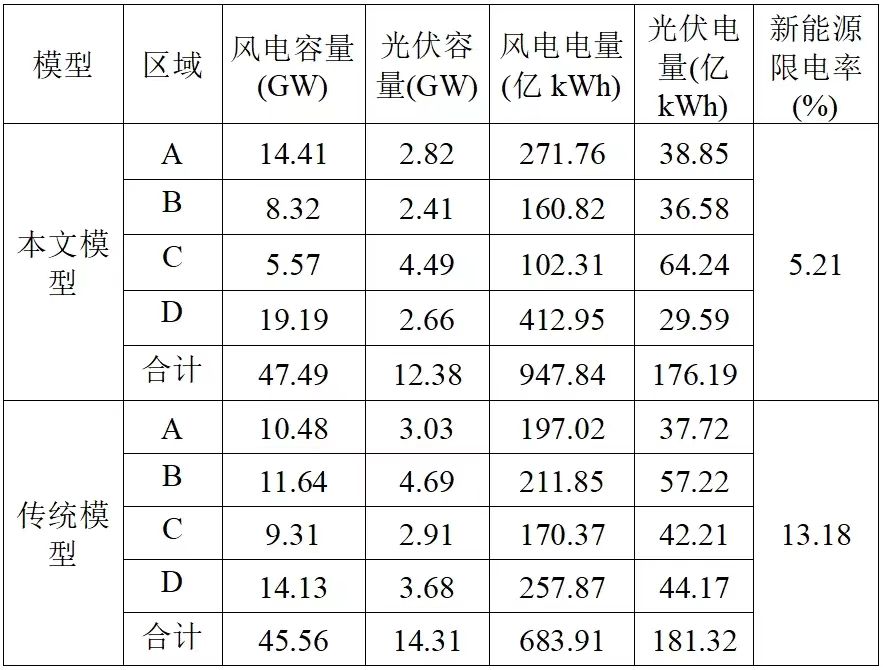 四、算例分析 (一)算例介绍 为验证所提计及源-荷匹配的新能源优化布局方法的正确性,本节以我国北方某相邻四个(省级)地区电网为测试系统,研究2030年的新能源规划布局问题。四个地区分布于总面积125万平方公里范围内,新能源渗透率达到30%以上。电网结构图如图3所示,A、C电网均分别与其他电网相连,图中红色数字表示各区域间联络线限值(单位:MW),绿色数字为直流外送年电量(单位:亿kWh)。算例计算步长为1小时,源-荷匹配周期设为1天,即24h。计算时段数8760h,其余主要算例参数见表1。本文中规划水平年的风电、光伏序列是基于该地区历史出力序列进行新能源出力场景生成得到的,负荷序列是立足这些地区2021年的实际负荷需求序列,假设负荷年增长率为5%估计得到的。 图3 测试系统等效结构示意图 表1 算例参数 (二)不同规划模型结果分析 为了验证所提模型可深入挖掘新能源出力互补性,本节对比了本文模型和传统模型的规划结果。其中传统新模型中不考虑源-荷匹配均衡约束。设置两个仿真案例中光热接入容量均为3.35GW,风电和光伏总装机为59.87GW,所得结果如表2所示。 可以看出,对比传统方法,考虑源-荷匹配后,本文模型所得D地区风电和C地区光伏最优布局容量分别增长了35.81%和54.3%。从风电和光伏总装机方面看,本文模型所得风电总容量较传统方法高4.24%,这表明考虑源-荷匹配后,系统更倾向于配置互补性更好的风电,光伏由于出力形状较为固定,容量越大越难以实现源-荷匹配。此外,在新能源总装机一致的情况下,本文模型得到的新能源年度总出力电量为1124.03亿kWh,而传统模型所得新能源年度总出力电量为865.23亿kWh,前者相较后者提升29.91%,即考虑源-荷匹配可使新能源渗透率从28.51%增加至37.04%。从新能源限电方面看,考虑源-荷匹配可使新能源总限电率从传统模型的23.18%降低至本文模型的5.21%。可以看出,在同样的装机总容量下,考虑源-荷匹配可以充分提升新能源消纳能力,减少弃风、弃光情况。 表2 不同模型规划结果 图4 不同模型的年度基准负荷调节系数 图4显示的是求解两种模型所得的年度基准负荷调节系数,该参数描述的是每个匹配周期内新能源总出力占基准负荷的比例,其数值越高,说明新能源出力在系统总出力中占比越高。可以看出,本文模型中年度基准负荷调节系数变化范围为0-0.7,平均值为0.32;传统模型的年度基准负荷调节系数变化范围为0.1-0.3,平均值为0.2。本文模型所得基准负荷调节系数更高,有利于提升新能源消纳水平。 综上可得,采用本文方法考虑源-荷匹配均衡约束可以深入挖掘新能源出力互补性,有利于提升新能源消纳水平,促进新能源产业健康发展。 (三)灵活性新能源电源接入对规划结果的影响 为了研究灵活性新能源电源接入系统对多区域新能源优化规划布局的影响,本节设置风/光组合和风/光/光热组合两类场景,分别计算两类场景下的多能源电力系统容量规划结果。令风/光组合光伏装机容量与风/光/光热组合光伏与光热总装机容量相等。其余约束条件和计算边界均一致。计算结果如表3所示。 表3 不同场景下的规划结果 可以看出,在新能源总装机容量一定下,风/光/光热组合的源-荷匹配一致性指标为0.080,而风/光组合的源-荷匹配一致性指标为0.098。由该指标定义可知,越小,说明在该时段内新能源出力与负荷功率变化趋势越接近,源-荷匹配程度越高。此外,风/光/光热组合的新能源出力与负荷波动形状的年度平均绝对偏差与风/光组合相比降低52.27%,新能源基本不增加电网调峰难度,同时风/光/光热组合的新能源总发电量比风/光组合高4.03%,因此可得出结论:灵活性新能源电源的接入对提高源-荷匹配具有积极作用。 图5 不同场景下源-荷匹配效果 图5所示为两种场景下新能源出力与负荷匹配效果对比,图中同色系深色表示匹配偏差最大日结果,浅色表示匹配偏差最小日结果。当新能源总装机容量一定时,从匹配效果方面看,四个地区的风/光组合和风/光/光热组合均可以在一定程度上实现新能源总出力与负荷形状的优化匹配,可大幅降低电网的调峰难度。风/光组合的匹配效果不及风/光/光热组合,这说明灵活电源的接入有利于源-荷匹配互补。从匹配偏差方面看,风/光组合匹配偏差最小日的新能源出力非常低,说明仅靠风电和光伏很难完全匹配负荷波动。风/光/光热组合匹配偏差最小日的新能源出力有所提高,光热接入后,新能源出力与负荷匹配偏差更小,最优可达到匹配偏差为0的效果,即使是全年匹配偏差最大日,最大新能源功率缺额也未超过5GW,也验证了灵活性新能源电源CSP电站可有效提升新能源出力互补能力。 (四)新能源限电率对规划结果的影响 为了研究新能源限电率对多区域新能源优化规划布局和源-荷匹配效果的影响,本节给定CSP电站发电容量为3.35GW、系统最大新能源限电率由0增加至10%时,计算风、光最优接入容量和源-荷匹配一致性指标的情况,结果如图6所示。 图6 不同新能源限电率下优化结果 可以看出,随着允许新能源限电率水平的增加,新能源总容量增加,相比于缓慢增加的光伏容量,风电容量增加趋势更大,系统优化配置的风电容量最大近乎于光伏容量的6.5倍,这主要是由两方面原因造成的:一方面,测试系统地区的风电资源利用小时数高于光伏资源,系统优先接纳风电;另一方面,由于光伏出力具有典型的“昼发夜