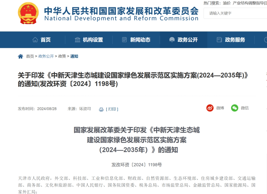 发挥中新合作平台优势 高标准高质量建设国家绿色发展示范区 ——《中新天津生态城建设国家绿色发展示范区实施方案(2024—2035年)》解读 朱黎阳 范莹莹 近日,经国务院批复同意,国家发展改革委印发《中新天津生态城建设国家绿色发展示范区实施方案(2024—2035年)》(发改环资〔2024〕1198号,以下简称《方案》),立足新形势新要求,从多个维度对下一阶段中新天津生态城(以下简称生态城)建设国家绿色发展示范区升级版的目标任务作出了全面系统部署。 01、《方案》是新征程上生态城绿色发展的施工图 2013年,生态城成为首个国家绿色发展示范区。2013年5月,习近平总书记在生态城视察时强调,“生态城要兼顾好先进性、高端化和能复制、可推广两个方面,在体现人与人、人与经济活动、人与环境和谐共存等方面作出有说服力的回答,为建设资源节约型、环境友好型社会提供示范”。十多年以来,生态城认真贯彻落实习近平总书记对天津及生态城的重要指示精神,全力推动国家绿色发展示范区建设取得丰硕成果,从盐碱荒滩蜕变成生态之城、智慧之城、幸福之城,成为生态文明建设的示范区、绿色发展体制机制的创新区和绿色思想文化的策源地。 在新征程的新起点上,《方案》提出了生态城新十年建设国家绿色发展示范区“3+20”的任务目标体系。确立了绿色发展的三项示范任务,一是要在绿色低碳产业效益上发挥先导带动作用,形成具有国际竞争优势的绿色低碳产业集群,单位地区生产总值二氧化碳排放水平保持领先;二是在绿色低碳创新能力上发挥先行引领作用,培育一批绿色低碳技术创新载体和平台,取得一批绿色低碳技术知识产权,形成绿色低碳高质量发展技术和标准支撑体系;三是在绿色低碳开放合作上发挥重要牵引作用,打造产业合作、技术转移、人才培养平台,建设绿色低碳领域国际合作重要枢纽。同时,《方案》还结合生态城发展实际,提出了20项具体指标,部分指标达到国际领先水平,比如,单位GDP二氧化碳排放量,我国的平均水平约1吨二氧化碳/万元,发达国家水平约为0.2吨二氧化碳/万元,生态城目前是0.27吨二氧化碳/万元,2035年目标值是0.2吨二氧化碳/万元以下。此外,还有一些指标也具有较强的先进性,比如,到2035年,研发经费投入强度翻倍,绿电占全社会用电量比重达到近100%。这些任务和指标不仅体现了国家对生态城未来发展的高要求,也彰显了生态城在绿色发展领域的国际视野和雄心壮志。 当前,我国已经开启全面建设社会主义现代化国家新征程,我们要建设的现代化是人与自然和谐共生的现代化,要加快经济社会发展全面绿色转型。8月11日,中共中央、国务院印发《关于加快经济社会发展全面绿色转型的意见》,提出将绿色转型的要求融入经济社会发展全局,全方位、全领域、全地域推进绿色转型,形成节约资源和保护环境的空间格局、产业结构、生产方式、生活方式。《方案》立足新形势新要求,深入贯彻党的二十大和二十届二中、三中全会精神,认真贯彻习近平生态文明思想,重新布局生态城绿色发展的目标任务,提出打造以绿色低碳高质量发展为主线、以高附加值细分产业为重点、以国际一流营商环境为特征的国家绿色发展示范区,推动绿色发展理念融入生态城经济社会发展各领域全过程,为加快经济社会发展全面绿色转型探索新路径。 02、《方案》充分发挥中新合作平台优势,建设绿色低碳开放合作的新高地 党的二十届三中全会提出,开放是中国式现代化的鲜明标识。必须坚持对外开放基本国策,坚持以开放促改革,依托我国超大规模市场优势,在扩大国际合作中提升开放能力,建设更高水平开放型经济新体制。生态城作为中国和新加坡两国政府间重大合作项目,是世界上首个国家间合作开发的生态城市。过去十多年,中新双方围绕高水平合作,探索建立了一整套全新的区域合作开发模式,形成了独具特色的合作交流渠道,最大程度发挥了双方政策、资金、资源等综合优势。在京津冀协同发展战略中,生态城、雄安新区、北京通州以三角之势起到支撑引领作用。在建设国家绿色发展示范区的过程中,生态城要充分发挥在绿色低碳开放合作上的重要牵引作用。 面向2035年,《方案》全面落实党的二十届三中全会精神,充分发挥中新合作平台优势,继续深化中新两国在绿色技术、绿色装备、绿色服务、绿色基础设施、绿色金融等方面的交流合作,导入新加坡优质绿色产业资源,持续拓展中新合作深度和广度,将生态城打造成中国面向共建“一带一路”国家开展绿色低碳技术成果交流、产业合作和经贸往来的重要窗口。一是借助新加坡国际航运枢纽、贸易中心和金融中心资源优势,依托天津港智慧近零碳码头,吸引新加坡航运、海事等企业落地。二是充分发挥高校、科研院所、龙头企业创新带动作用,加强与新加坡政府部门、科研院所、协会组织合作,积极引进绿色技术研究院、绿色创新实验室和知名投资机构等优质创新资源。三是借鉴新加坡政府部门服务企业的理念,完善相关体制机制,优化营商环境,及时解决企业在生产经营、技术研发、市场开拓中遇到的各类问题,快速导入国际国内先进绿色低碳技术和龙头企业。这不仅有助于生态城自身的发展,也为我国面向共建“一带一路”国家开展绿色低碳技术成果交流、产业合作和经贸