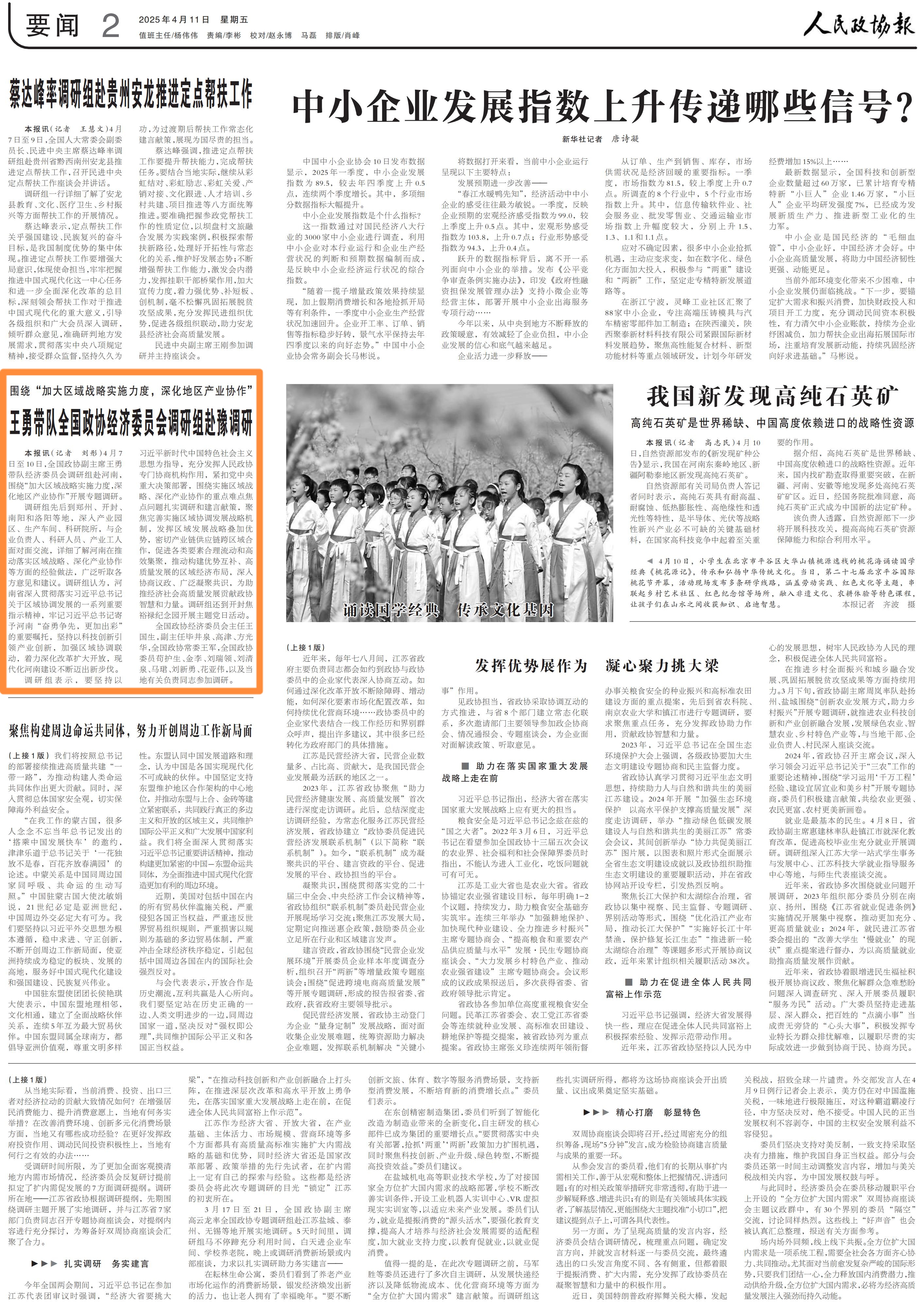本报讯(记者 刘彤)4月7日至10日,全国政协副主席王勇带队经济委员会调研组赴河南,围绕“加大区域战略实施力度,深化地区产业协作”开展专题调研。 调研组先后到郑州、开封、南阳和洛阳等地,深入产业园区、生产车间、科研院所,与企业负责人、科研人员、产业工人面对面交流,详细了解河南在推动落实区域战略、深化产业协作等方面的经验做法,广泛听取各方意见和建议。调研组认为,河南省深入贯彻落实习近平总书记关于区域协调发展的一系列重要指示精神,牢记习近平总书记寄予河南“奋勇争先,更加出彩”的重要嘱托,坚持以科技创新引领产业创新,加强区域协调联动,着力深化改革扩大开放,现代化河南建设不断迈出新步伐。 调研组表示,要坚持以习近平新时代中国特色社会主义思想为指导,充分发挥人民政协专门协商机构作用,紧扣党中央重大决策部署,围绕实施区域战略、深化产业协作的重点难点焦点问题扎实调研和建言献策,聚焦完善实施区域协调发展战略机制,发挥区域发展战略叠加优势,密切产业链供应链跨区域合作,促进各类要素合理流动和高效集聚,推动构建优势互补、高质量发展的区域经济布局,深入协商议政、广泛凝聚共识,为助推经济社会高质量发展贡献政协智慧和力量。调研组还到开封焦裕禄纪念园开展主题党日活动。 全国政协经济委员会主任王国生,副主任毕井泉、高津、方光华,全国政协常委王军,全国政协委员苟护生、金李、刘瑞领、刘清泉、马珺、刘新勇、花亚伟,以及当地有关负责同志参加调研。 | |||||