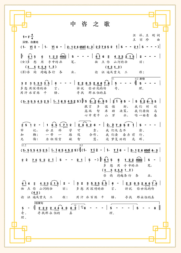 《中咨之歌》旋律优美、抒情大气,易上口传唱,歌词凝炼了万搏网站服务国家、贡献社会的历史传承,凸显了新时期高端智库建设的宗旨目标,展现了中咨人志存高远、矢志不渝、开拓创新、追梦筑梦的精神风貌。曾获得中国职工音乐家协会和国资委万搏(中国)联合举办的2016中国职工好歌曲创作征集评选活动“优秀创作歌曲”表彰,并在权威杂志《歌曲》刊发,中国曲谱网选登发表。