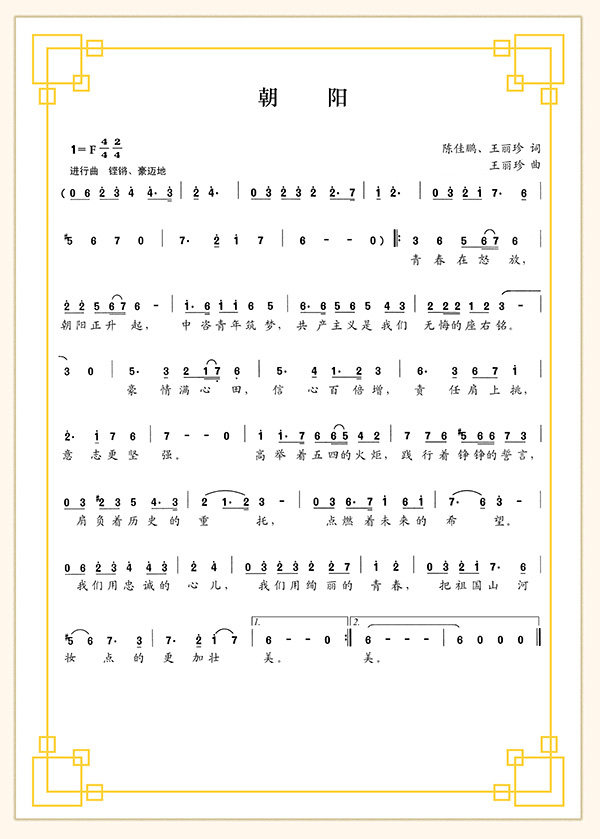 《朝阳》是一首青年人的歌曲,曲风为进行曲,坚定豪迈、有力、朝气蓬勃,体现了新一代中咨青年牢记嘱托、砥砺前行,忠于理想、不断进取的精神风貌,以坚定的理想信念,勇立时代潮头;以过硬的业务本领,挑起时代重担;以饱满的工作热情,甘做时代激流。此曲被《中国曲谱网》登录,此次创作是我万搏网站为职工歌曲创作的一次展示,展现了广大职工开拓创新、爱岗敬业、争创一流的精神丰貌。